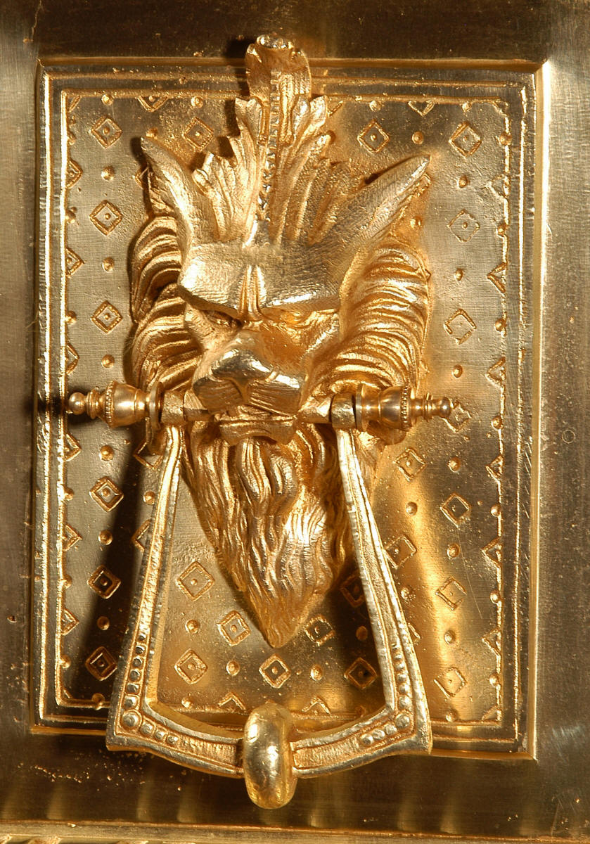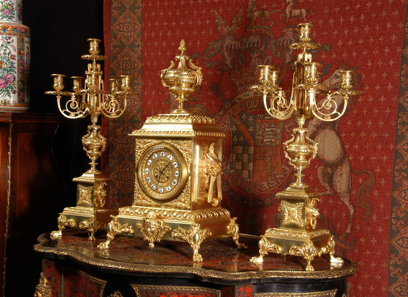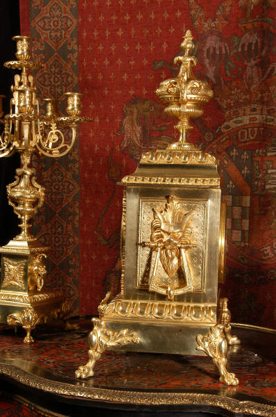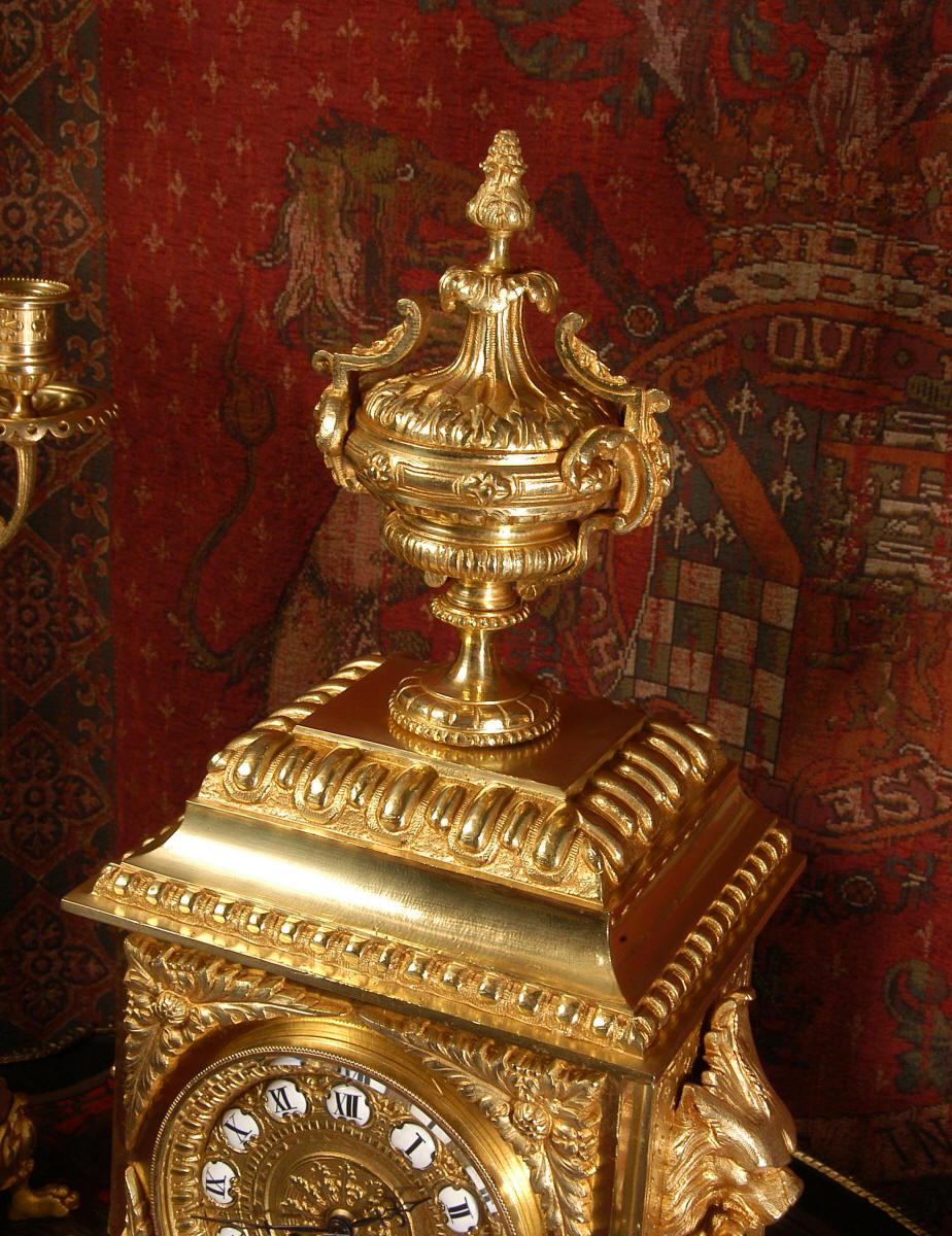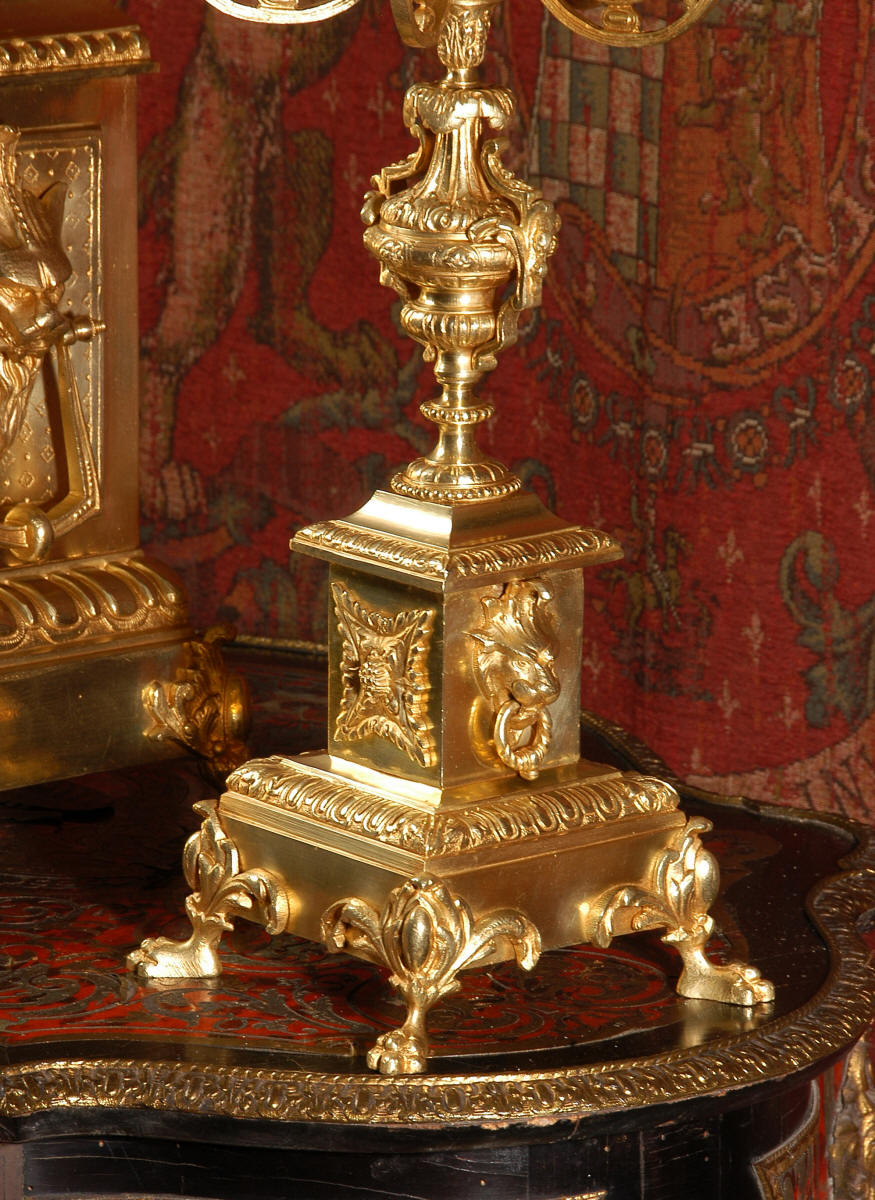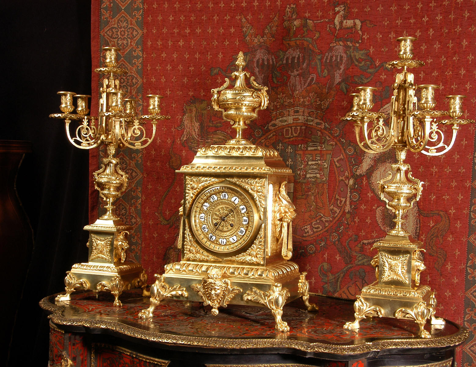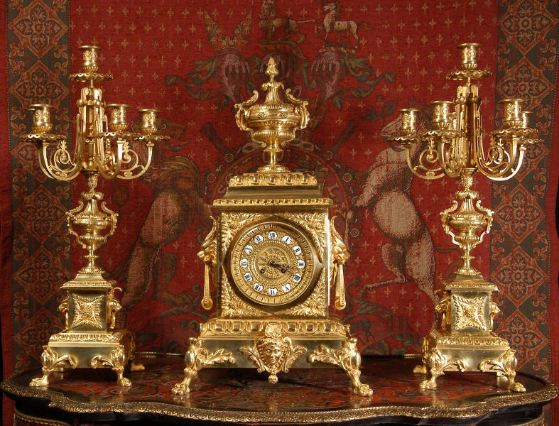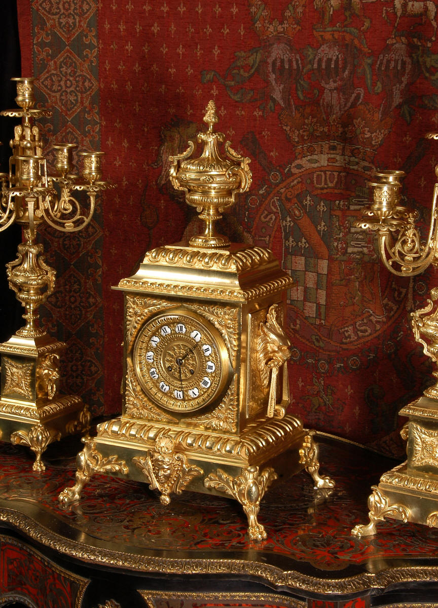 ~ French - Circa 1890 ~ ~~ Excellent condition ~~ A very finely detailed gilt brass clock in excellent condition, much of the original gilding remains which is in lovely bright and clean condition. The style is Baroque. The clock movement is held aloft by cherubim forming the front pillars. The cherubim look back at two winged lions which are tethered. The pendulum is visible swinging below the movement between the cherubim pillars, pendulum is formed as a shield with lions rampant. Above the dial is a typical Baroque broken arch. The back of the top is fretted along with the base and the clock is beautifully detailed and well finished. The dial is enamel on copper with a cast brass centre and is complete with original blued steel hands. The French movement is of very high quality and is in excellent clean and running condition having been fully serviced by our clockmaker. Pendulum is original. It runs for 8 days and strikes the hours and halves on a bell. Click the video clip below to hear the bell and watch the clock running! Condition of the case is