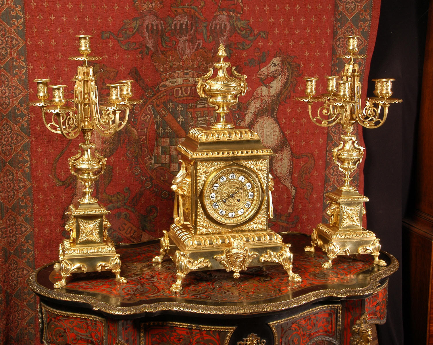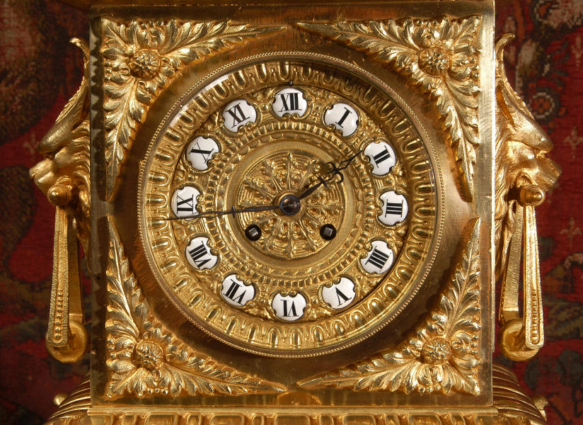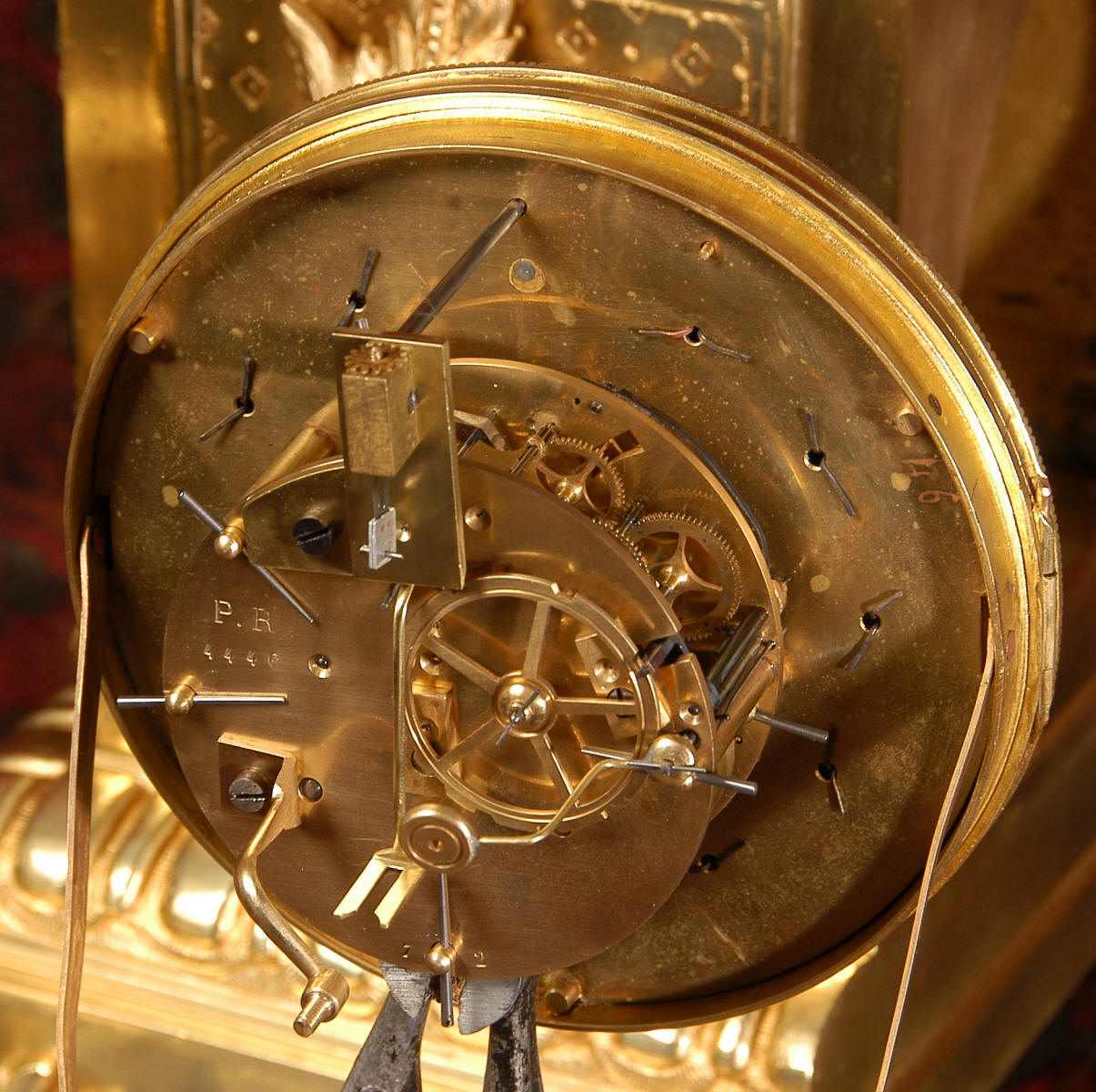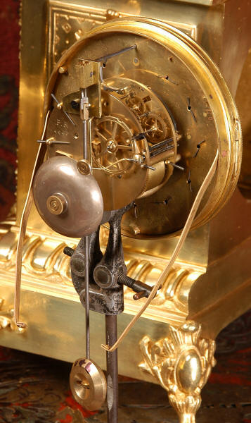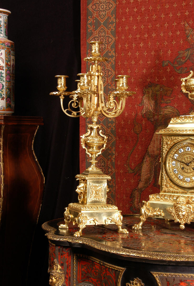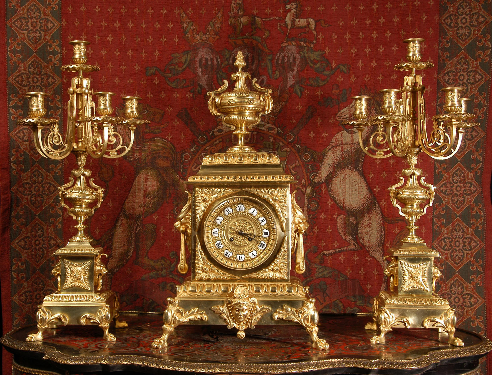 ~ French - Circa 1890 ~ ~~ Excellent condition ~~ A very finely detailed gilt brass clock in excellent condition, much of the original gilding remains which is in lovely bright and clean condition. The style is Baroque. The clock movement is held aloft by cherubim forming the front pillars. The cherubim look back at two winged lions which are tethered. The pendulum is visible swinging below the movement between the cherubim pillars, pendulum is formed as a shield with lions rampant. Above the dial is a typical Baroque broken arch. The back of the top is fretted along with the base and the clock is beautifully detailed and well finished. The dial is enamel on copper with a cast brass centre and is complete with original blued steel hands. The French movement is of very high quality and is in excellent clean and running condition having been fully serviced by our clockmaker. Pendulum is original. It runs for 8 days and strikes the hours and halves on a bell. Click the video clip below to hear the bell and watch the clock running! Condition of the case is