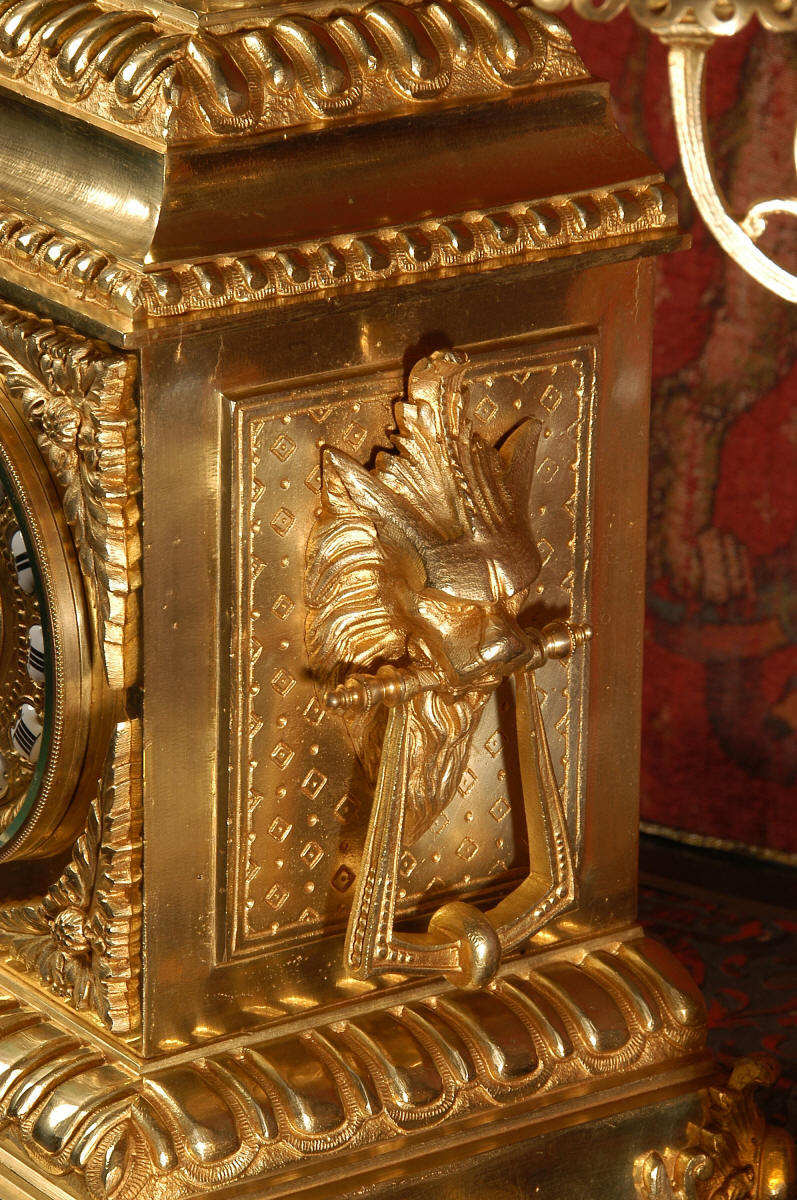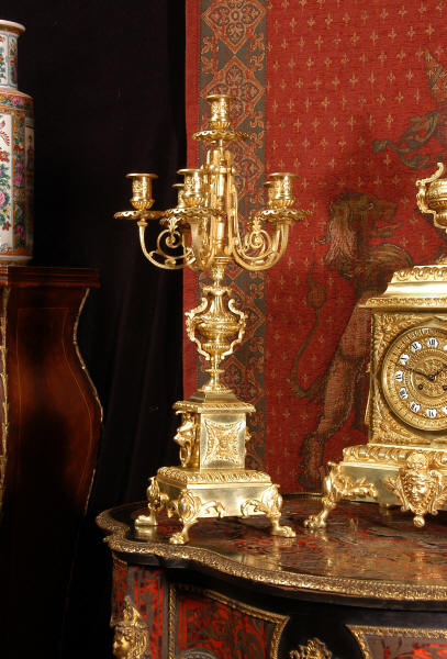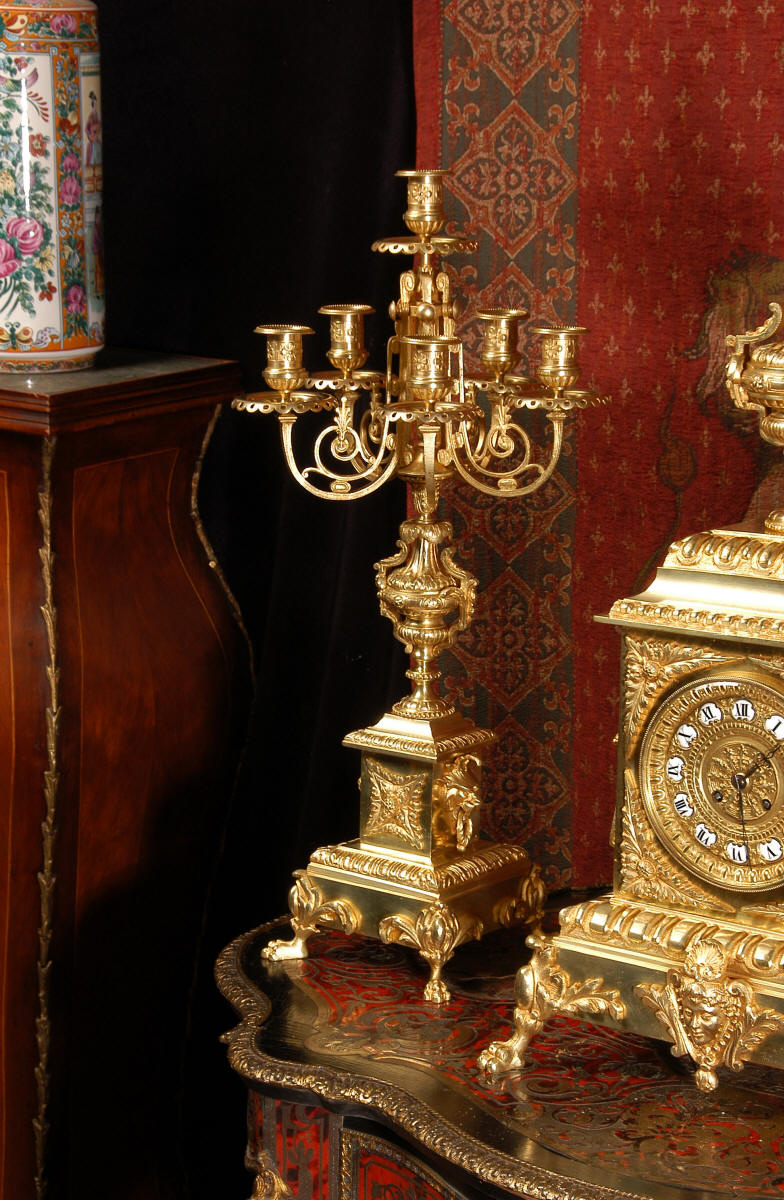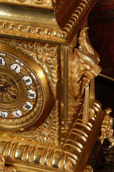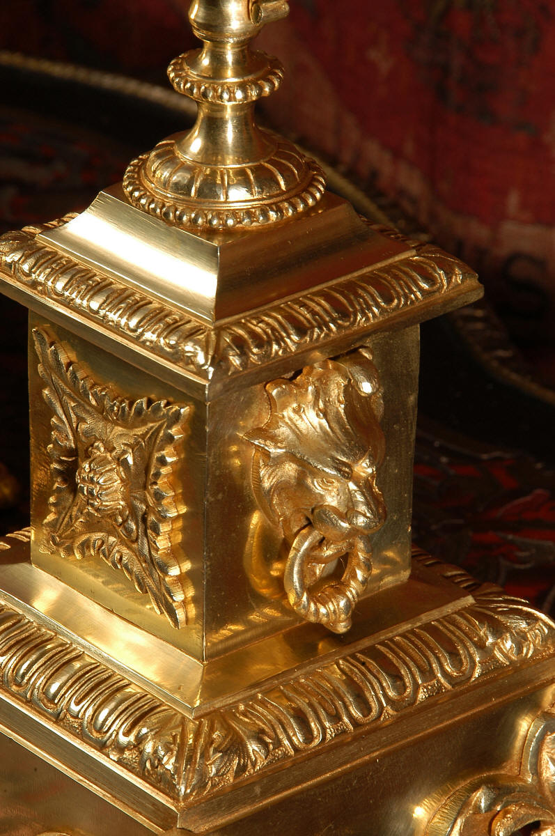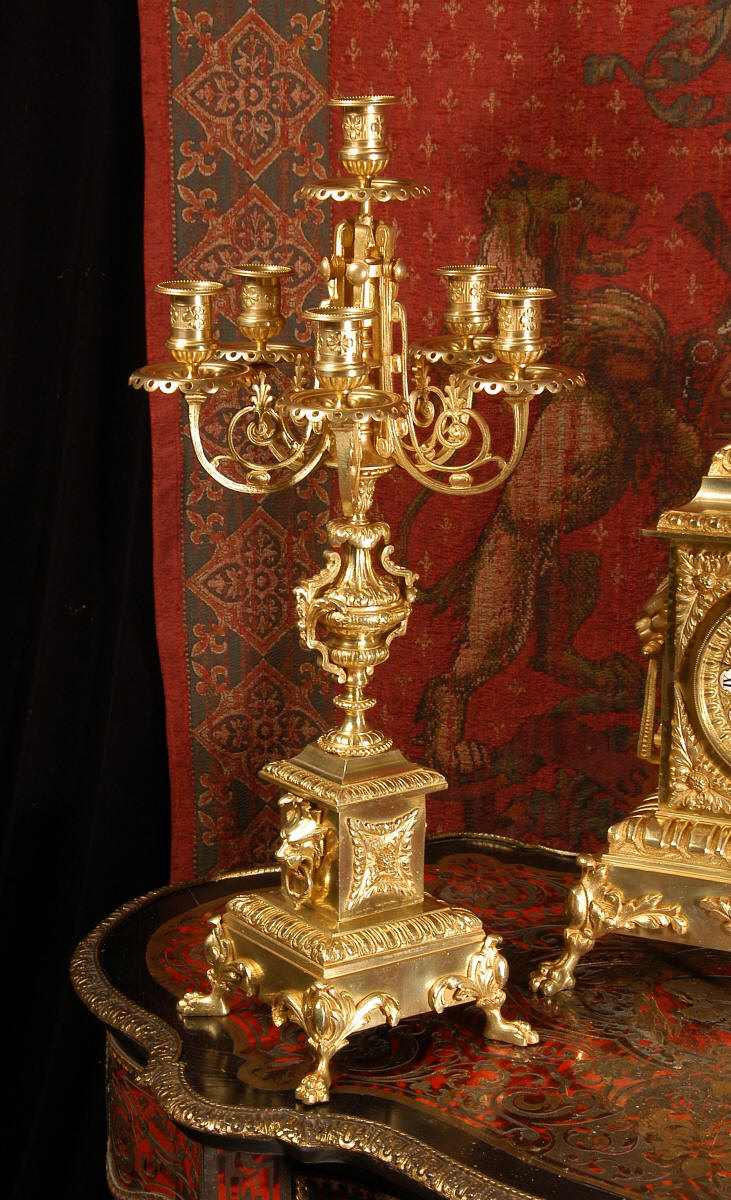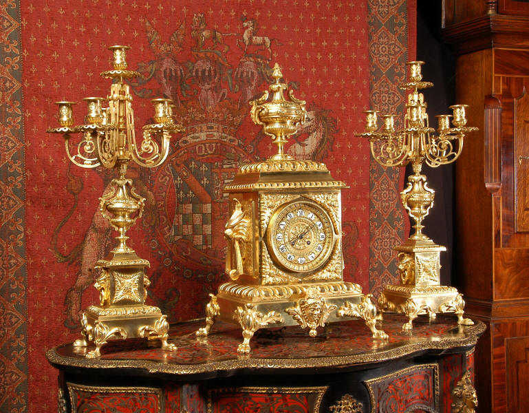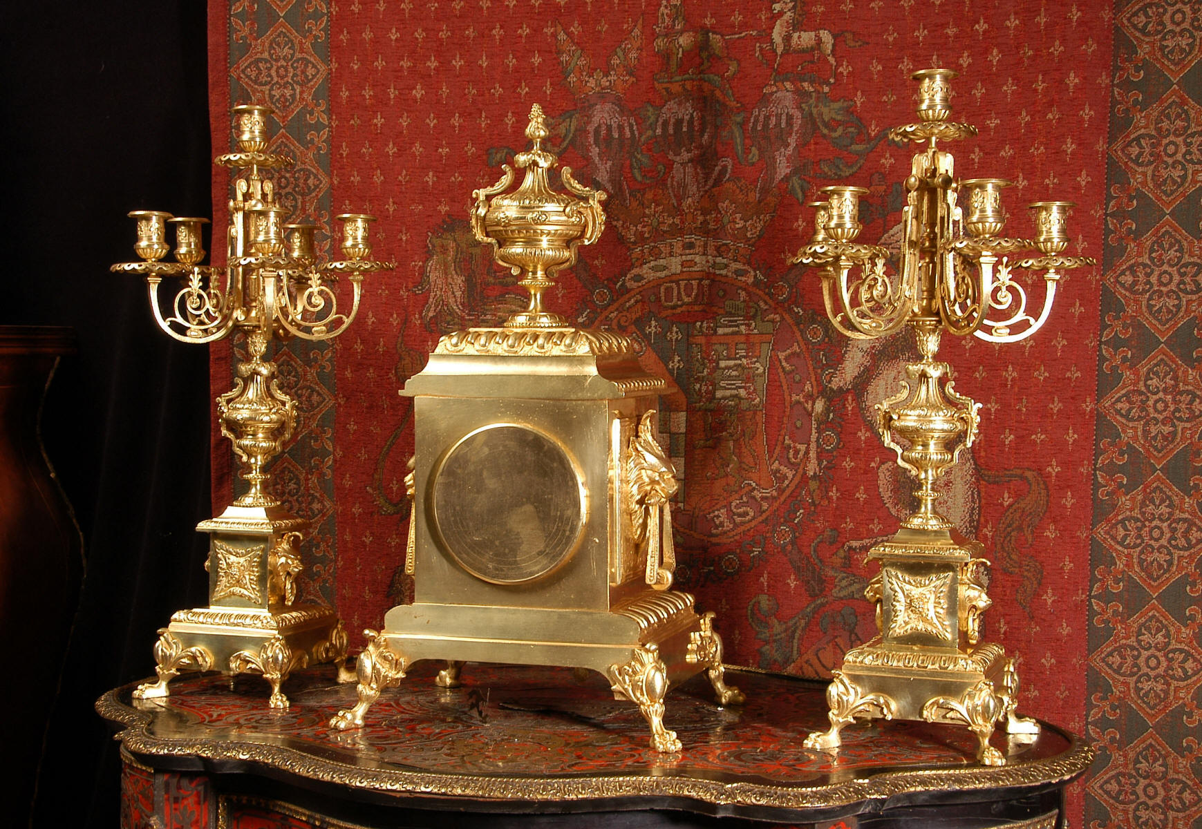 ~ French - Circa 1890 ~ ~~ Excellent condition ~~ A very finely detailed gilt brass clock in excellent condition, much of the original gilding remains which is in lovely bright and clean condition. The style is Baroque. The clock movement is held aloft by cherubim forming the front pillars. The cherubim look back at two winged lions which are tethered. The pendulum is visible swinging below the movement between the cherubim pillars, pendulum is formed as a shield with lions rampant. Above the dial is a typical Baroque broken arch. The back of the top is fretted along with the base and the clock is beautifully detailed and well finished. The dial is enamel on copper with a cast brass centre and is complete with original blued steel hands. The French movement is of very high quality and is in excellent clean and running condition having been fully serviced by our clockmaker. Pendulum is original. It runs for 8 days and strikes the hours and halves on a bell. Click the video clip below to hear the bell and watch the clock running! Condition of the case is