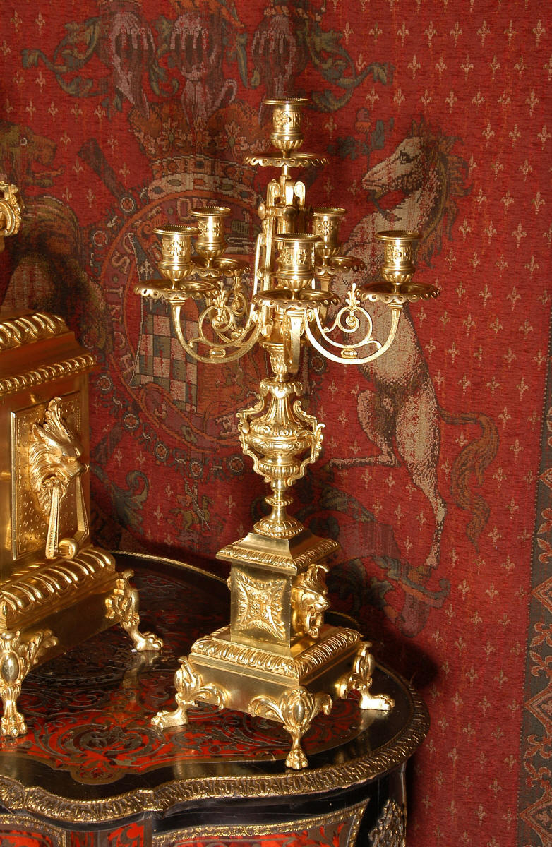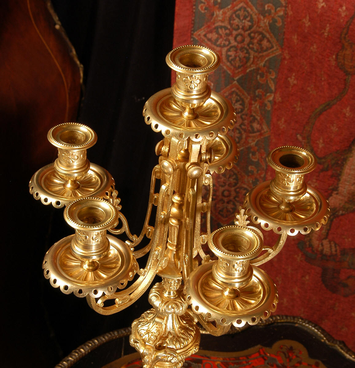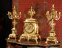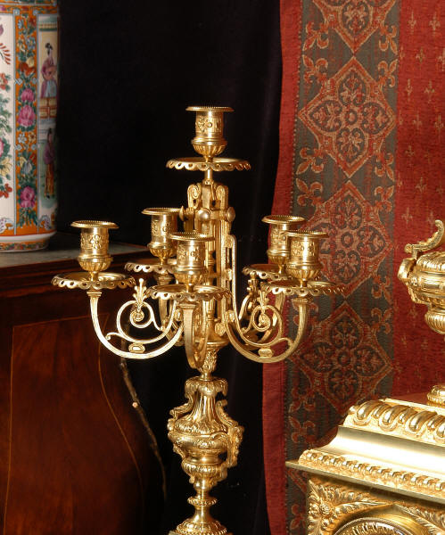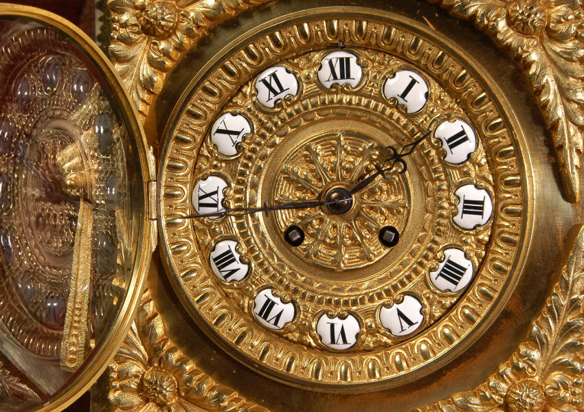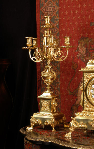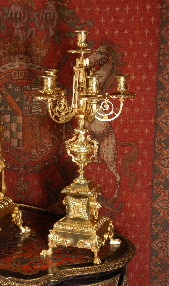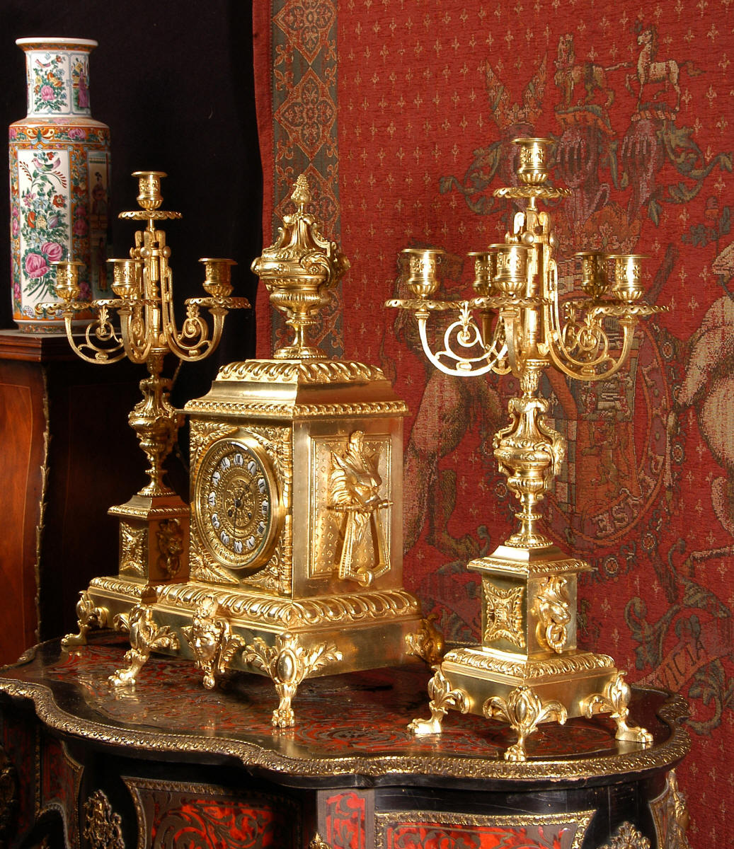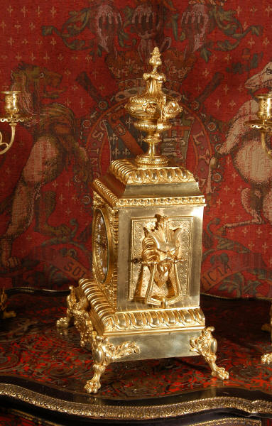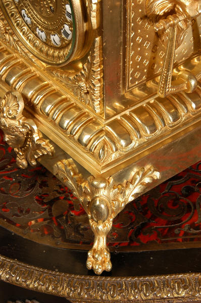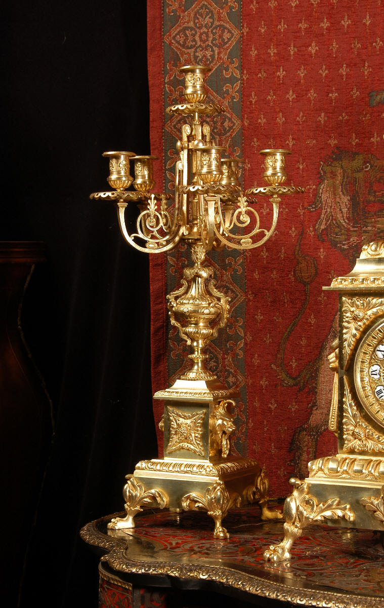 ~ French - Circa 1890 ~ ~~ Excellent condition ~~ A very finely detailed gilt brass clock in excellent condition, much of the original gilding remains which is in lovely bright and clean condition. The style is Baroque. The clock movement is held aloft by cherubim forming the front pillars. The cherubim look back at two winged lions which are tethered. The pendulum is visible swinging below the movement between the cherubim pillars, pendulum is formed as a shield with lions rampant. Above the dial is a typical Baroque broken arch. The back of the top is fretted along with the base and the clock is beautifully detailed and well finished. The dial is enamel on copper with a cast brass centre and is complete with original blued steel hands. The French movement is of very high quality and is in excellent clean and running condition having been fully serviced by our clockmaker. Pendulum is original. It runs for 8 days and strikes the hours and halves on a bell. Click the video clip below to hear the bell and watch the clock running! Condition of the case is
