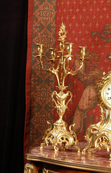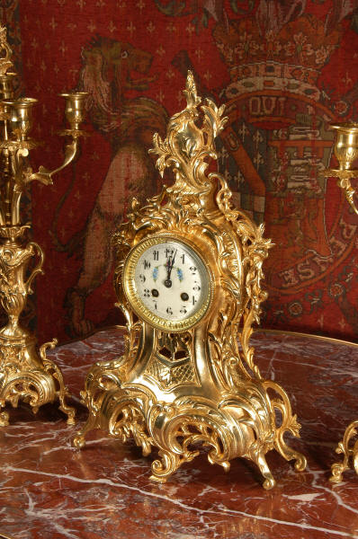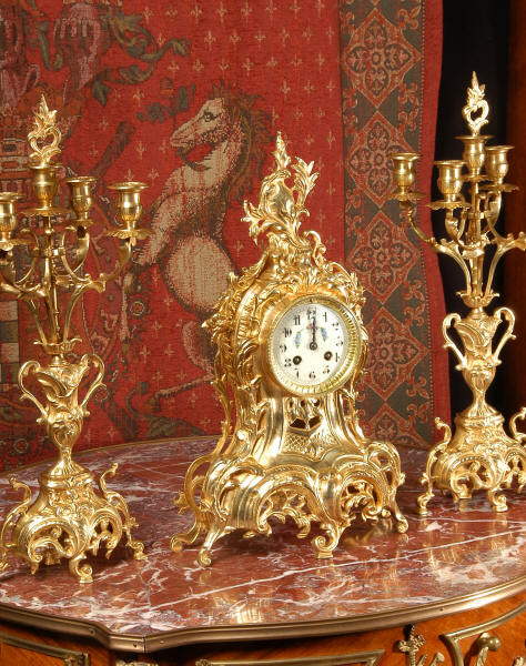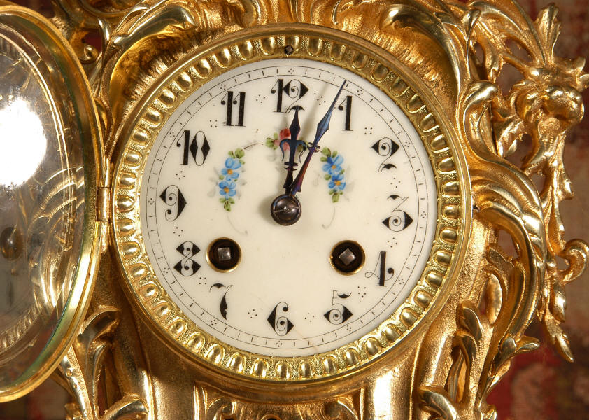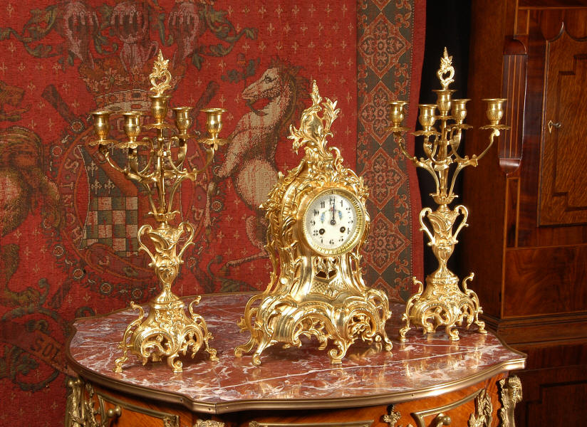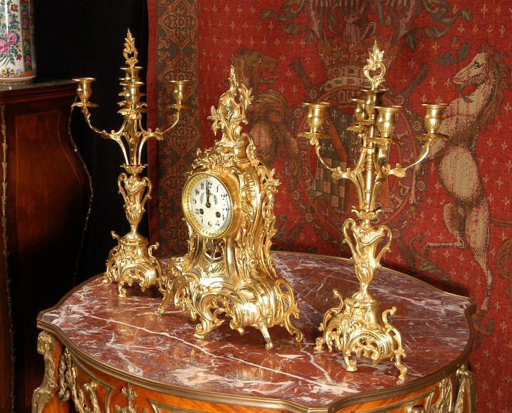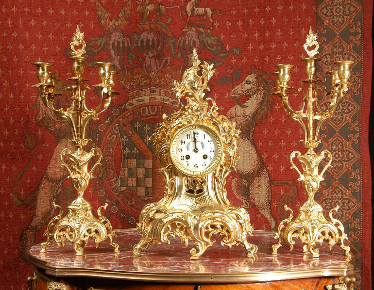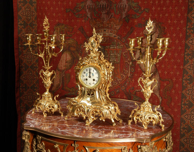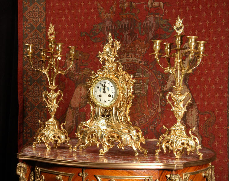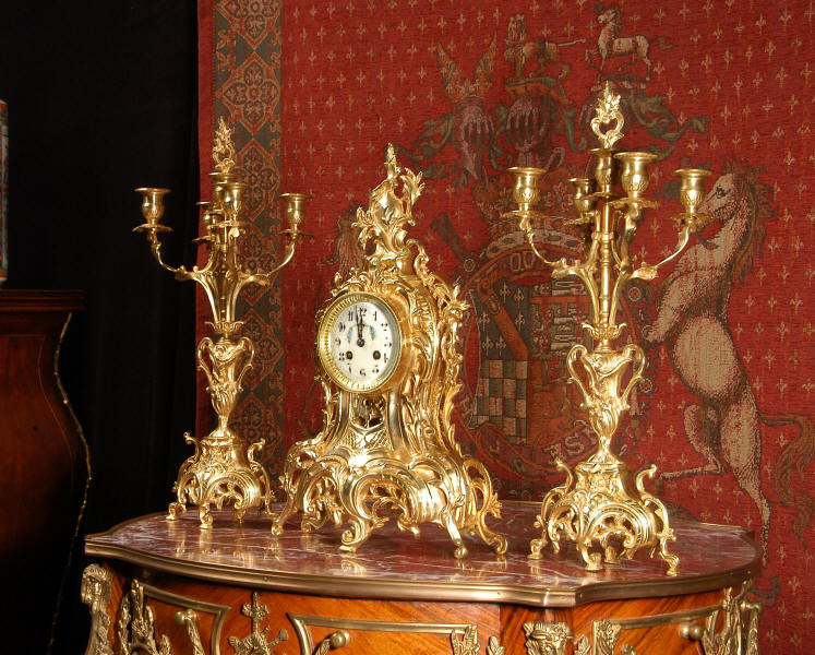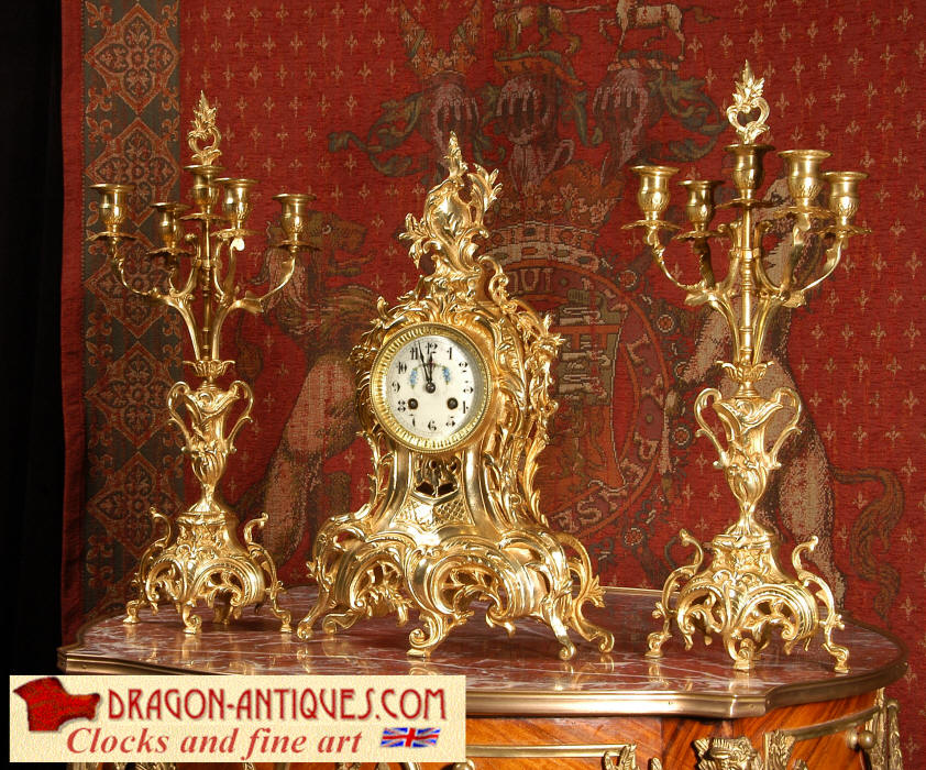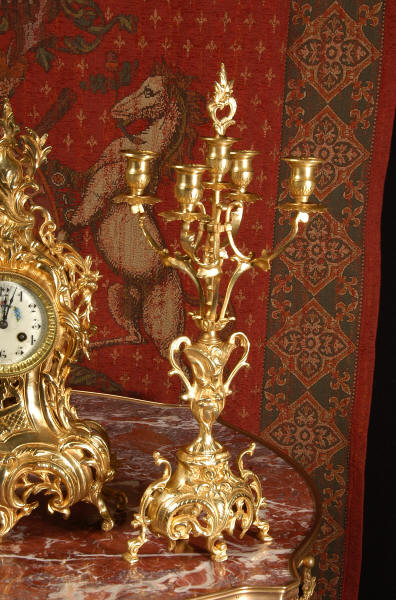 ~ French - Circa 1890 ~ ~~ Excellent condition, fully overhauled & working ~~ This is a superb, decorative antique French clock and candelabra set. Beautiful Rococo waisted shape with "C" scrolls, shells and floral swags. The front of the clock has a fretted panel allowing the pendulum to be glimpsed swinging within the case. The set is very well modelled in gilt brass which has a lovely clean and bright finish. Dial is particularly pretty, enamel on copper decorated with delicately painted floral swag. Candelabra are complete with Rococo finial snuffers. The four arms are delicately modelled as entwining foliage, standing above urns with 'c' scroll handles. The set is of very good quality with crisp, sharp and finely detailed modelling and the gilding has a lovely clean and bright finish. The French movement is of very good quality and runs for 8 days and strikes half-hourly on a bell. It is in excellent clean and running condition having been fully overhauled by our clockmaker who has also replaced the pendulum. Click the video clip below to see and hear the movement working! Condition of the case is