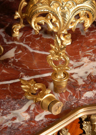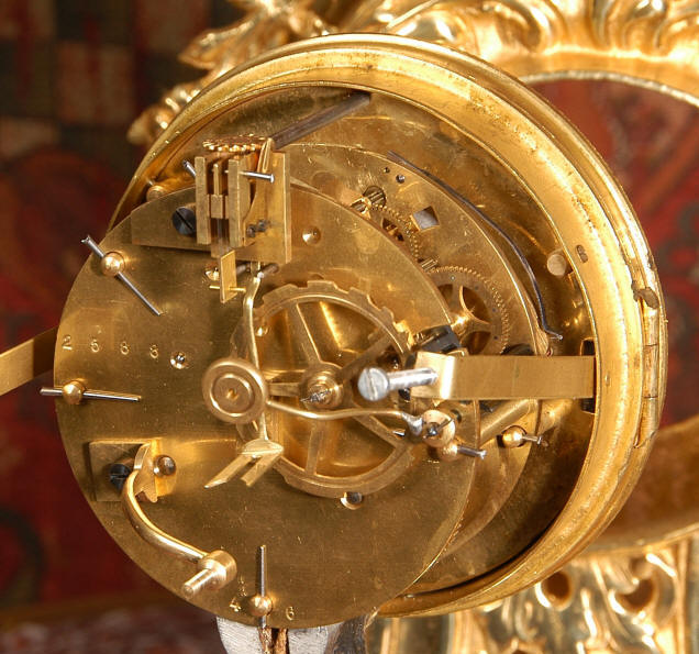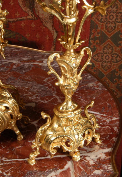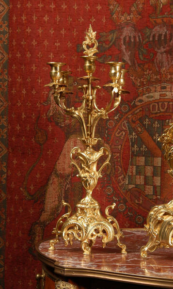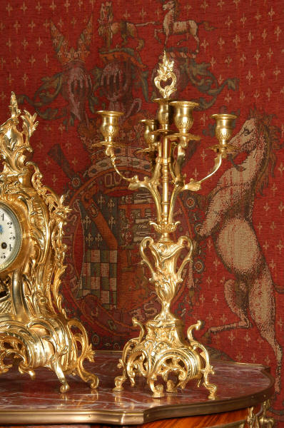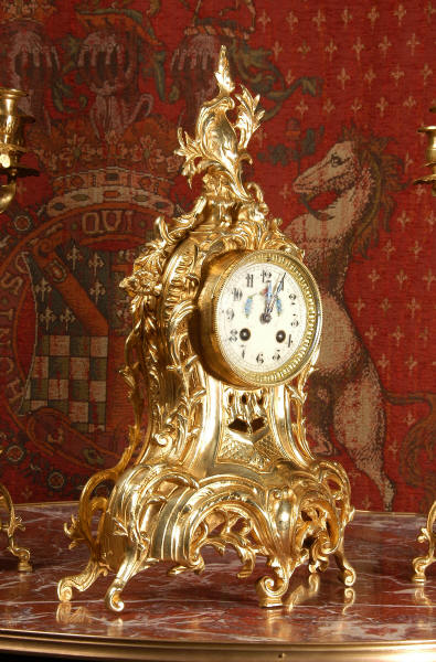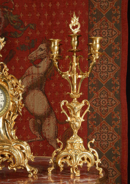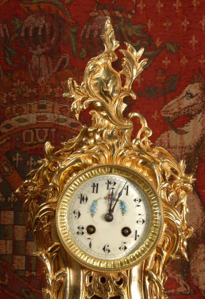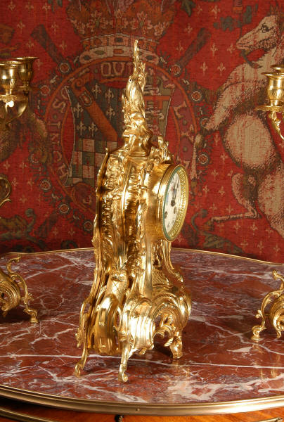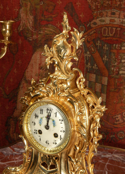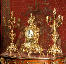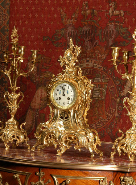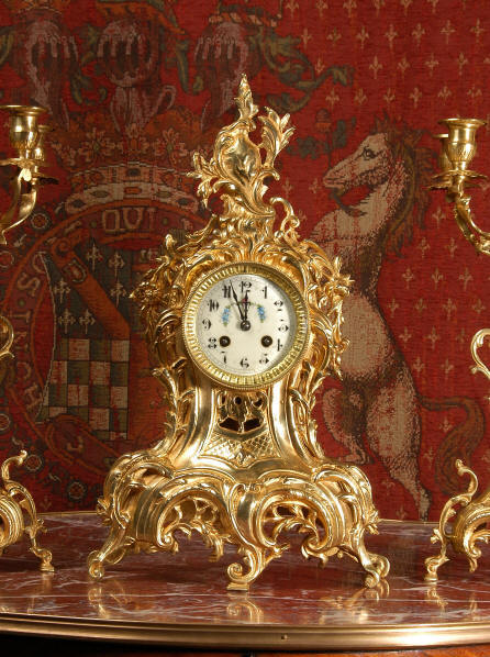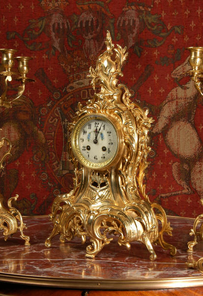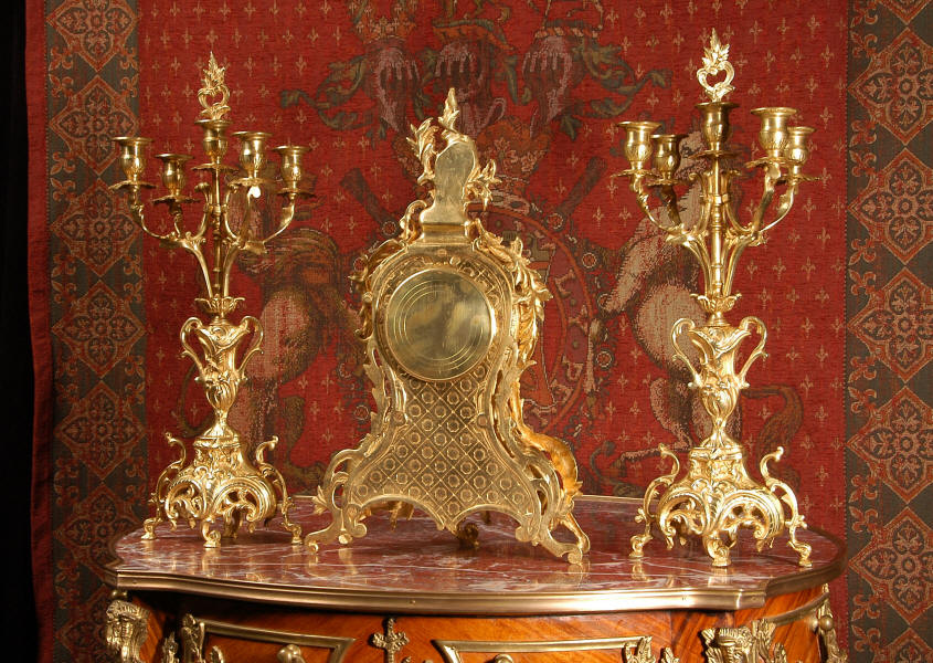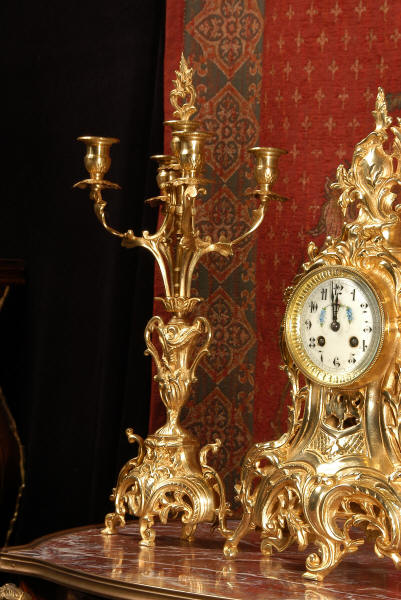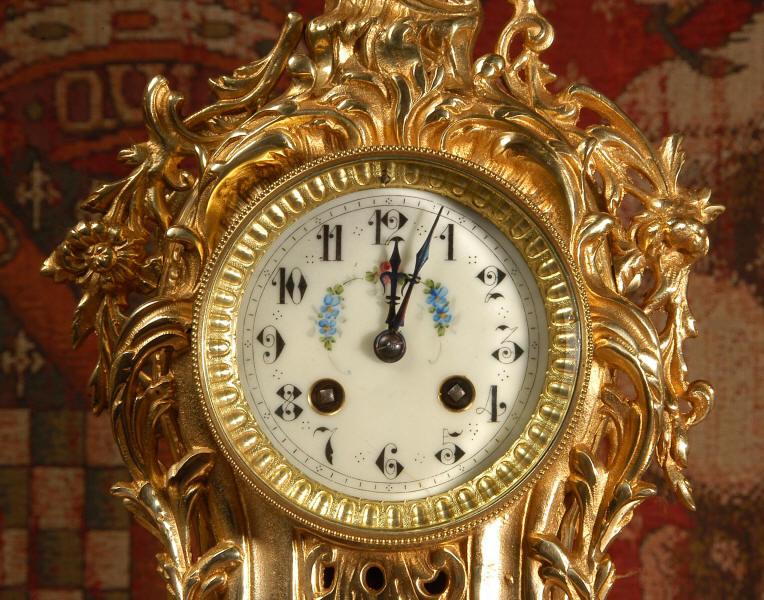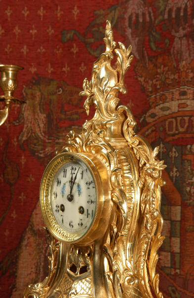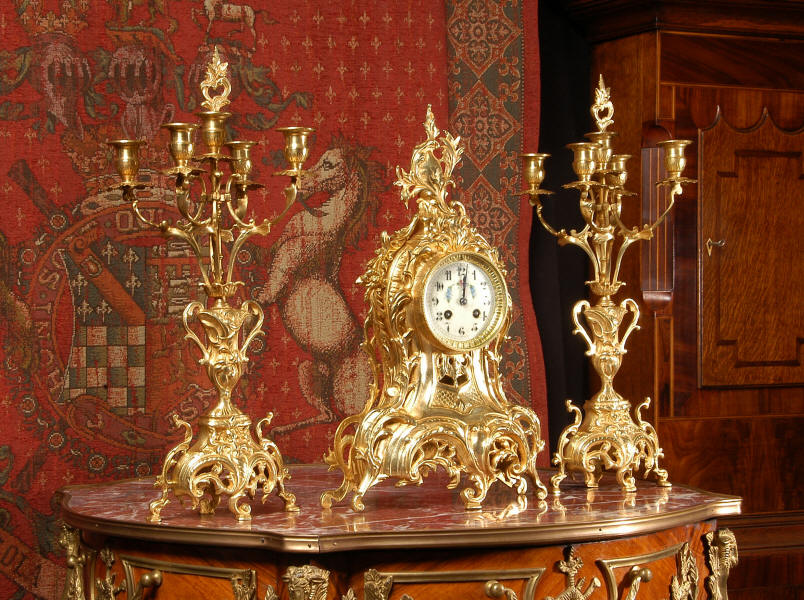 ~ French - Circa 1890 ~ ~~ Excellent condition, fully overhauled & working ~~ This is a superb, decorative antique French clock and candelabra set. Beautiful Rococo waisted shape with "C" scrolls, shells and floral swags. The front of the clock has a fretted panel allowing the pendulum to be glimpsed swinging within the case. The set is very well modelled in gilt brass which has a lovely clean and bright finish. Dial is particularly pretty, enamel on copper decorated with delicately painted floral swag. Candelabra are complete with Rococo finial snuffers. The four arms are delicately modelled as entwining foliage, standing above urns with 'c' scroll handles. The set is of very good quality with crisp, sharp and finely detailed modelling and the gilding has a lovely clean and bright finish. The French movement is of very good quality and runs for 8 days and strikes half-hourly on a bell. It is in excellent clean and running condition having been fully overhauled by our clockmaker who has also replaced the pendulum. Click the video clip below to see and hear the movement working! Condition of the case is