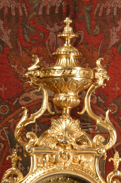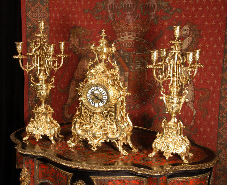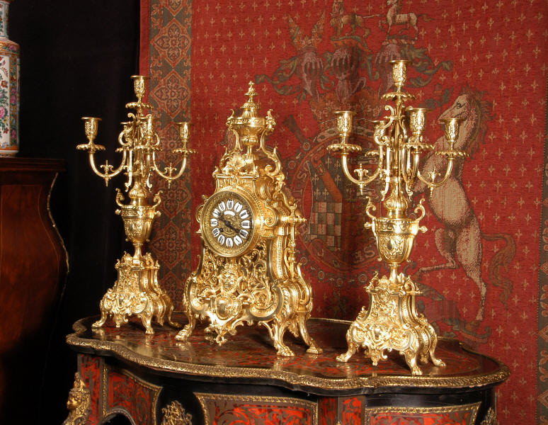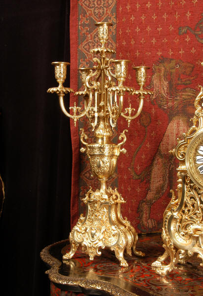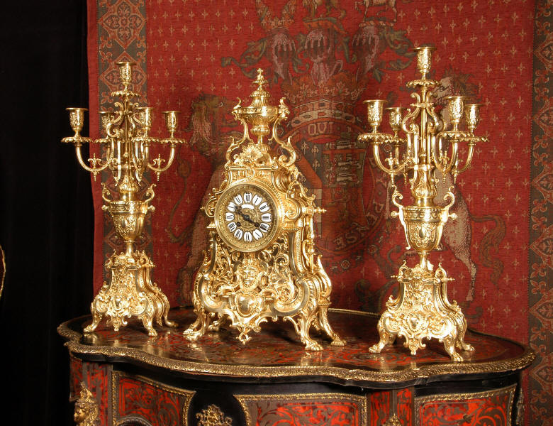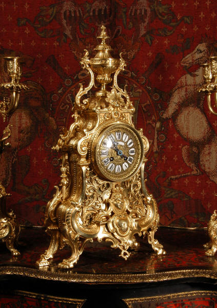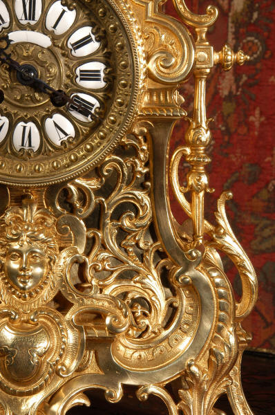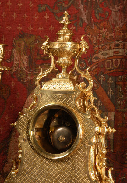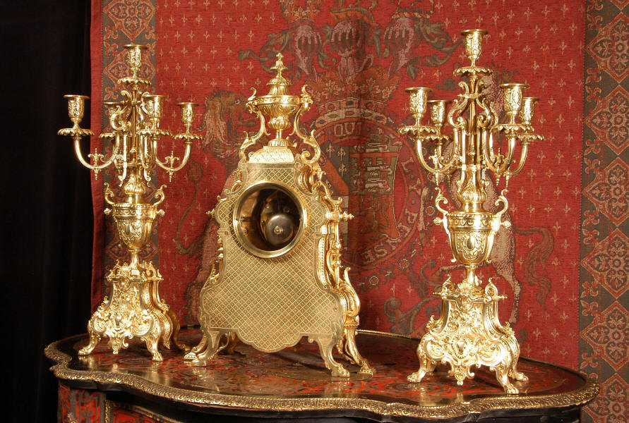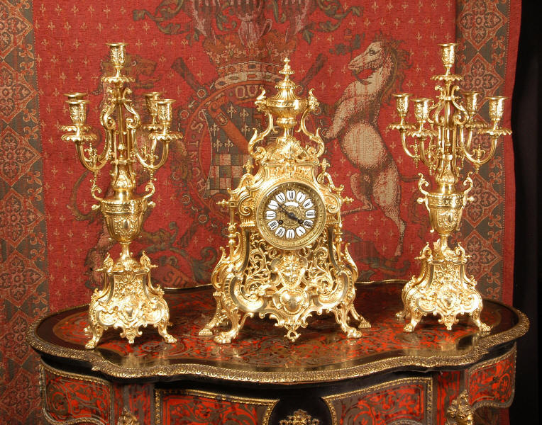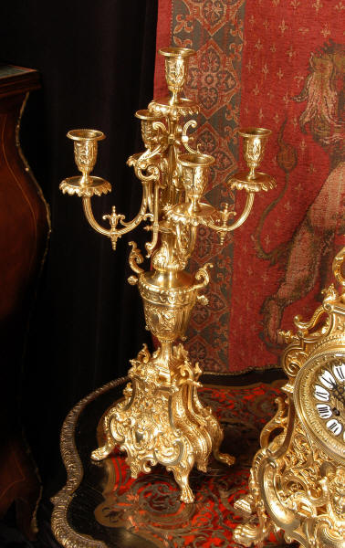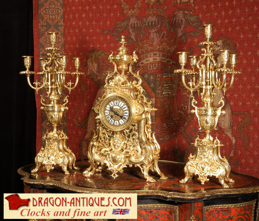 ~ French - Circa 1870 ~ ~~ Excellent condition ~~ A very finely detailed gilt brass clock in excellent condition, the original gilding is in lovely bright and clean condition. It is modelled in the Baroque style with hairy paw feet, lions mask above the dial, goddess mask below the dial and mythical creatures to each sides of the urn. It is profusely decorated with flowing foliage, particularly the front of the clock which is elaborately blinded fretted. Candelabra have matching bases mounted with handled urns and four branches. This is a beautifully modelled and finished clock set in very good condition. The large dial is cast brass and has an egg and dart bezel fitted with convex glass. It is mounted with 13 enamel cartouches, one for each hour and one for the retailers name below the 12 o'clock. The rear door is also glazed to allow the movement to be seen. The French movement is of excellent quality and has the Samuel Marti 'Medaille De Bronze' mark on the movement backplate. It is in excellent clean and running condition having been fully overhauled and tested by our clockmaker. Pendulum is original. It runs for 8 days and strikes the hours and halves on a coiled gong. Click the movie below to hear the gong strike and watch the clock running! Condition of the case is
