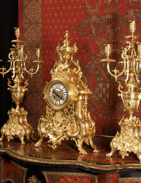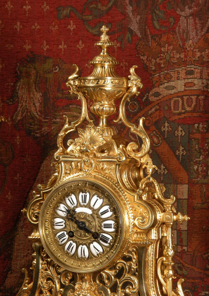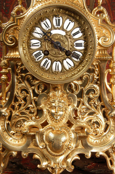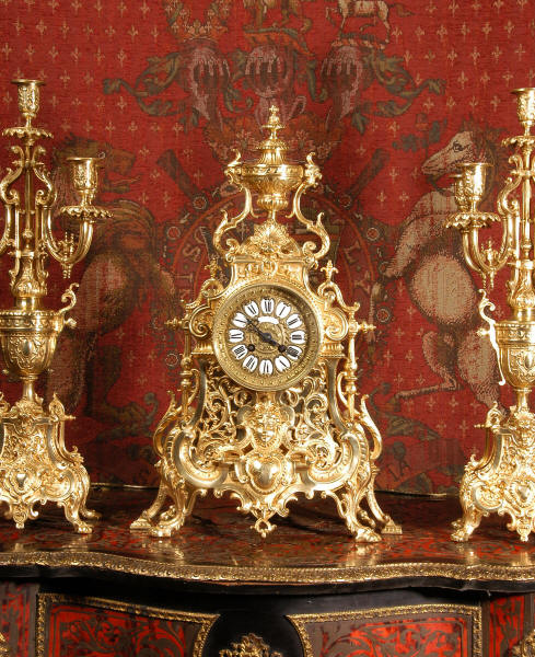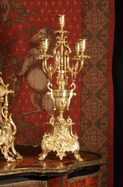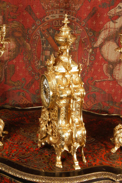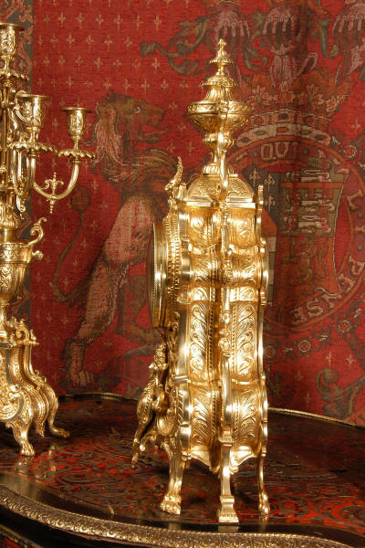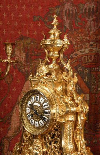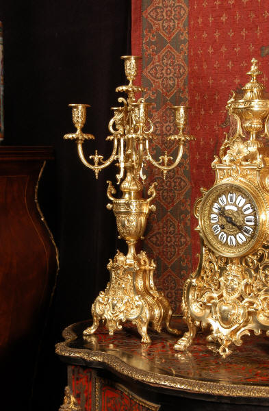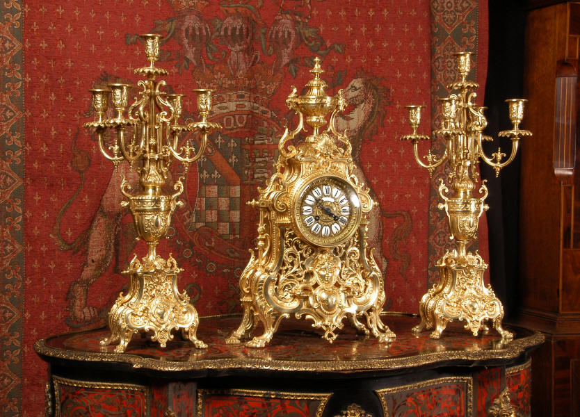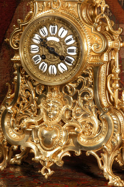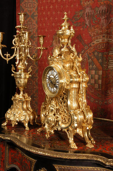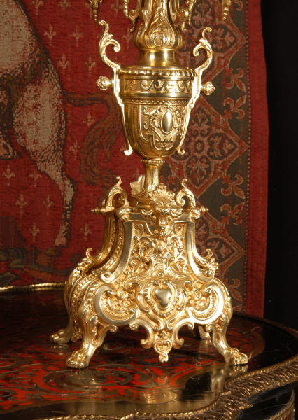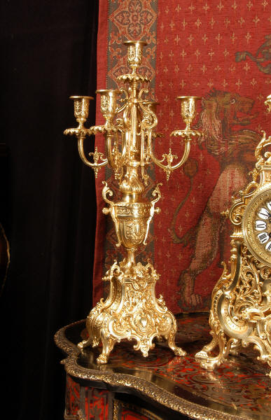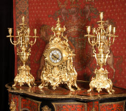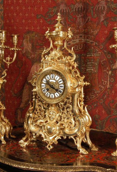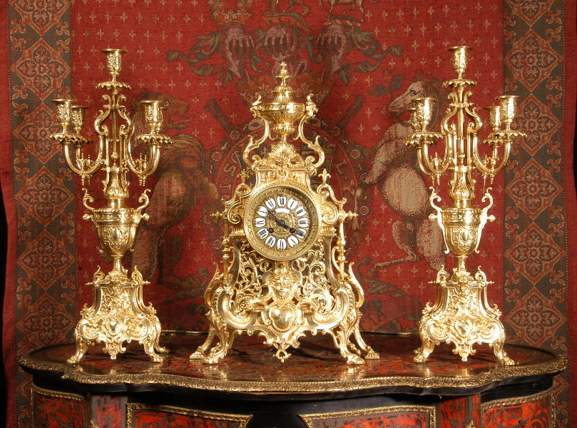 ~ French - Circa 1870 ~ ~~ Excellent condition ~~ A very finely detailed gilt brass clock in excellent condition, the original gilding is in lovely bright and clean condition. It is modelled in the Baroque style with hairy paw feet, lions mask above the dial, goddess mask below the dial and mythical creatures to each sides of the urn. It is profusely decorated with flowing foliage, particularly the front of the clock which is elaborately blinded fretted. Candelabra have matching bases mounted with handled urns and four branches. This is a beautifully modelled and finished clock set in very good condition. The large dial is cast brass and has an egg and dart bezel fitted with convex glass. It is mounted with 13 enamel cartouches, one for each hour and one for the retailers name below the 12 o'clock. The rear door is also glazed to allow the movement to be seen. The French movement is of excellent quality and has the Samuel Marti 'Medaille De Bronze' mark on the movement backplate. It is in excellent clean and running condition having been fully overhauled and tested by our clockmaker. Pendulum is original. It runs for 8 days and strikes the hours and halves on a coiled gong. Click the movie below to hear the gong strike and watch the clock running! Condition of the case is