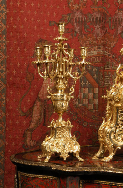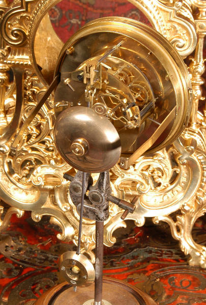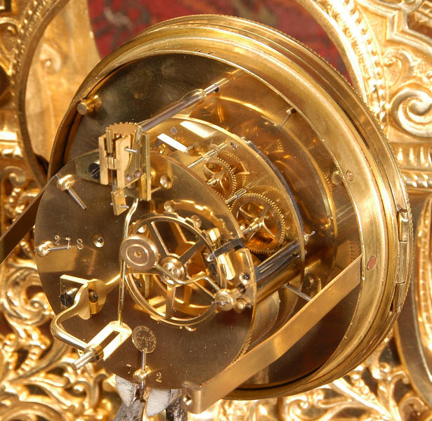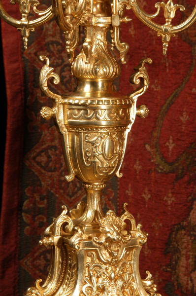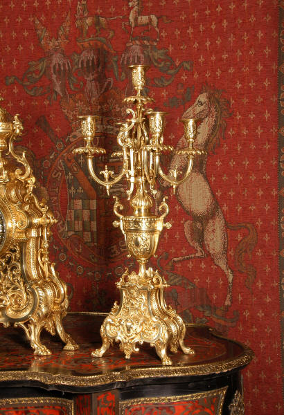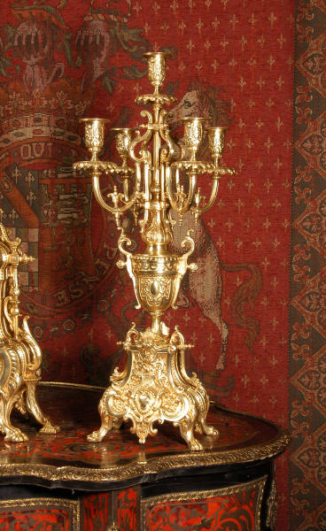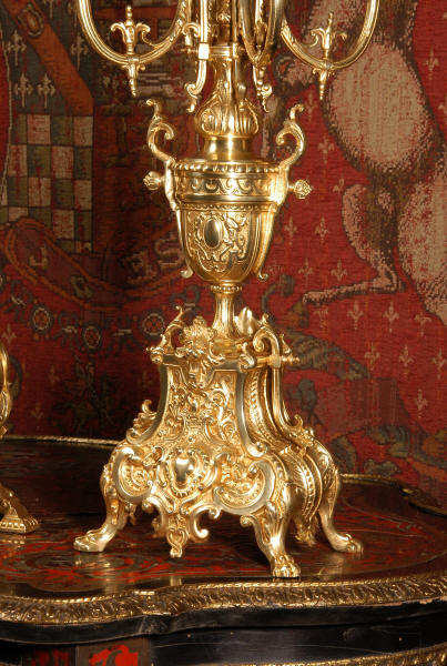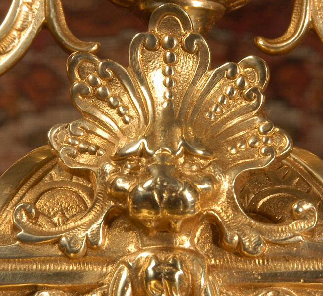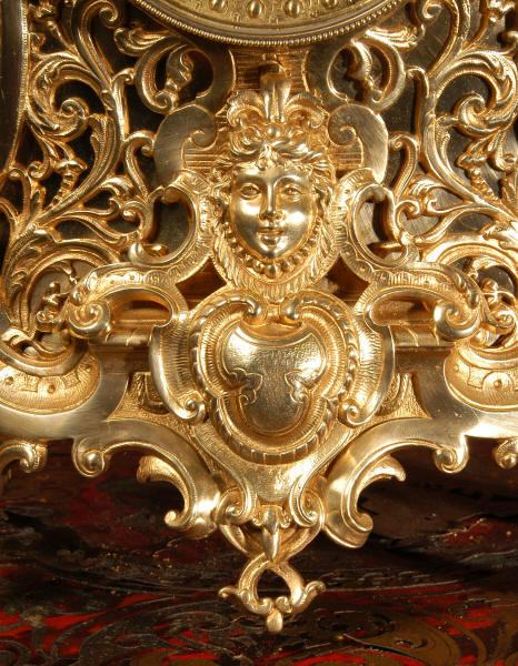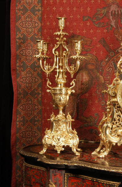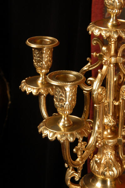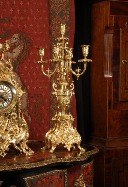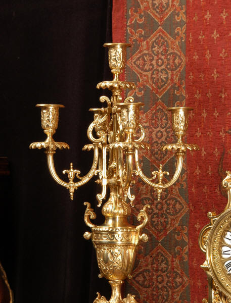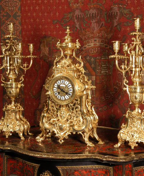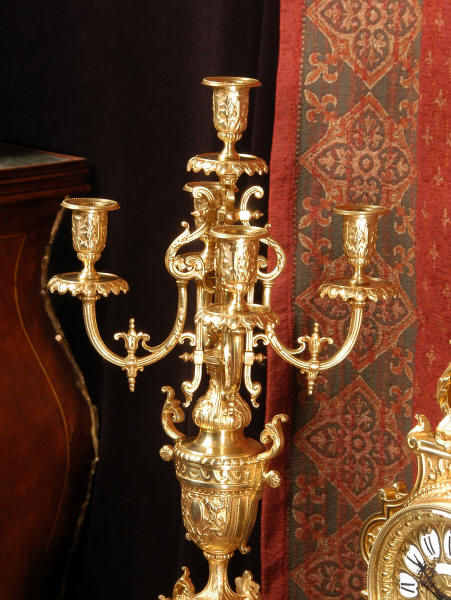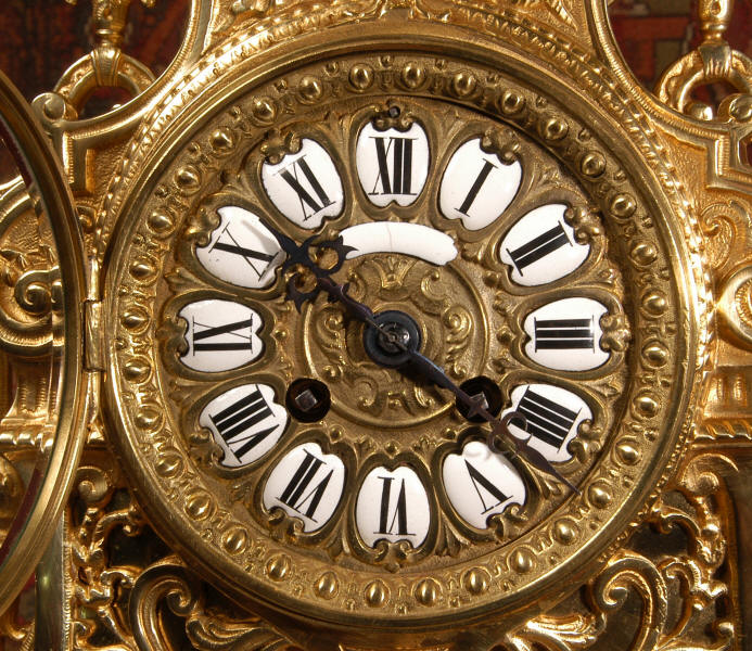 ~ French - Circa 1870 ~ ~~ Excellent condition ~~ A very finely detailed gilt brass clock in excellent condition, the original gilding is in lovely bright and clean condition. It is modelled in the Baroque style with hairy paw feet, lions mask above the dial, goddess mask below the dial and mythical creatures to each sides of the urn. It is profusely decorated with flowing foliage, particularly the front of the clock which is elaborately blinded fretted. Candelabra have matching bases mounted with handled urns and four branches. This is a beautifully modelled and finished clock set in very good condition. The large dial is cast brass and has an egg and dart bezel fitted with convex glass. It is mounted with 13 enamel cartouches, one for each hour and one for the retailers name below the 12 o'clock. The rear door is also glazed to allow the movement to be seen. The French movement is of excellent quality and has the Samuel Marti 'Medaille De Bronze' mark on the movement backplate. It is in excellent clean and running condition having been fully overhauled and tested by our clockmaker. Pendulum is original. It runs for 8 days and strikes the hours and halves on a coiled gong. Click the movie below to hear the gong strike and watch the clock running! Condition of the case is