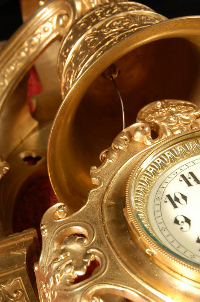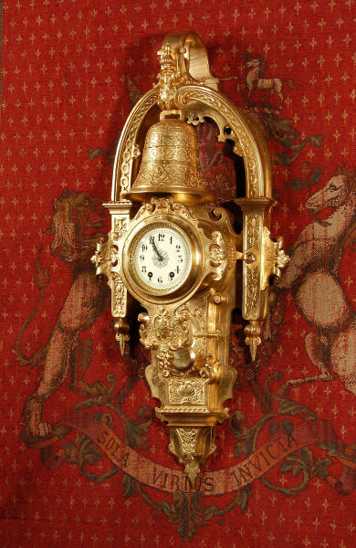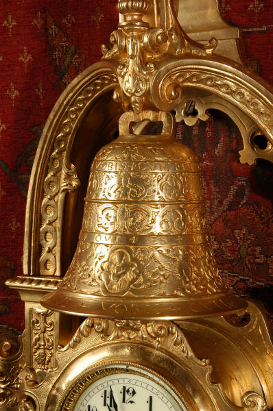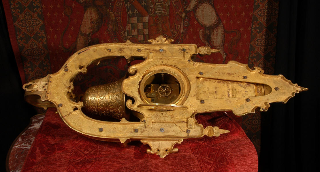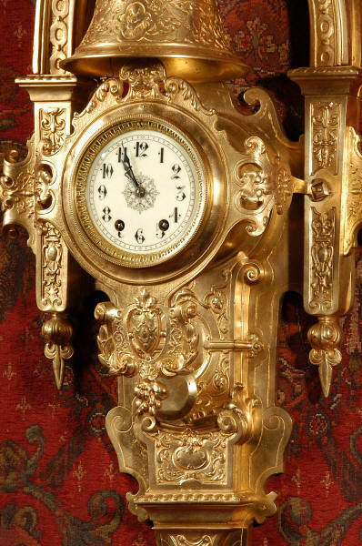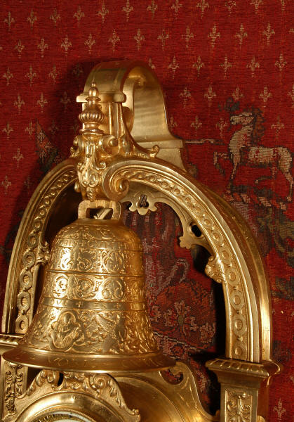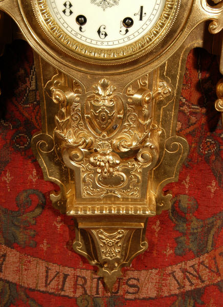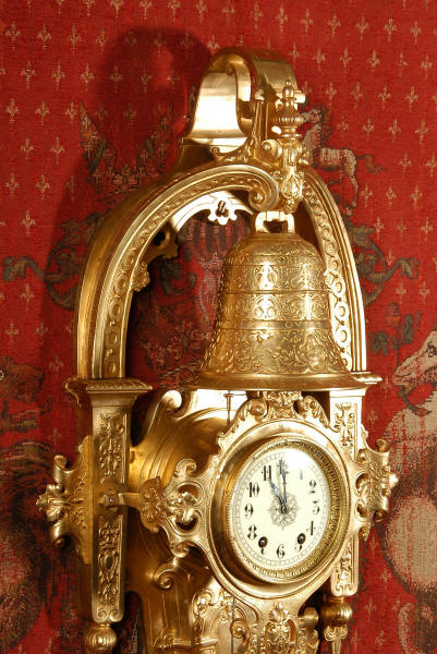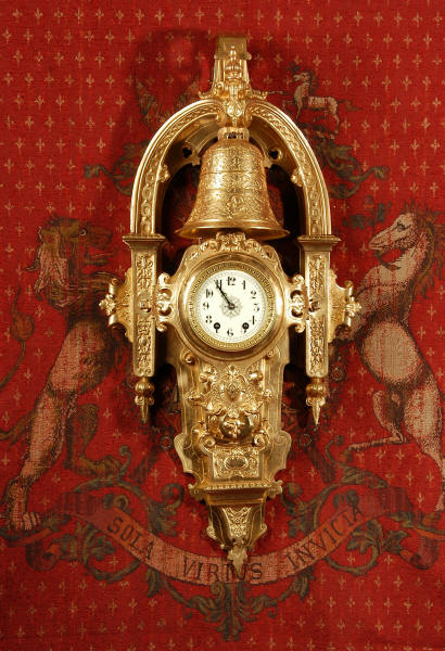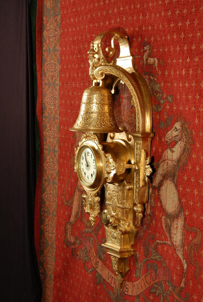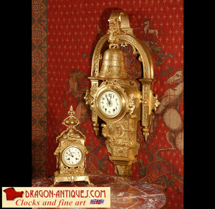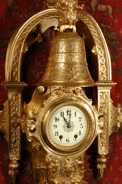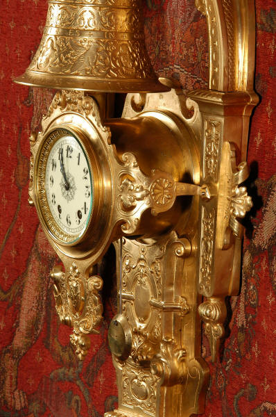 ~ French - Circa 1900 ~ ~~ Excellent condition ~~ A Stunning and rare Gothic wall clock, of architectural proportions at over 3 ft in height and constructed very heavily from solid brass. It features a large decorated brass bell hanging above the movement that the movement strikes every half hour (see the video clip below). The case is designed as a huge, elaborate, arched bracket from which the bell and movement hang. The is pendulum is visible swinging below. This is a grand clock on a huge scale, it is difficult to sense the scale and weight of this clock from the pictures, it will require a substantial bolt, screw or hook to hang from and two people to safely lift it into position. The large dial is enamel on copper and is complete with original blued steel hands. The French movement has the Samuel Marti 'gold medal' mark on the movement backplate. It is the large, square plated version of the Pendule de Paris and has a specially made strike mechanism in order that the clock can strike the large bell. It is of high quality and is in excellent clean and running condition having been fully overhauled by our clockmaker. Pendulum is original. It runs for 8 days on one wind and strikes the hours and halves on a bell. Click the video clip below to hear the bell and watch the clock running! Condition of the case is
