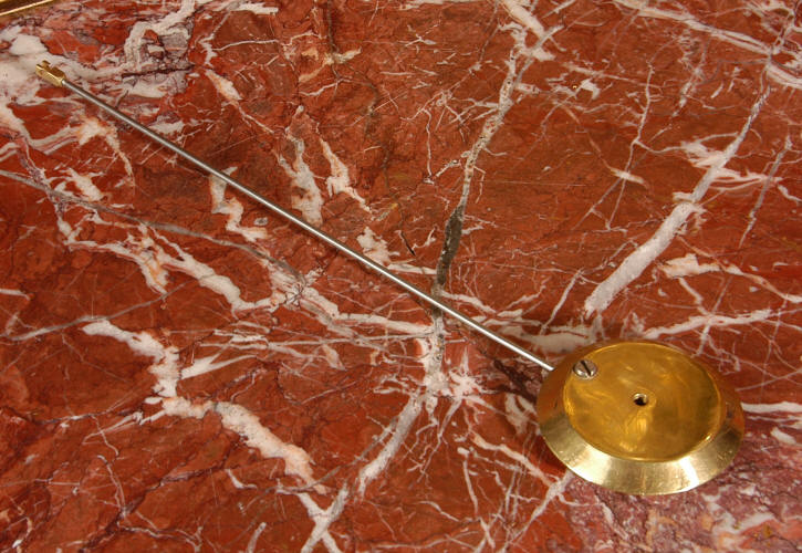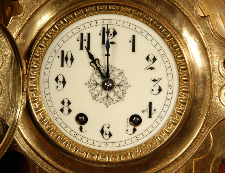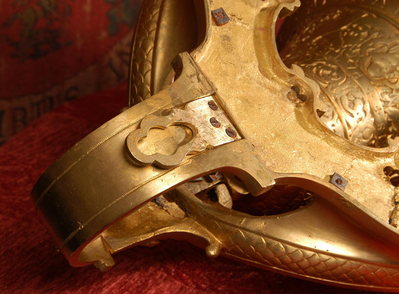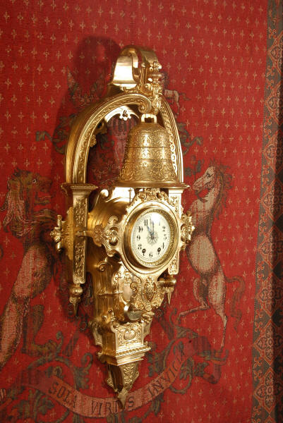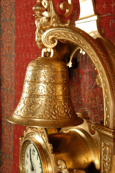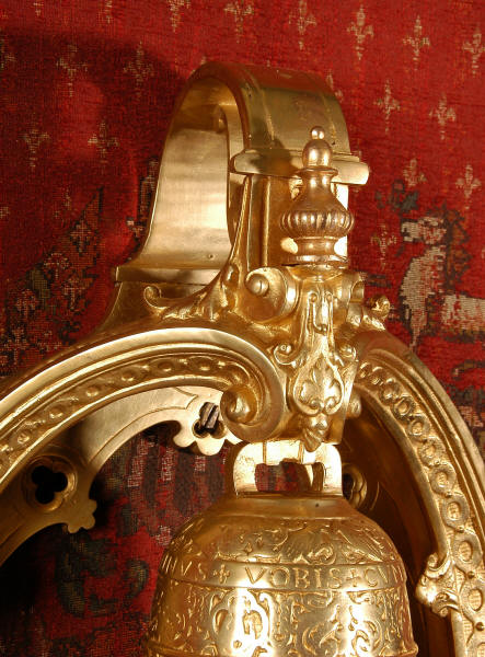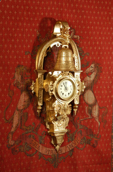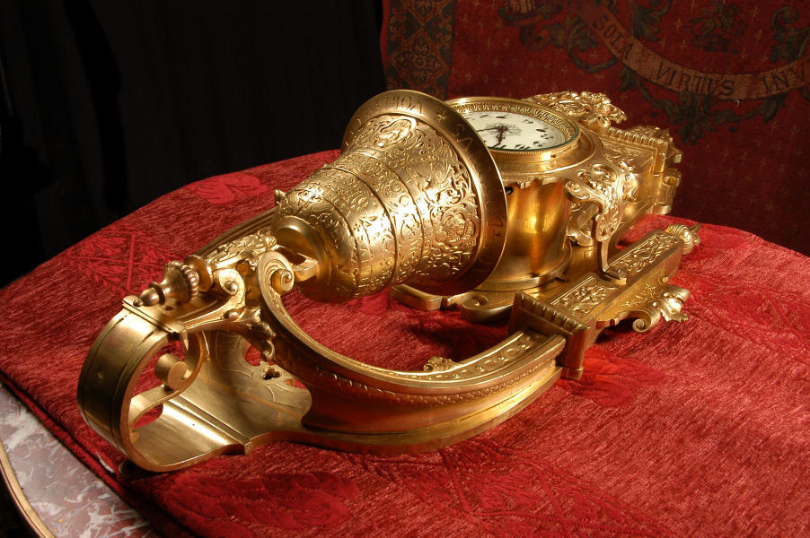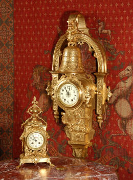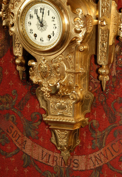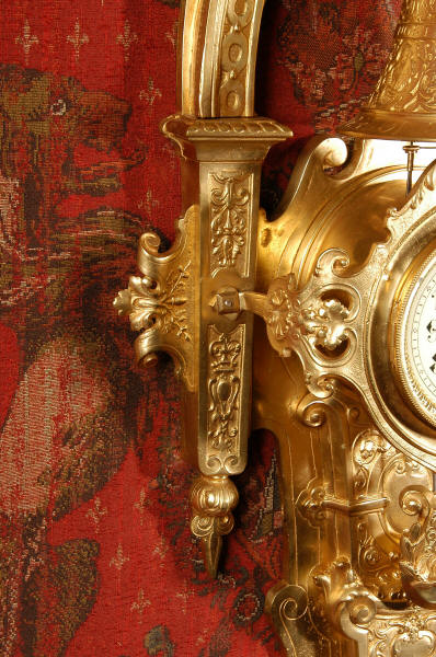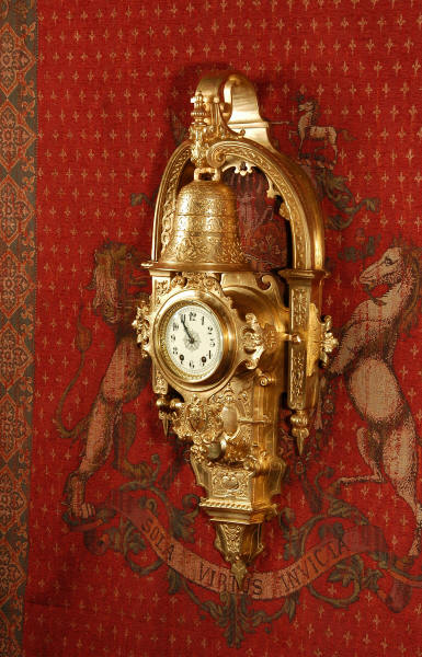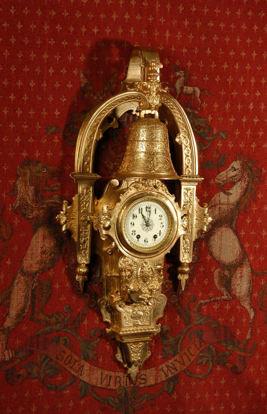 ~ French - Circa 1900 ~ ~~ Excellent condition ~~ A Stunning and rare Gothic wall clock, of architectural proportions at over 3 ft in height and constructed very heavily from solid brass. It features a large decorated brass bell hanging above the movement that the movement strikes every half hour (see the video clip below). The case is designed as a huge, elaborate, arched bracket from which the bell and movement hang. The is pendulum is visible swinging below. This is a grand clock on a huge scale, it is difficult to sense the scale and weight of this clock from the pictures, it will require a substantial bolt, screw or hook to hang from and two people to safely lift it into position. The large dial is enamel on copper and is complete with original blued steel hands. The French movement has the Samuel Marti 'gold medal' mark on the movement backplate. It is the large, square plated version of the Pendule de Paris and has a specially made strike mechanism in order that the clock can strike the large bell. It is of high quality and is in excellent clean and running condition having been fully overhauled by our clockmaker. Pendulum is original. It runs for 8 days on one wind and strikes the hours and halves on a bell. Click the video clip below to hear the bell and watch the clock running! Condition of the case is