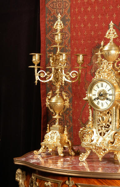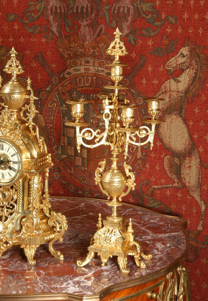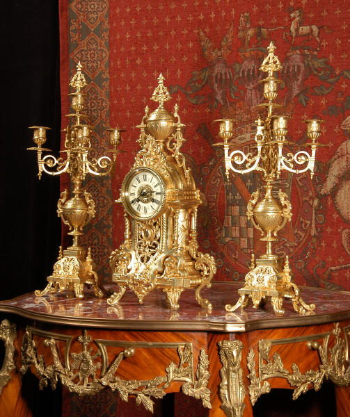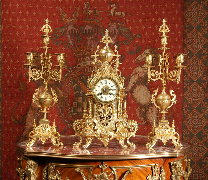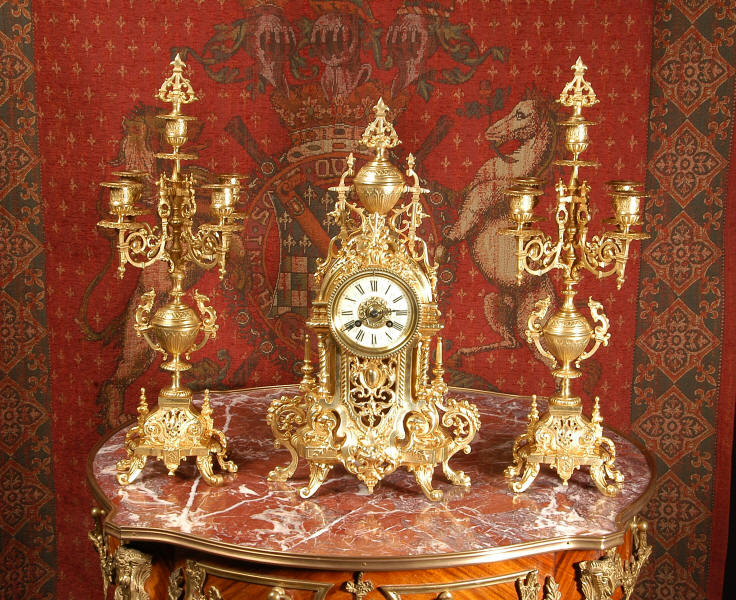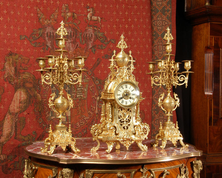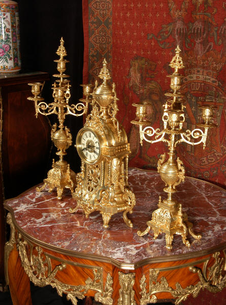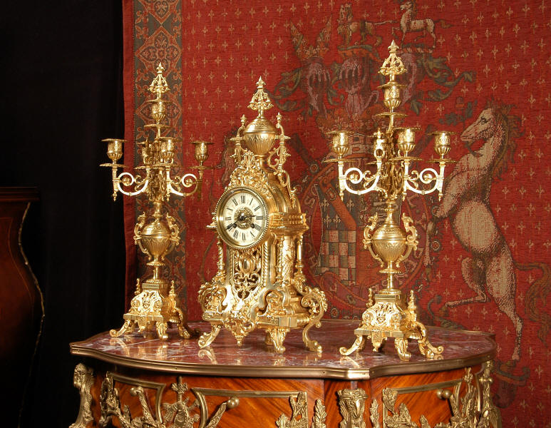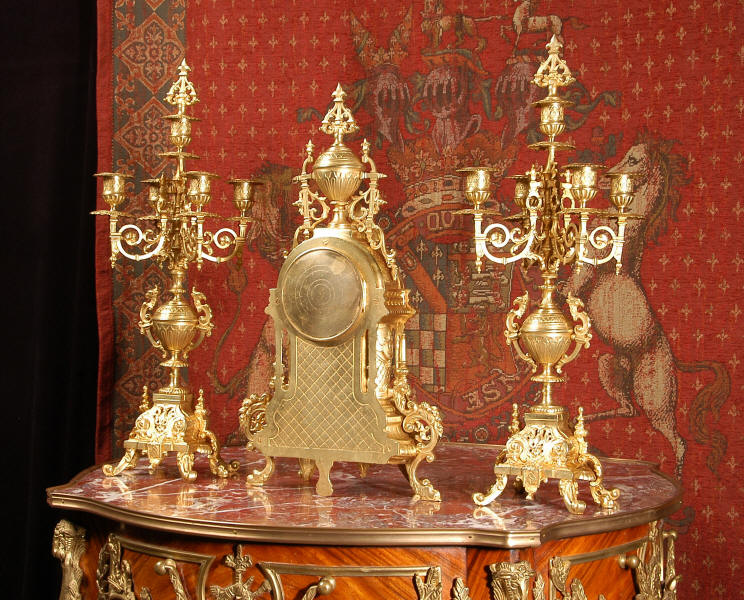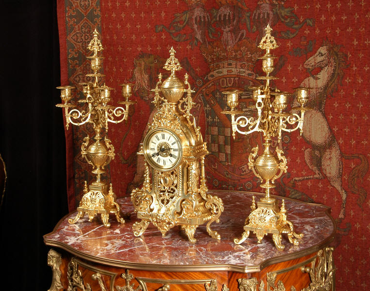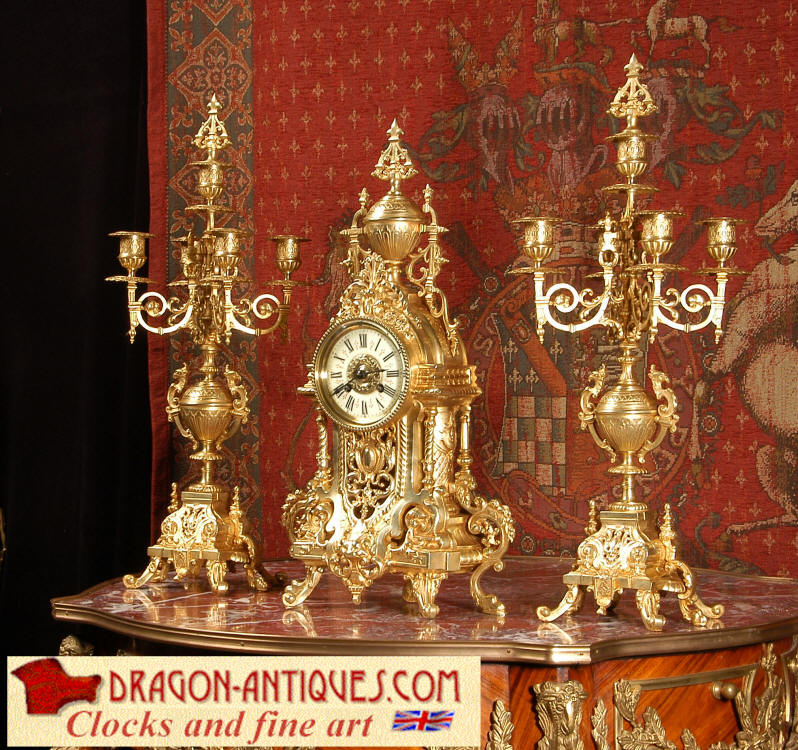 ~ French - Circa 1880 ~ ~~ Excellent condition, fully overhauled & running ~~ A stunning antique French brass clock set, classical in style and in excellent clean and bright condition. The clock features a fretted panel to the front allowing the pendulum to be glimpsed swinging within the case. Clock case and candelabra are mounted with mythical creatures and have elegant scroll feet. Candelabra have the original snuffers which sit in the central sconce to match the clock. The dial is enamel on copper with a brass centre. It is complete with blued steel hands and convex glass. The French movement is of high quality and is in excellent clean and running condition having been fully overhauled by our clockmaker. Pendulum is a replacement. It runs for 8 days and strikes the hours and halves on a bell. Click the video clip below to hear the bell and watch the clock running! Condition of the case is