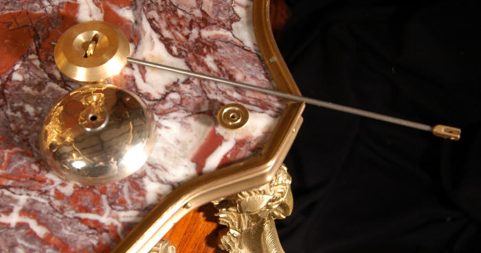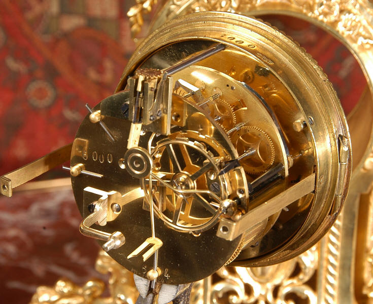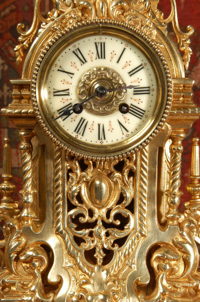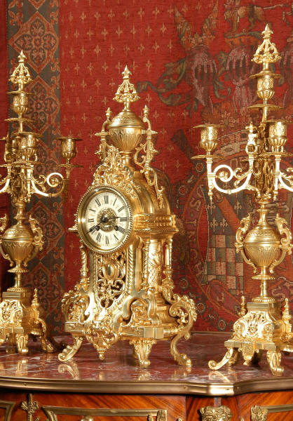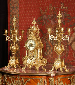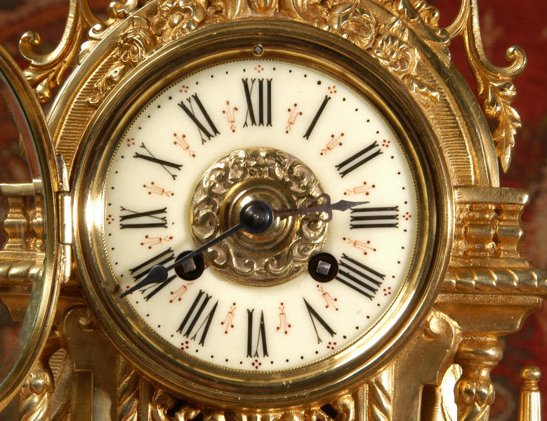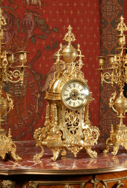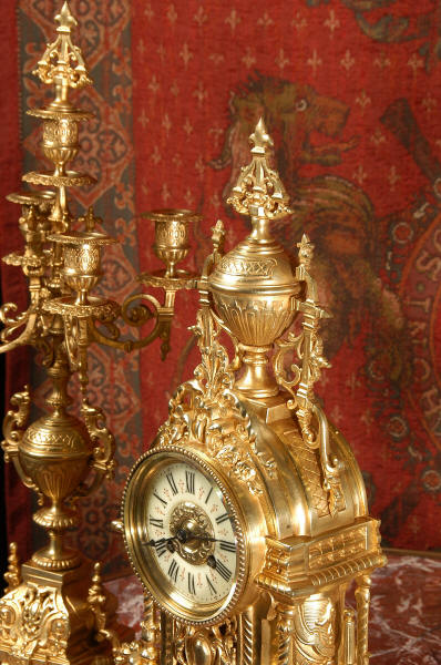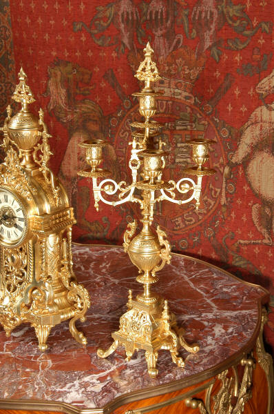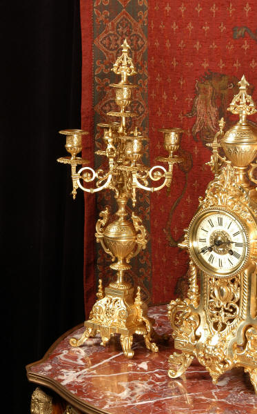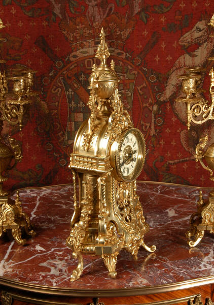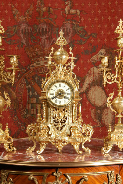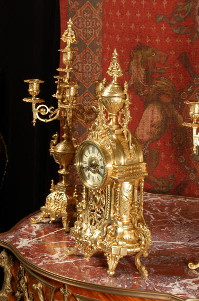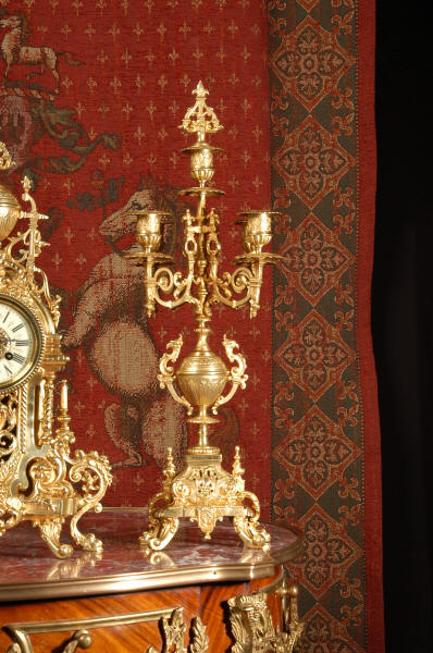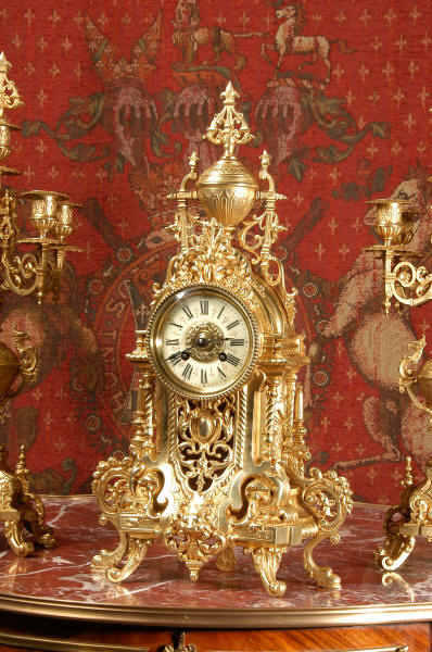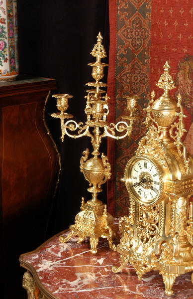 ~ French - Circa 1880 ~ ~~ Excellent condition, fully overhauled & running ~~ A stunning antique French brass clock set, classical in style and in excellent clean and bright condition. The clock features a fretted panel to the front allowing the pendulum to be glimpsed swinging within the case. Clock case and candelabra are mounted with mythical creatures and have elegant scroll feet. Candelabra have the original snuffers which sit in the central sconce to match the clock. The dial is enamel on copper with a brass centre. It is complete with blued steel hands and convex glass. The French movement is of high quality and is in excellent clean and running condition having been fully overhauled by our clockmaker. Pendulum is a replacement. It runs for 8 days and strikes the hours and halves on a bell. Click the video clip below to hear the bell and watch the clock running! Condition of the case is