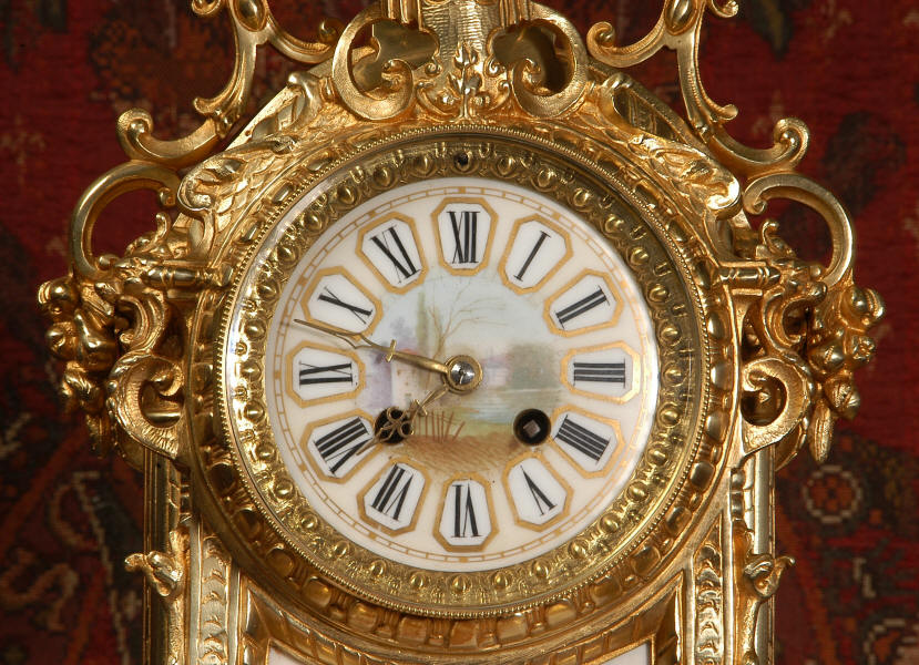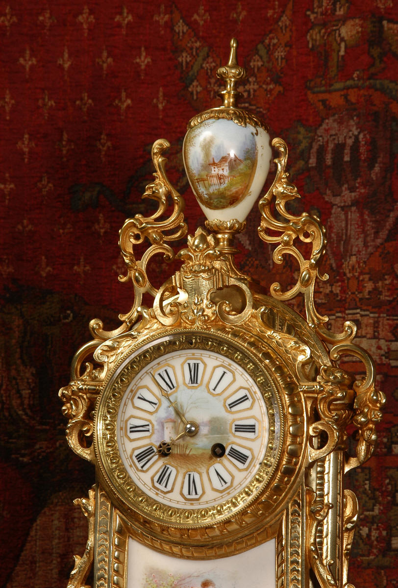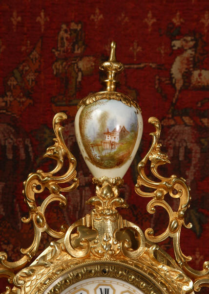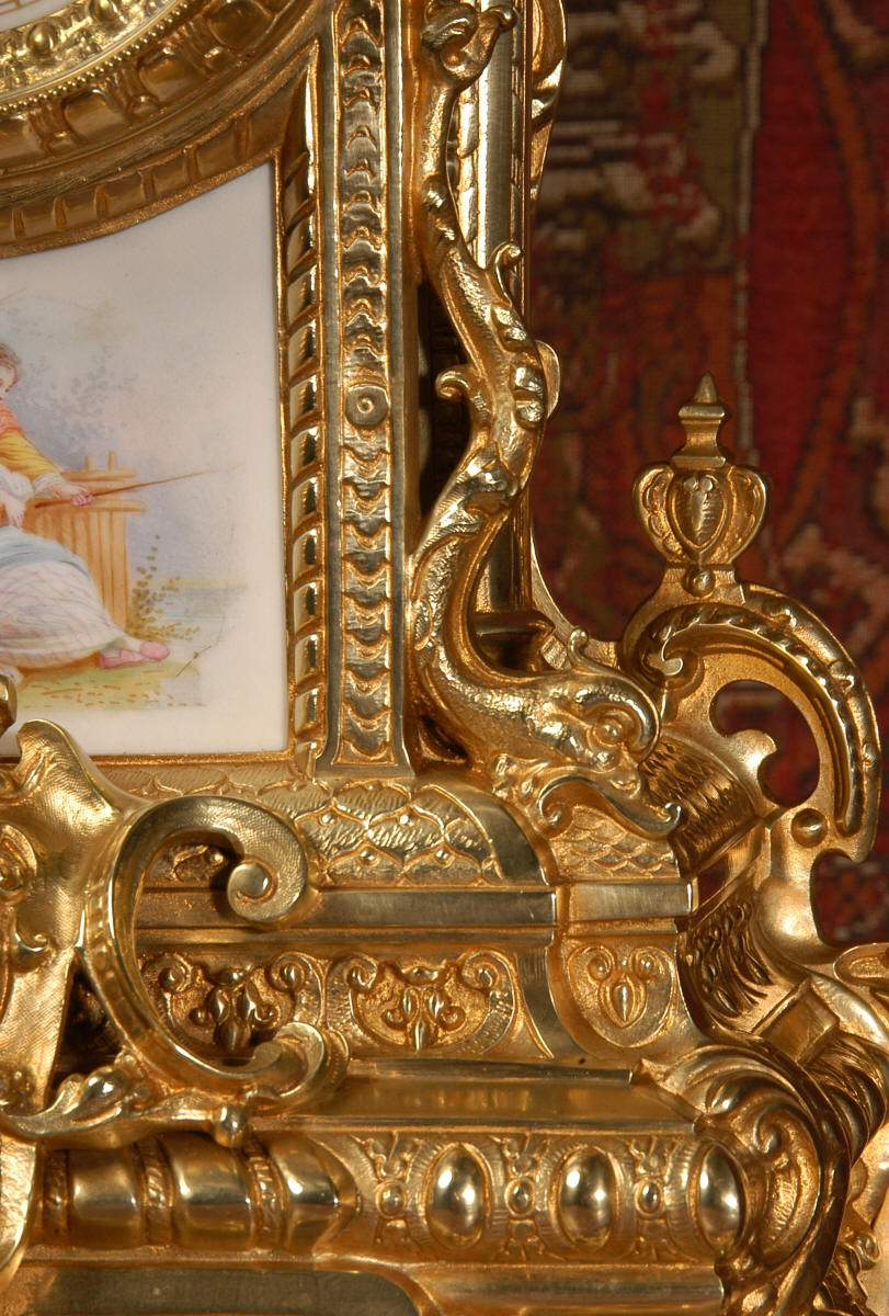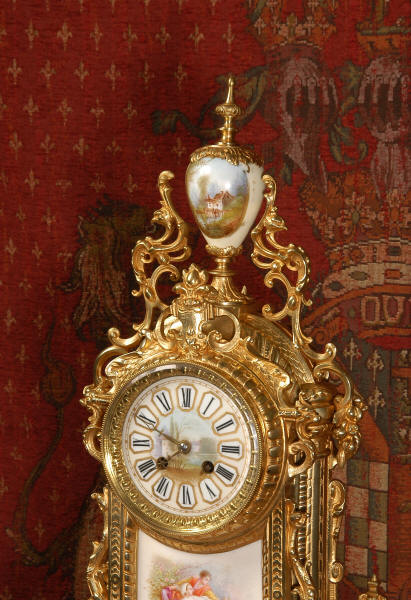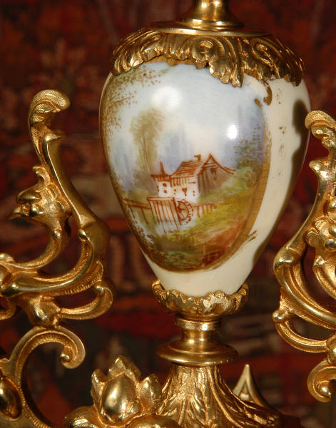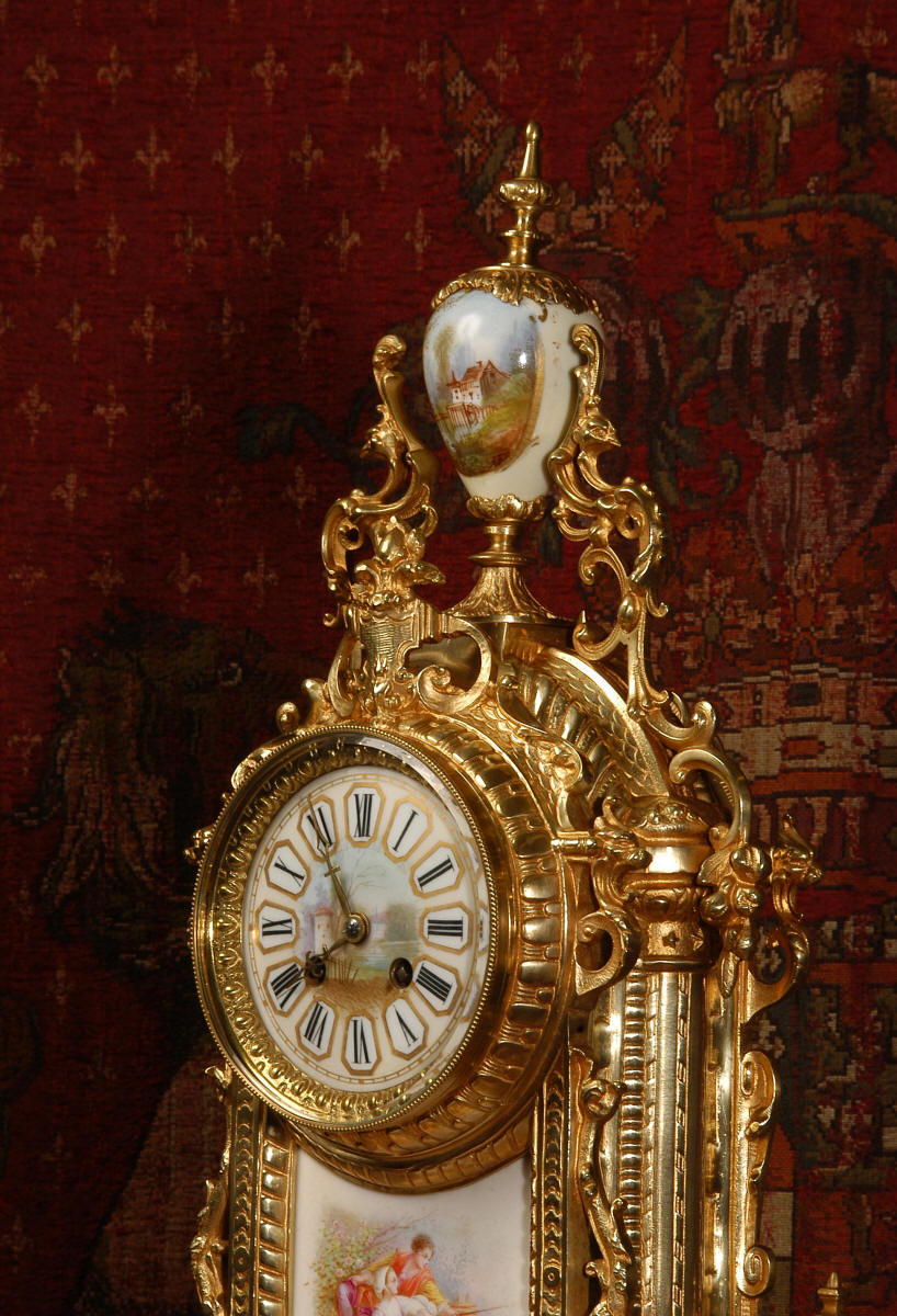 Condition of the case is excellent with clean and bright finish and there are no losses. There is some very very minor wear to the original gilding on the high spots. The porcelain is in excellent condition, no chips or scratches. There is some rubbing to the over glaze gilt decoration, most particularly on the urn.
