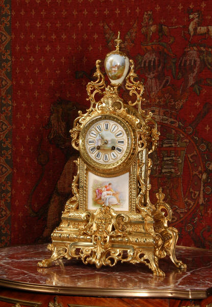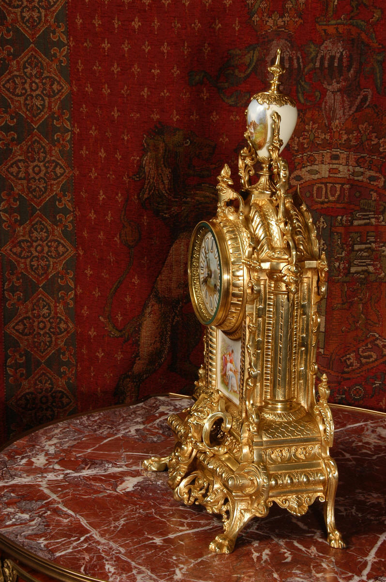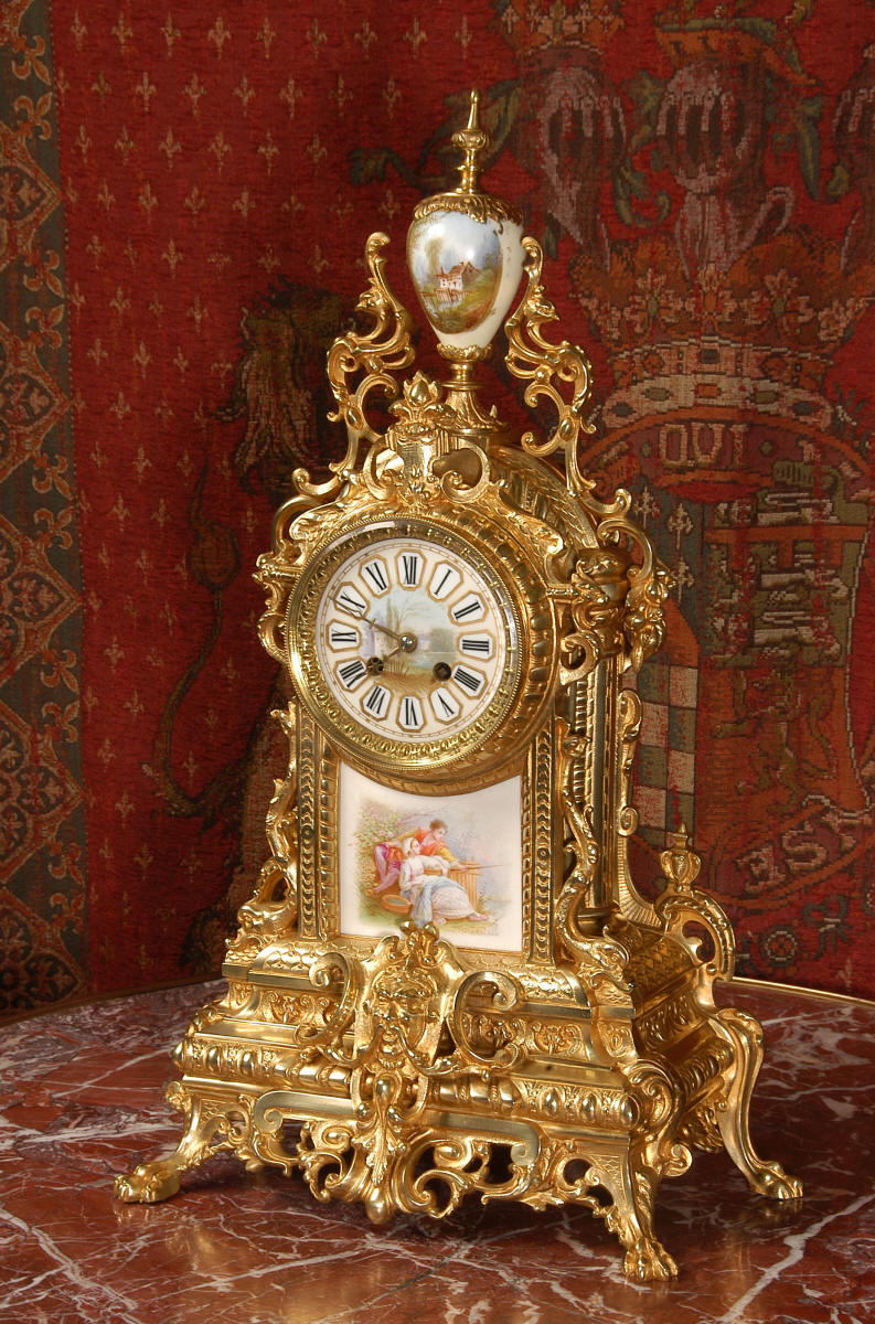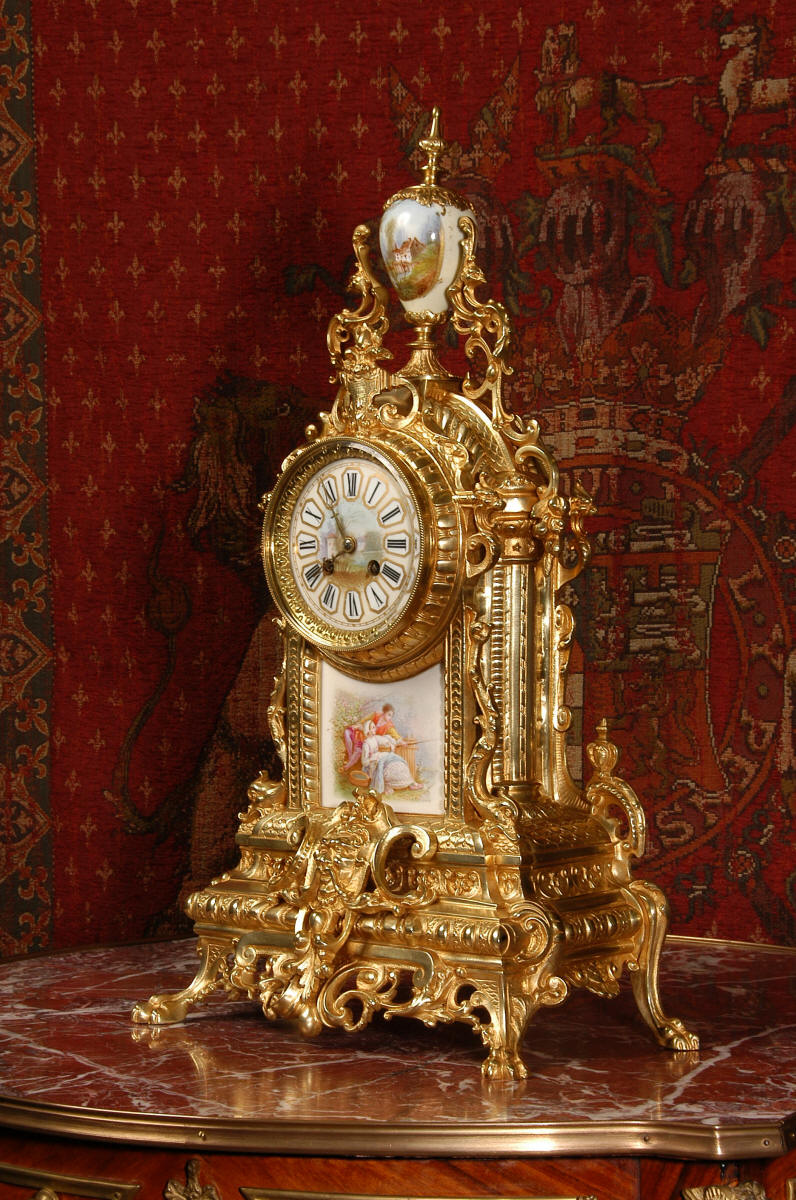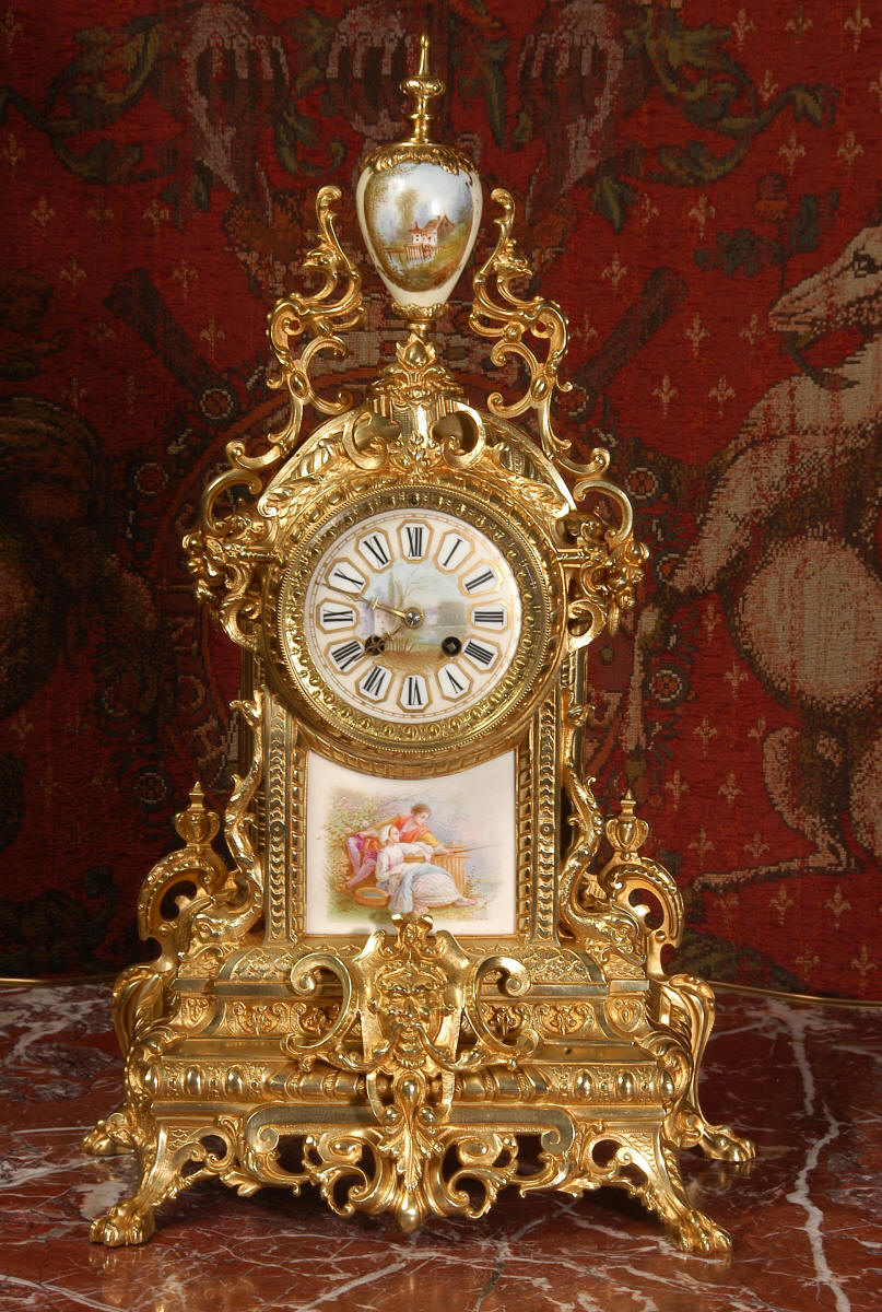 Condition of the case is excellent with clean and bright finish and there are no losses. There is some very very minor wear to the original gilding on the high spots. The porcelain is in excellent condition, no chips or scratches. There is some rubbing to the over glaze gilt decoration, most particularly on the urn.