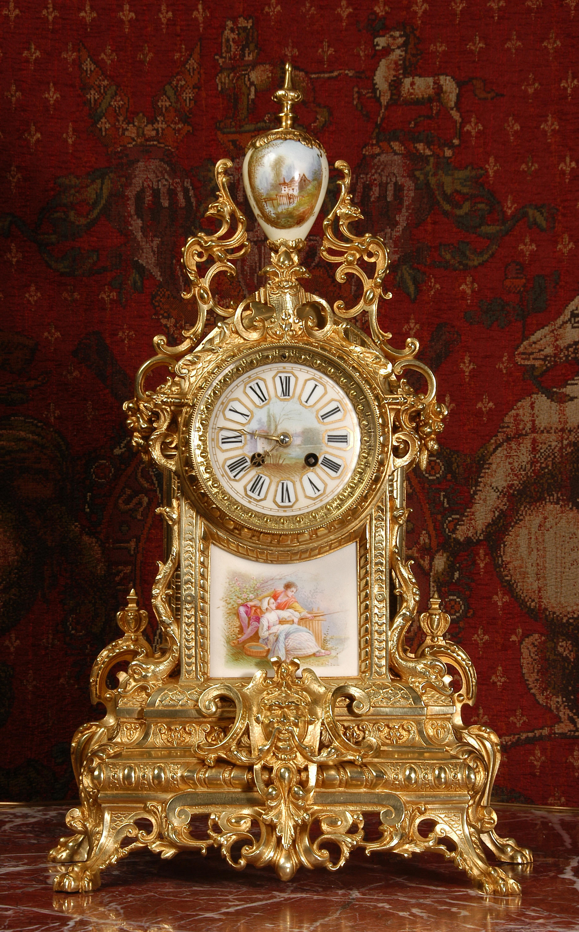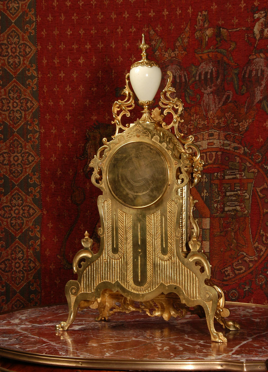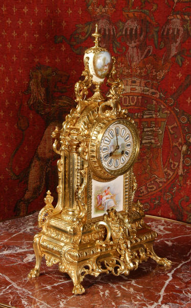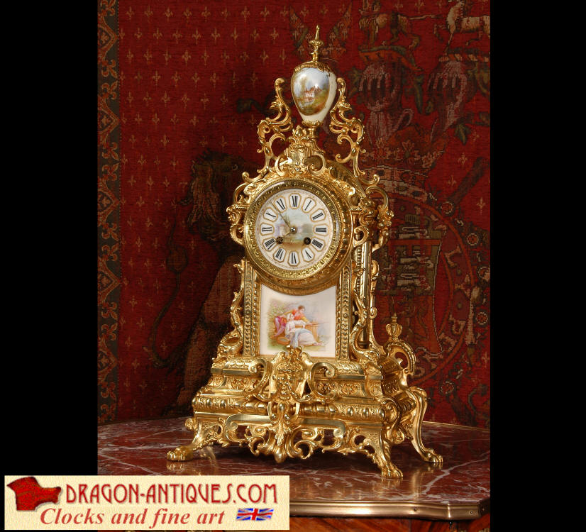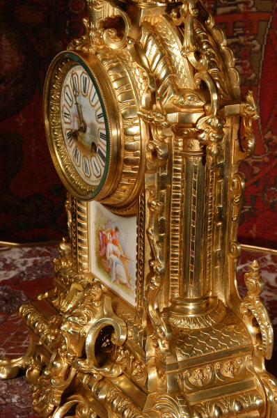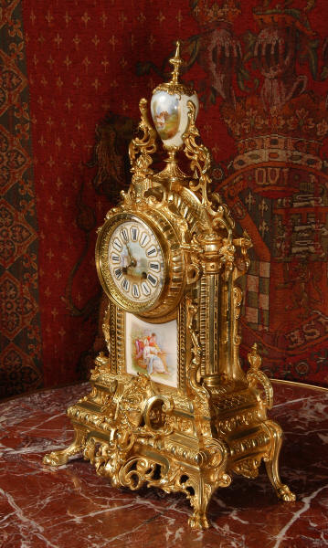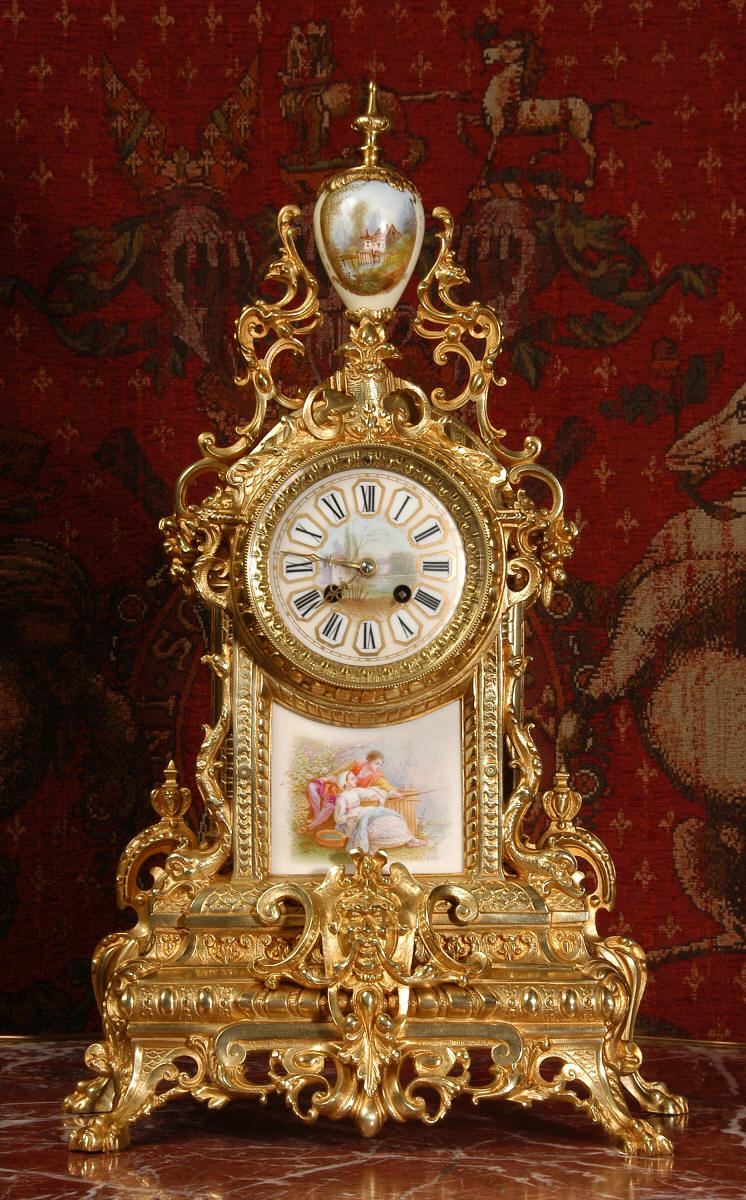 Condition of the case is excellent with clean and bright finish and there are no losses. There is some very very minor wear to the original gilding on the high spots. The porcelain is in excellent condition, no chips or scratches. There is some rubbing to the over glaze gilt decoration, most particularly on the urn.