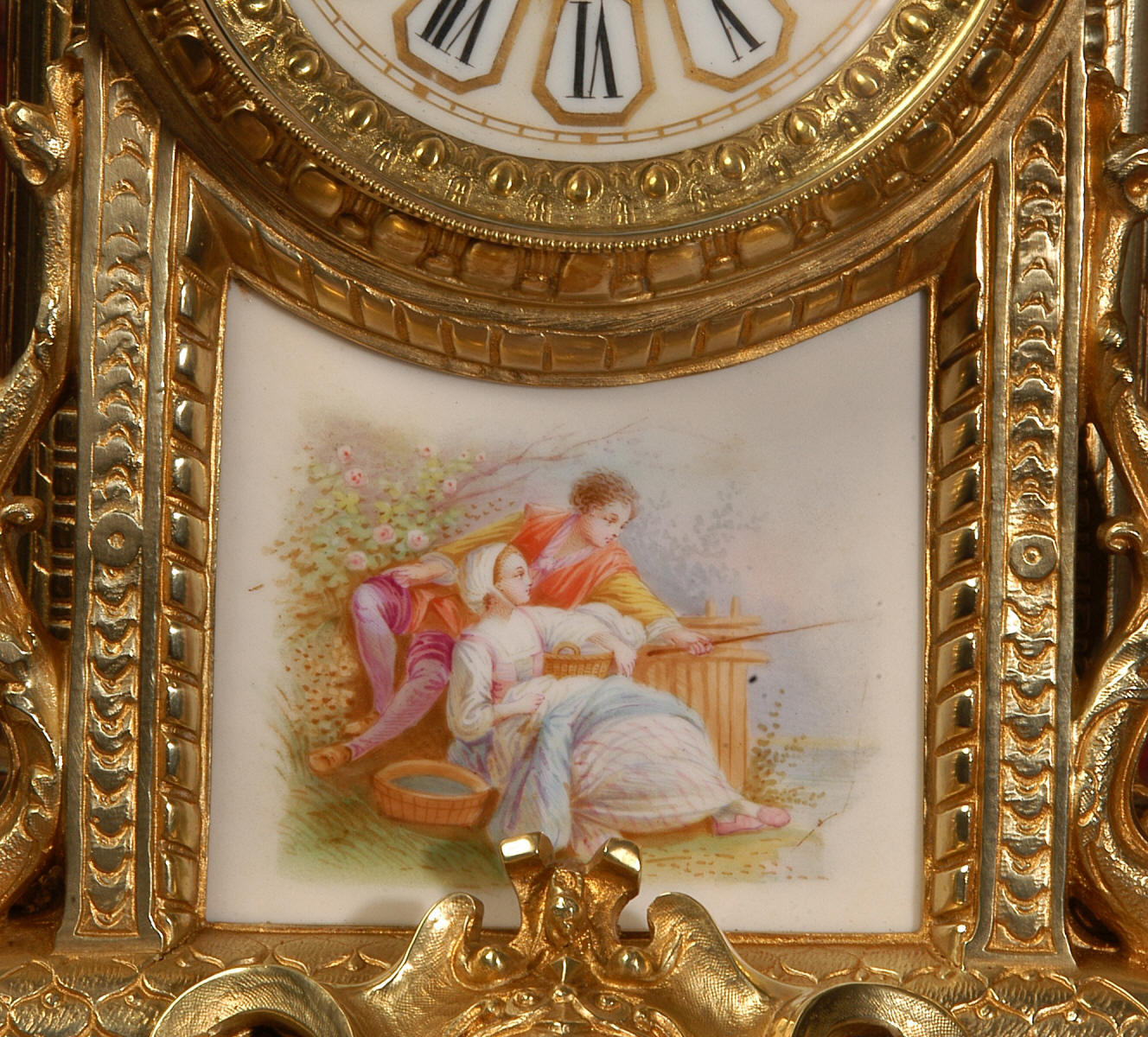 French clock featuring finely painted cream Sevres style porcelain. The panel