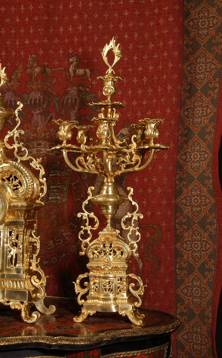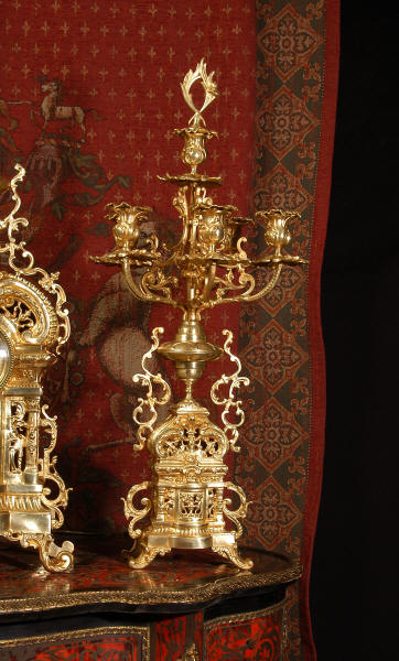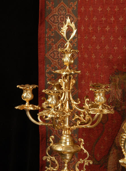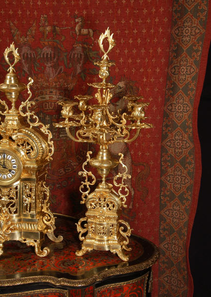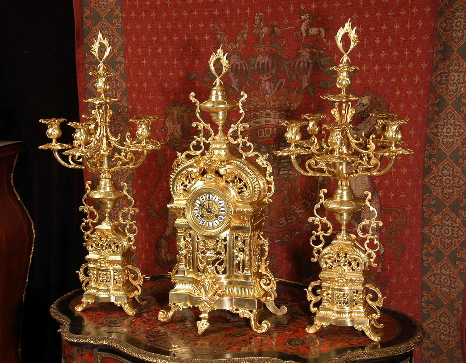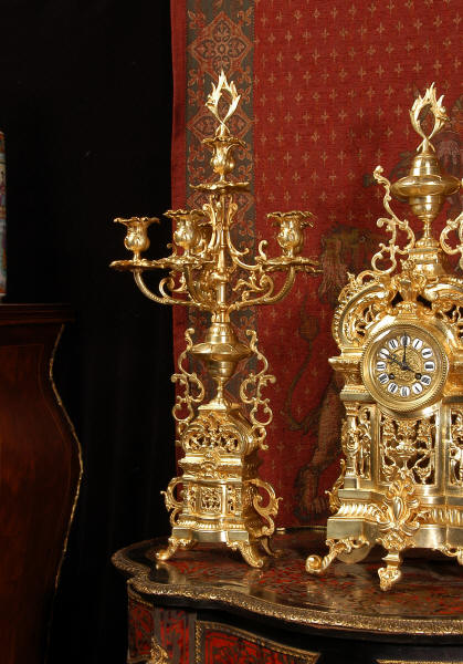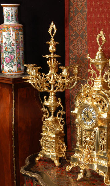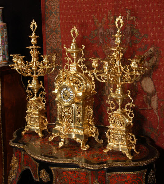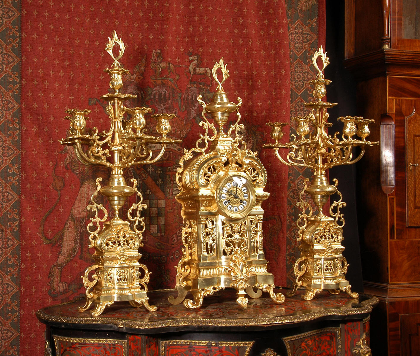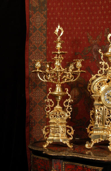 instructions supplied if required. Dimensions of clock: inches Height 27 3/4", Width 12 1/4", Depth 8" centimetres Height 70.5 cm, Width 31 cm, Depth 20.5 cm Dimensions of candelabra: inches Height 29 3/4", Width 12 1/2", Depth 12 1/2" centimetres Height 75.5 cm, Width 32 cm, Depth 32 cm