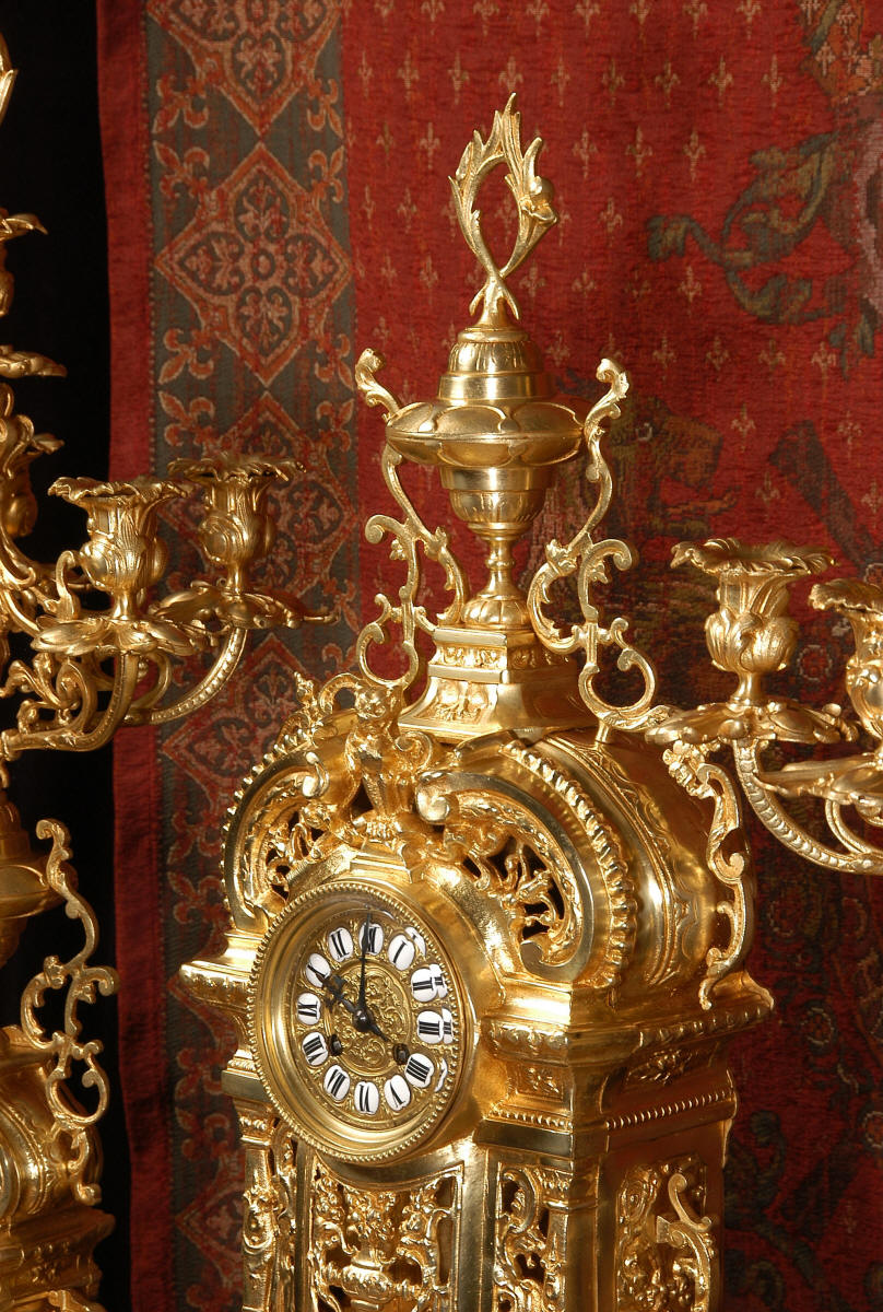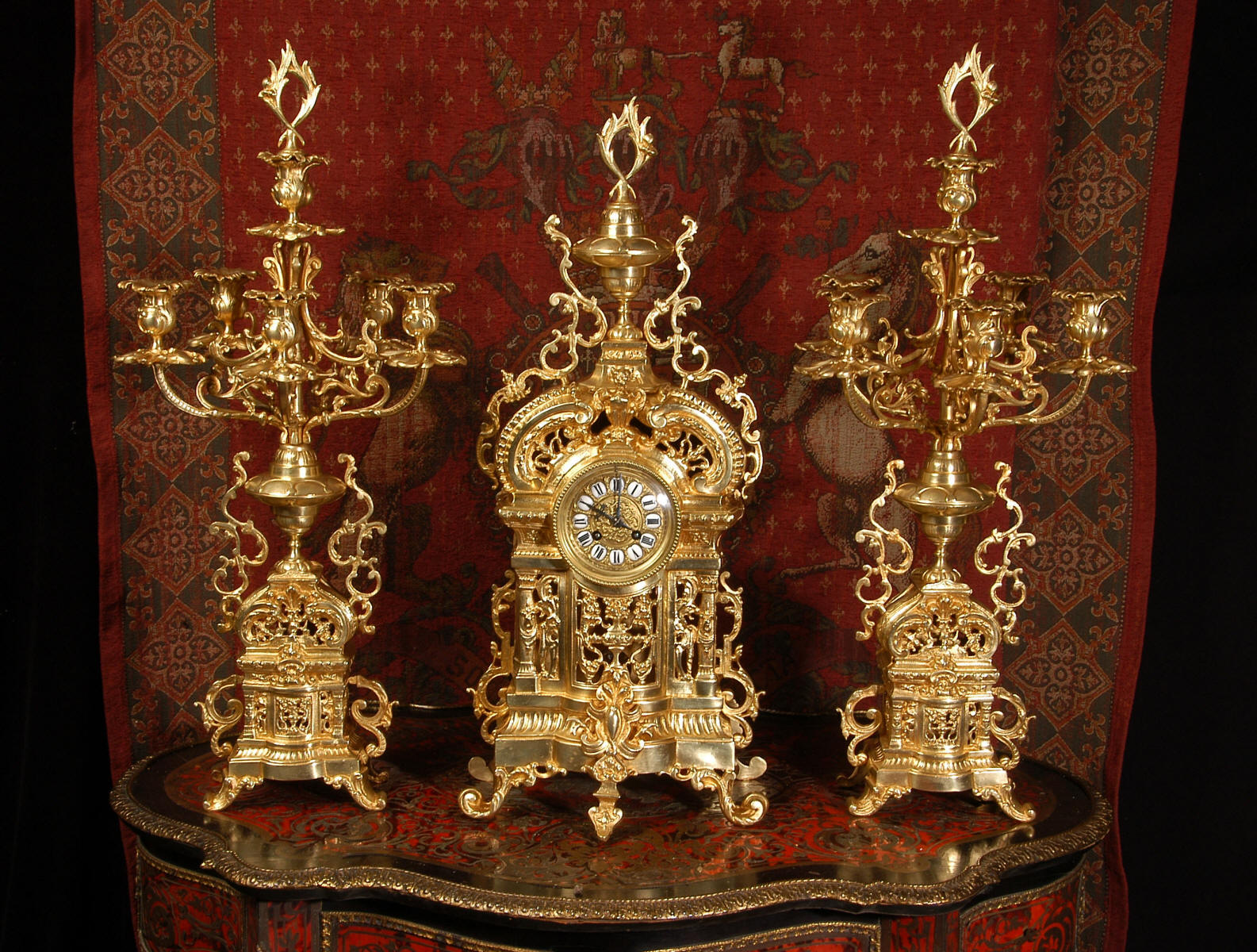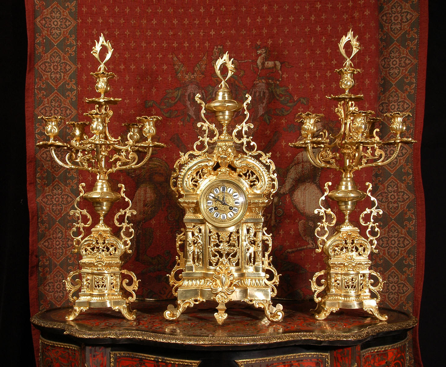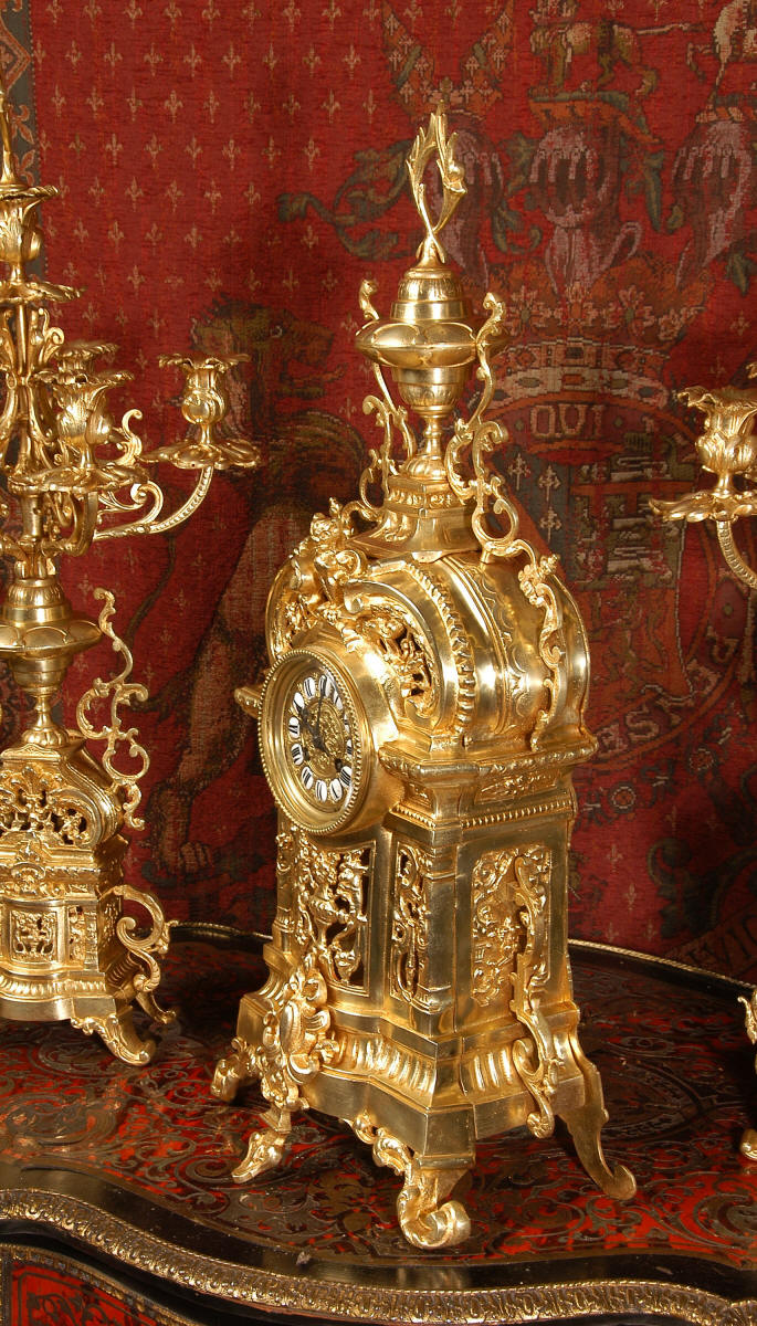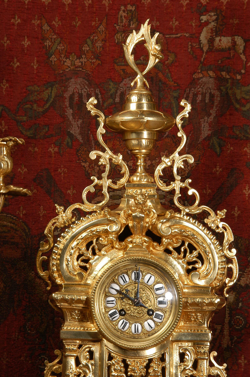 French gilt brass clock set, standing at 29 3/4" in height. It is in the Baroque