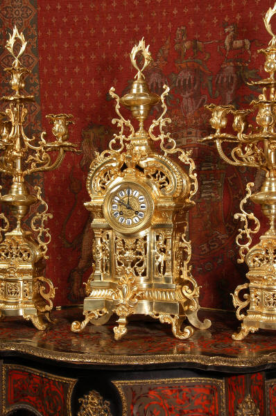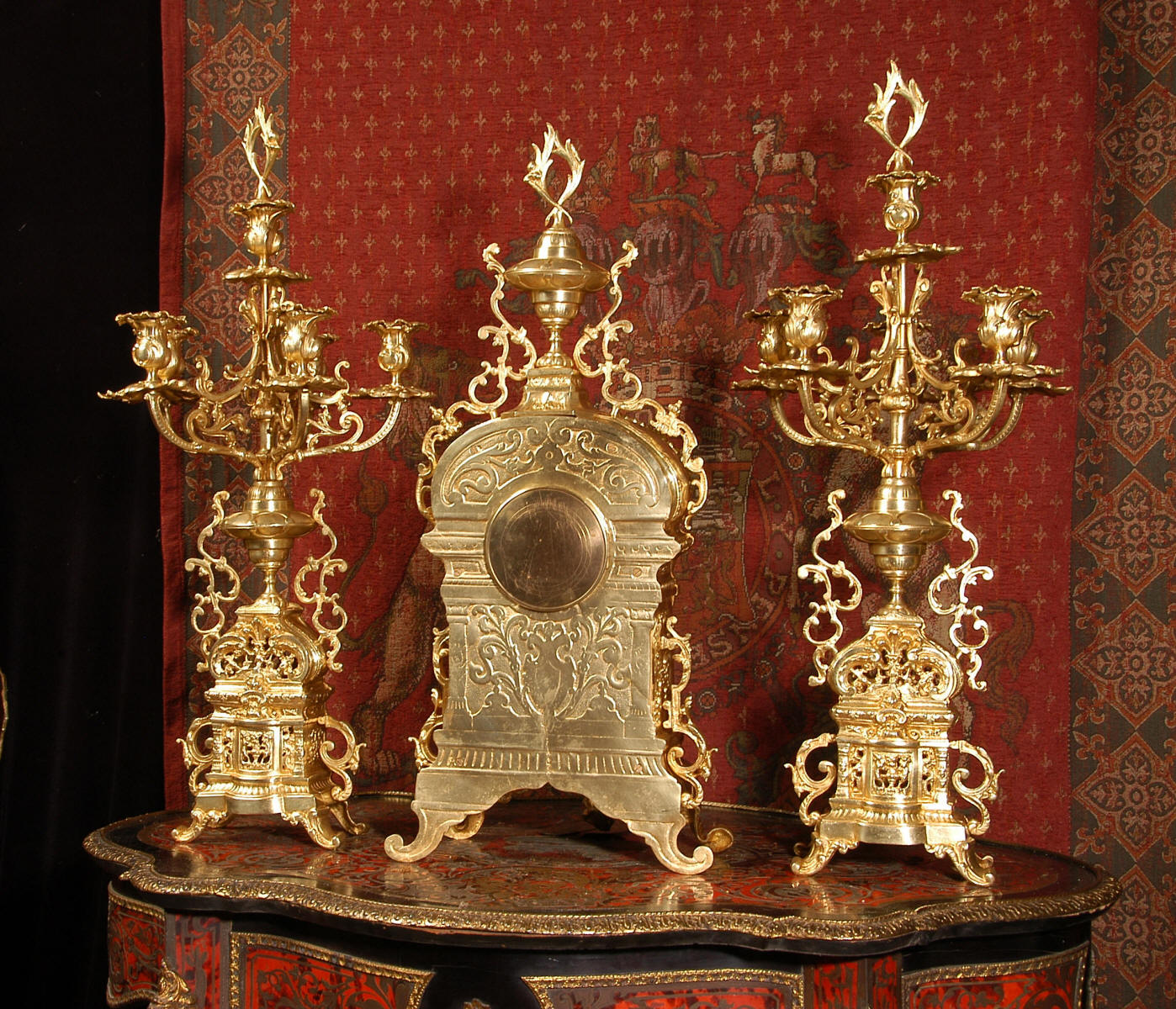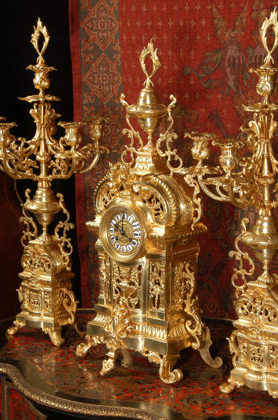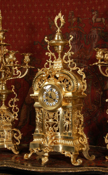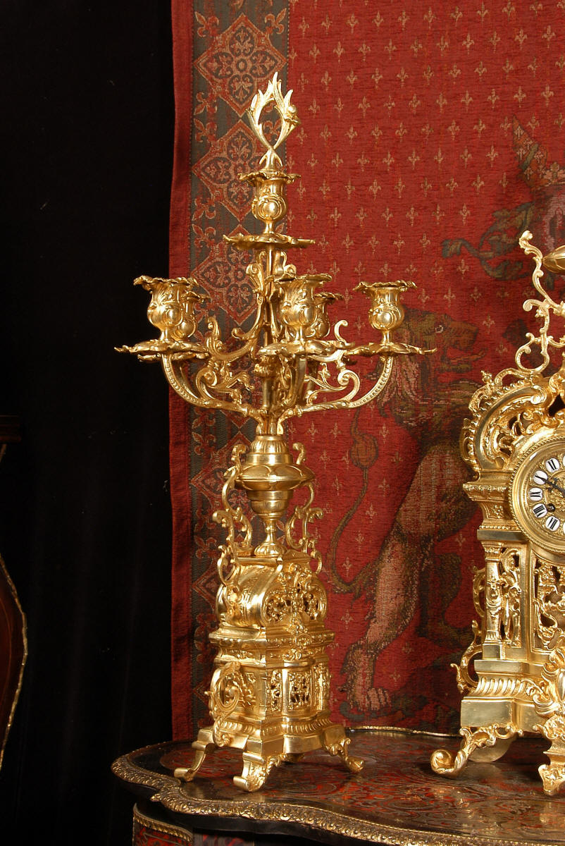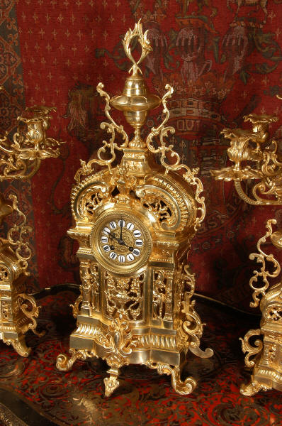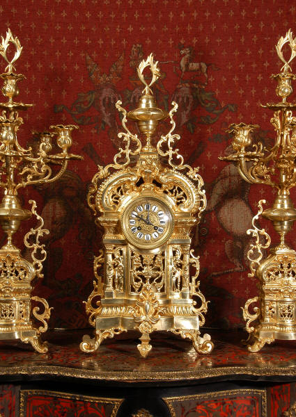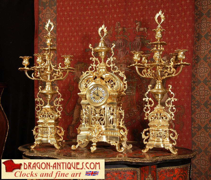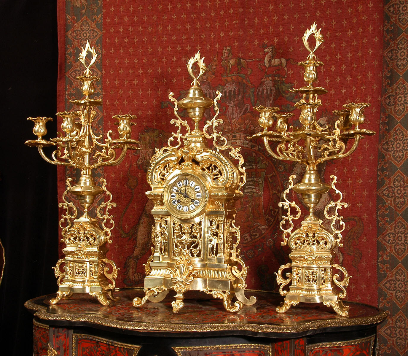 French gilt brass clock set, standing at 29 3/4" in height. It is in the Baroque