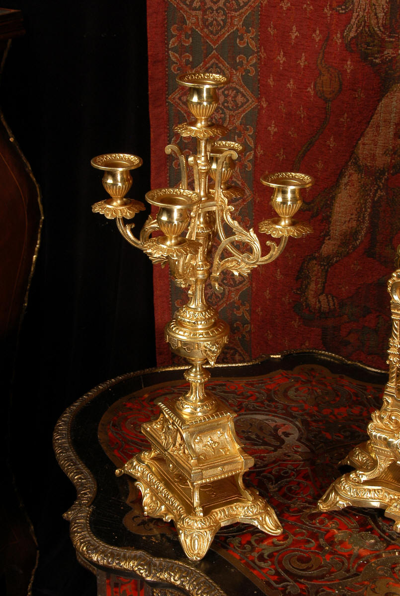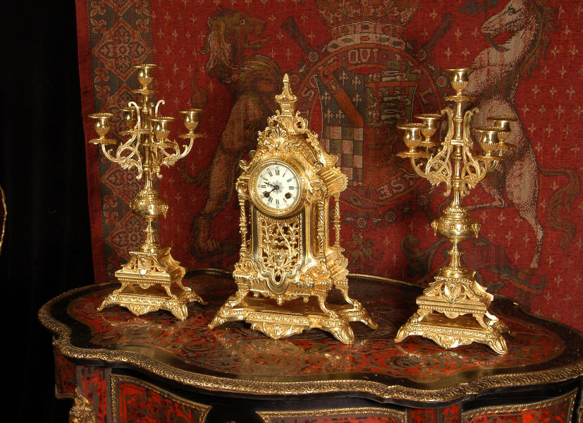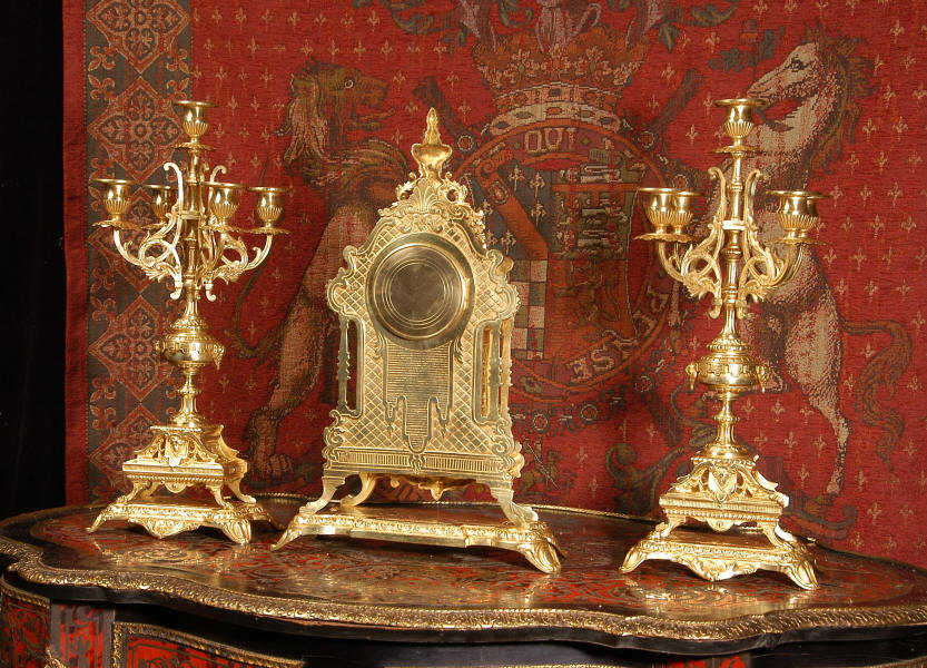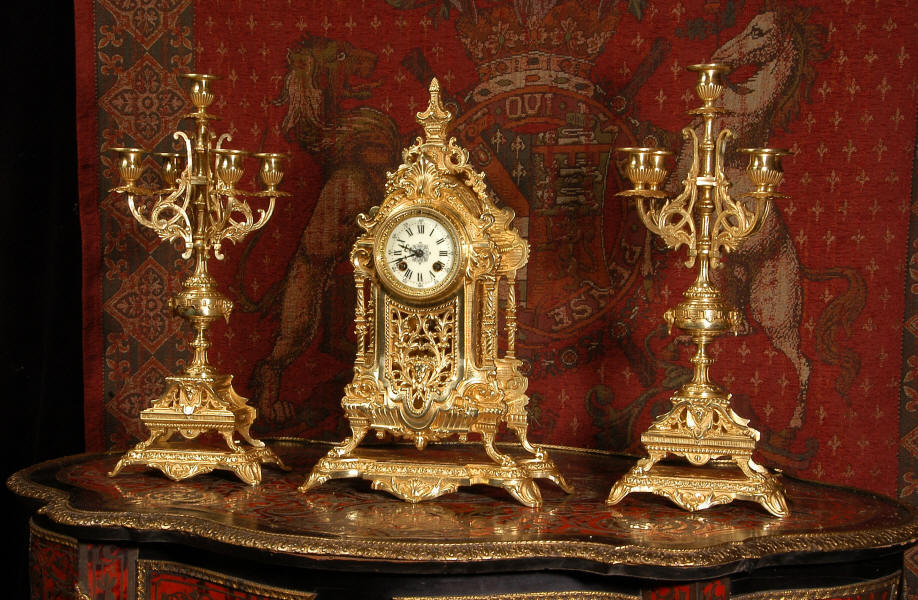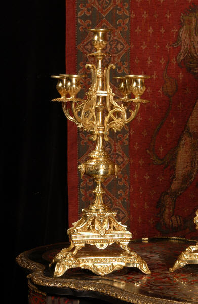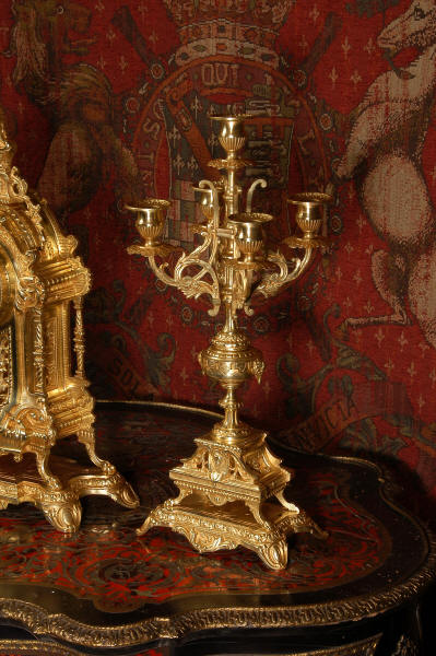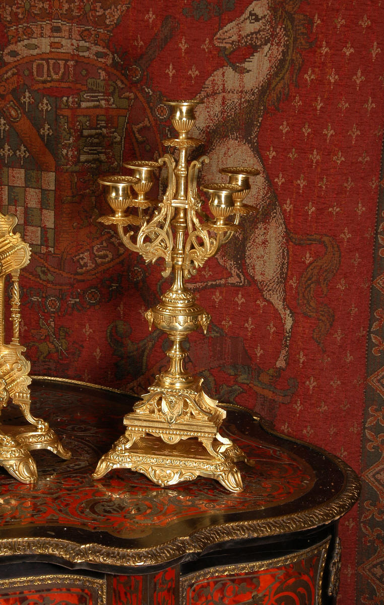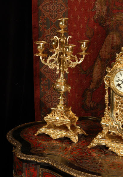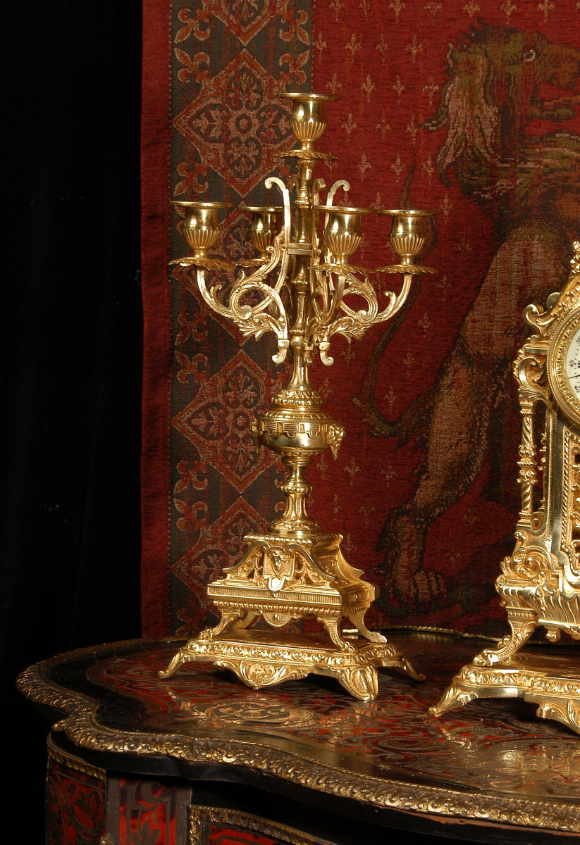 supplied if required. Dimensions of clock: inches Height 17 3/4", Width 11 3/4", Depth 5 1/2" centimetres Height 45 cm, Width 30 cm, Depth 14 cm Dimensions of candelabra: inches Height 18", Width 7", Depth 7" centimetres Height 46 cm, Width 18 cm, Depth 18 cm