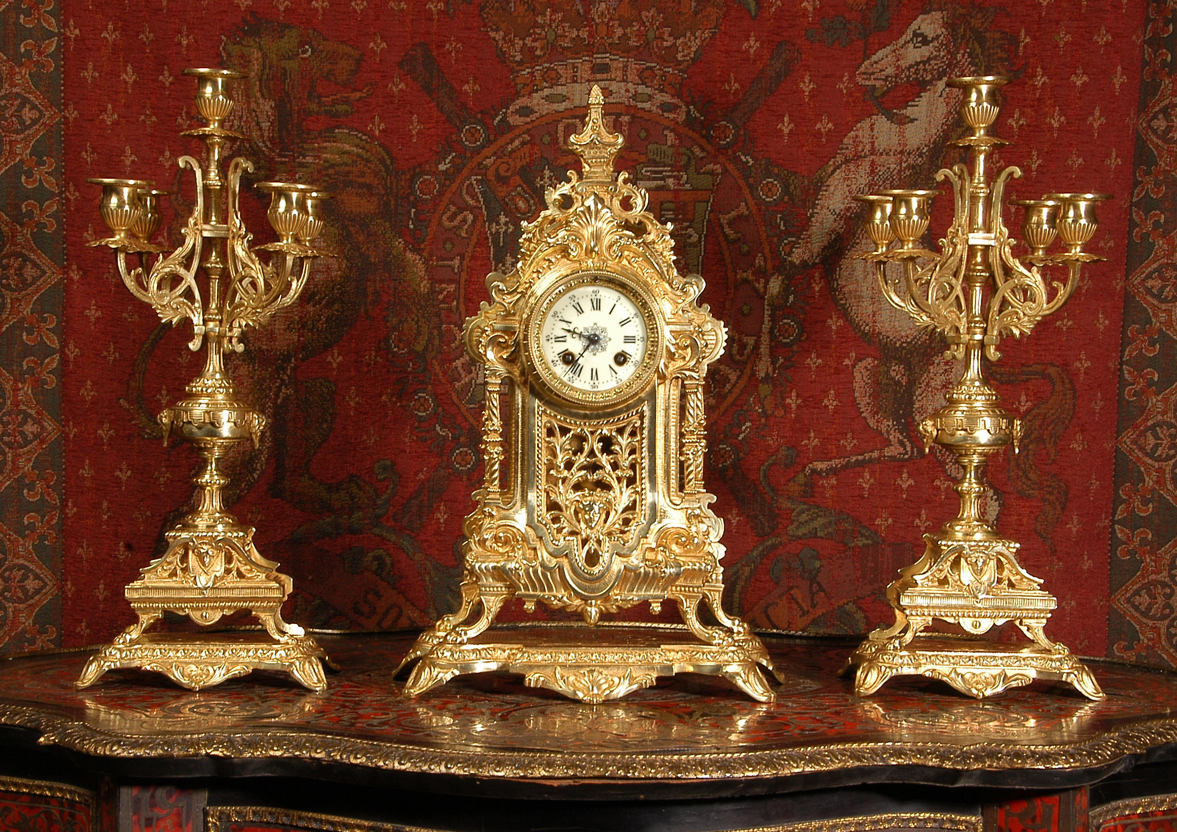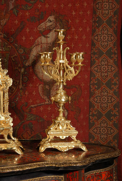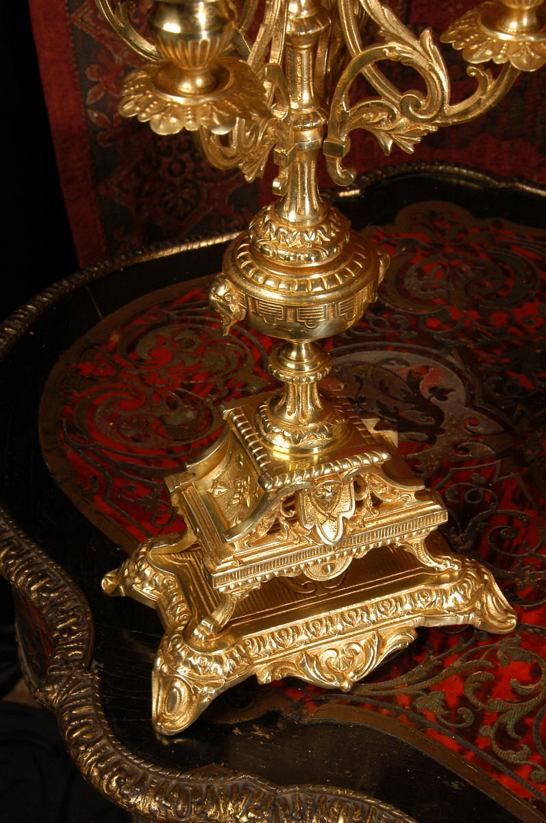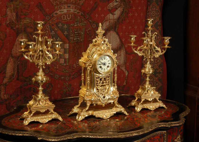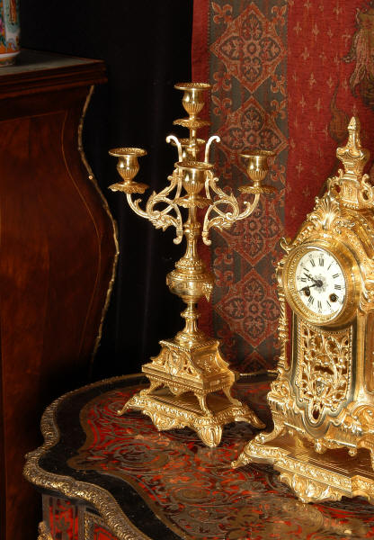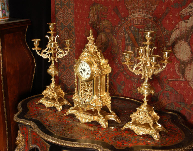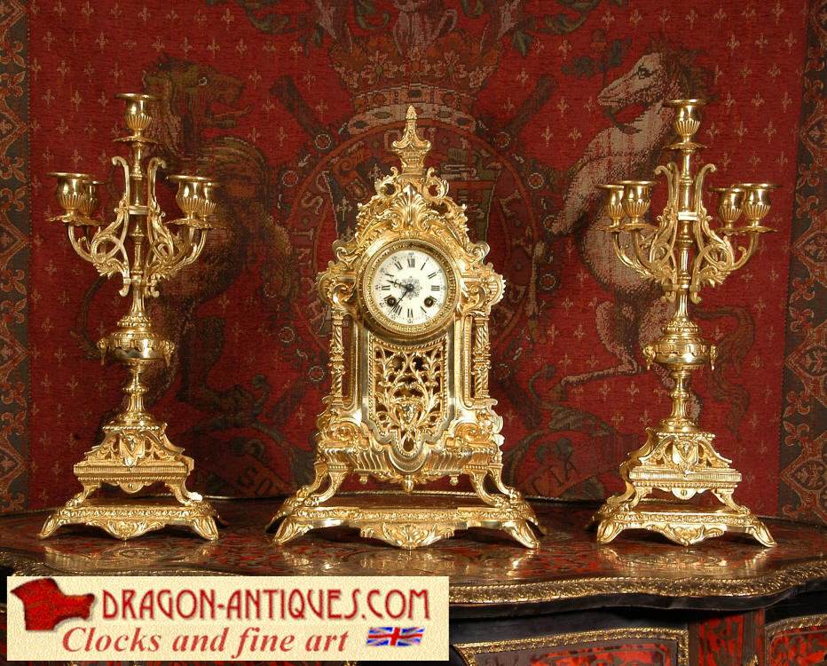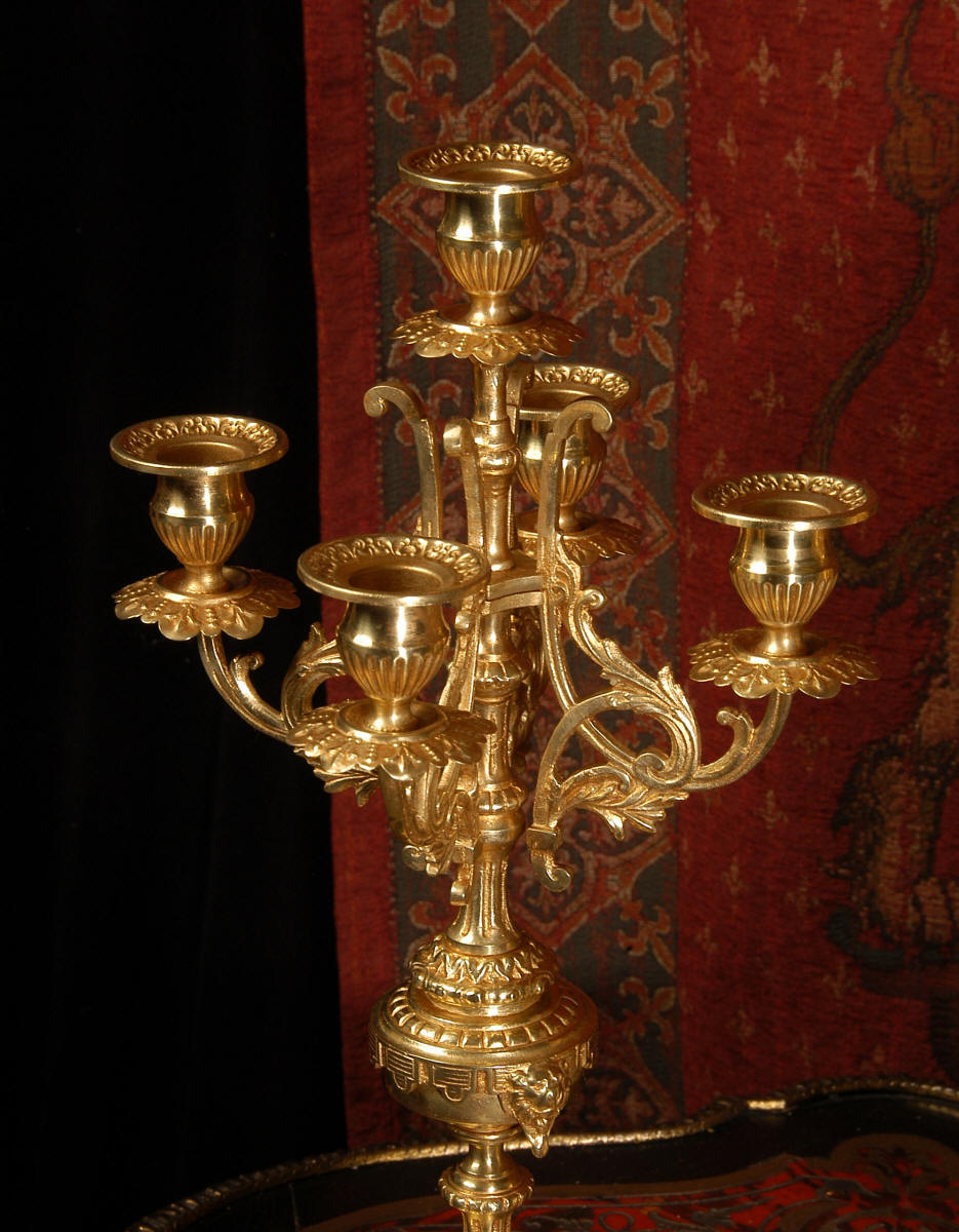 supplied if required. Dimensions of clock: inches Height 17 3/4", Width 11 3/4", Depth 5 1/2" centimetres Height 45 cm, Width 30 cm, Depth 14 cm Dimensions of candelabra: inches Height 18", Width 7", Depth 7" centimetres Height 46 cm, Width 18 cm, Depth 18 cm