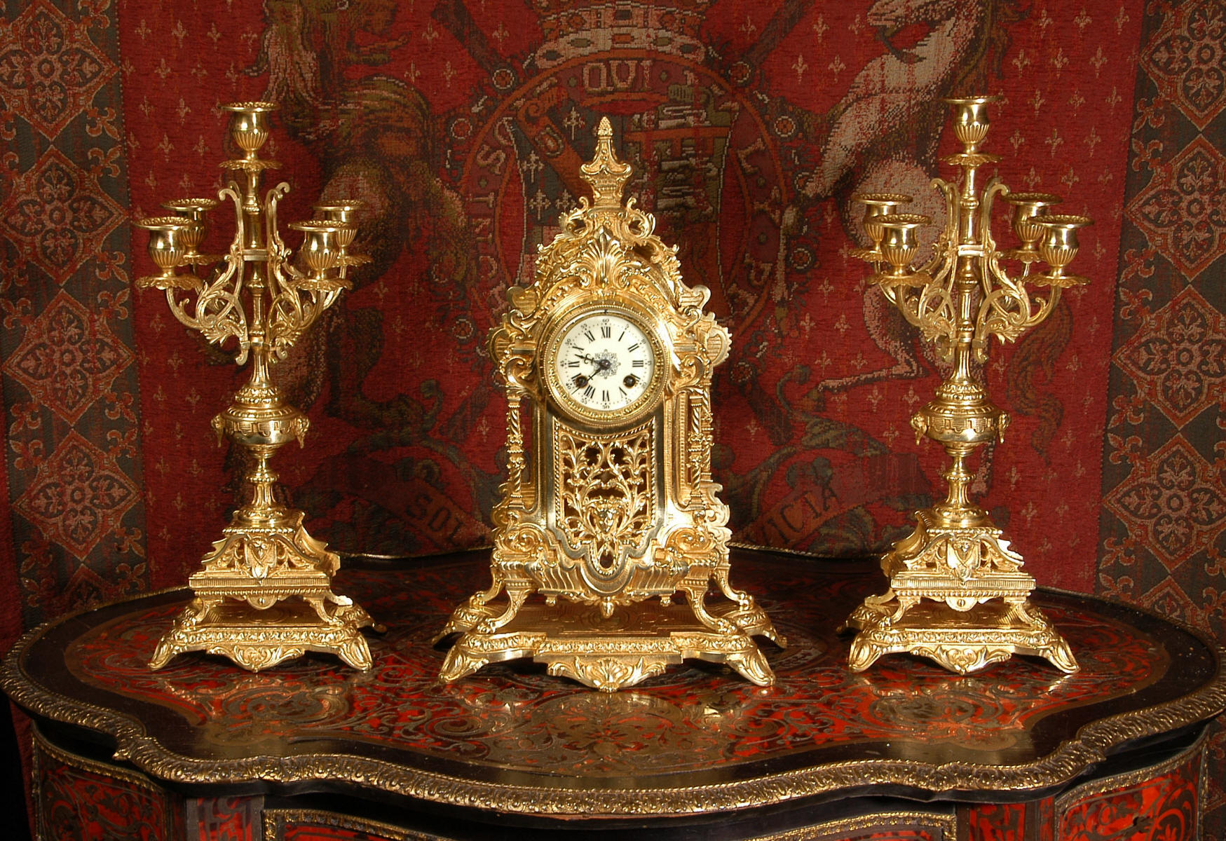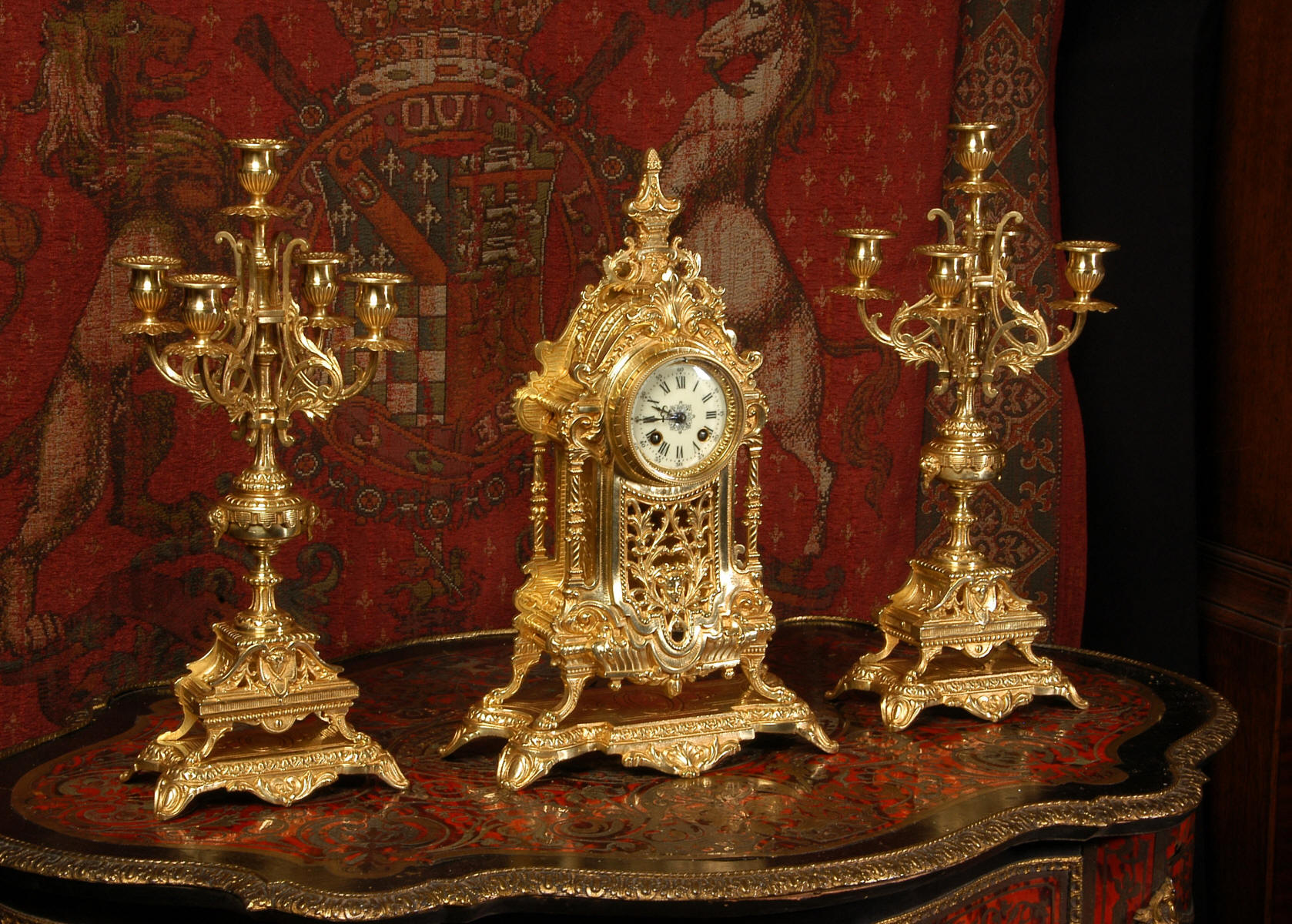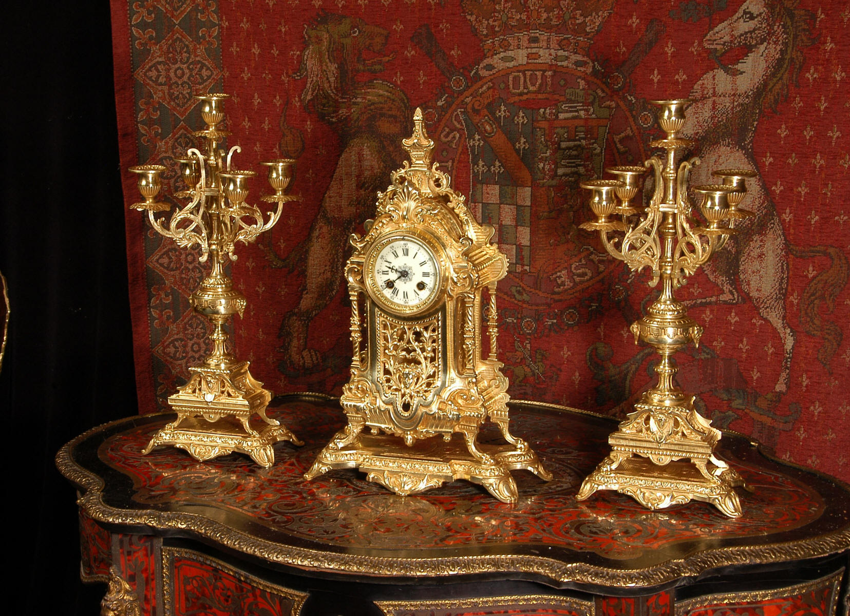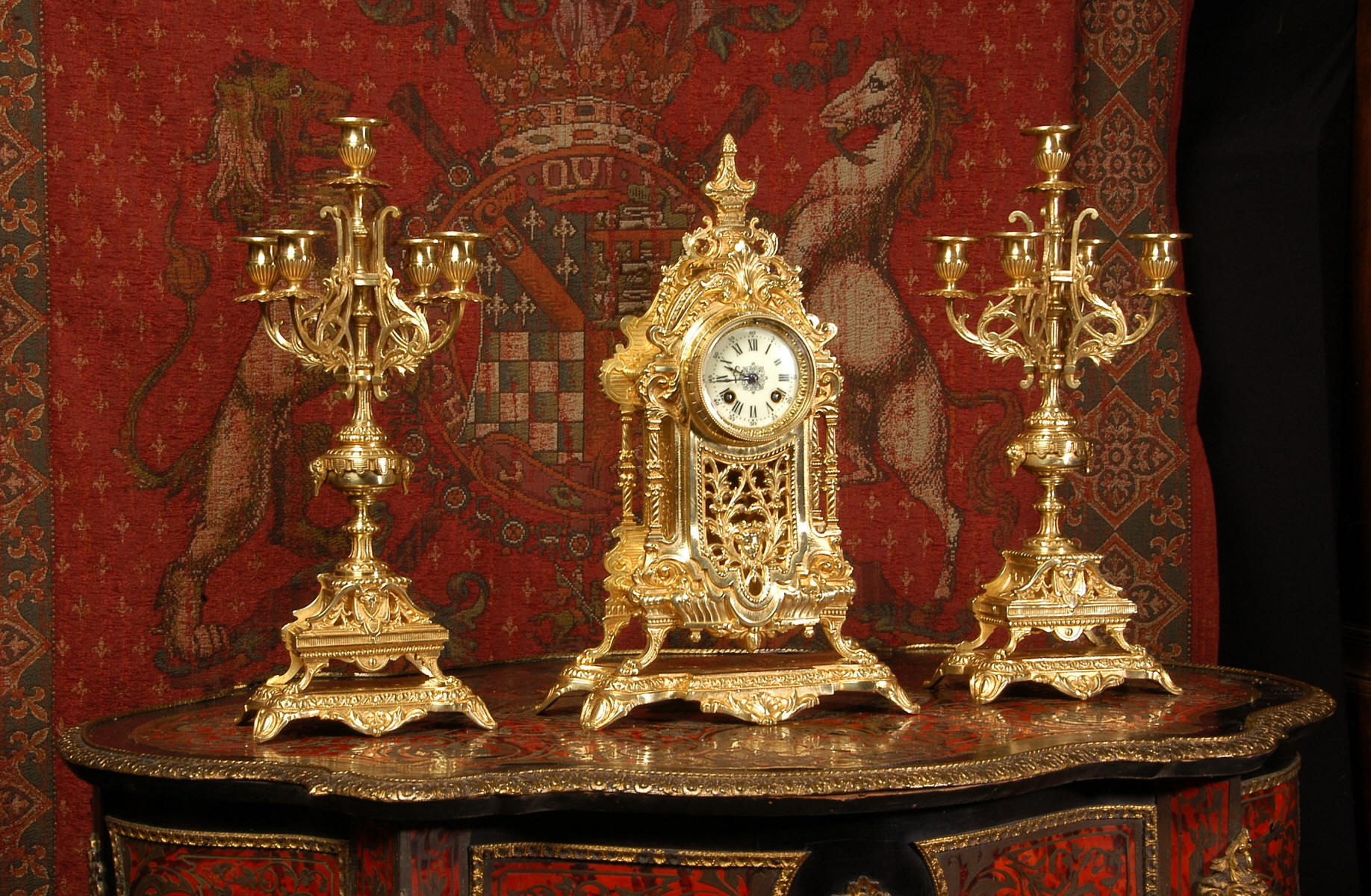 supplied if required. Dimensions of clock: inches Height 17 3/4", Width 11 3/4", Depth 5 1/2" centimetres Height 45 cm, Width 30 cm, Depth 14 cm Dimensions of candelabra: inches Height 18", Width 7", Depth 7" centimetres Height 46 cm, Width 18 cm, Depth 18 cm