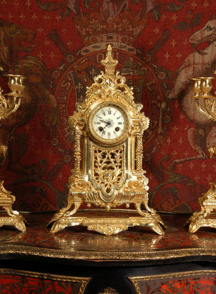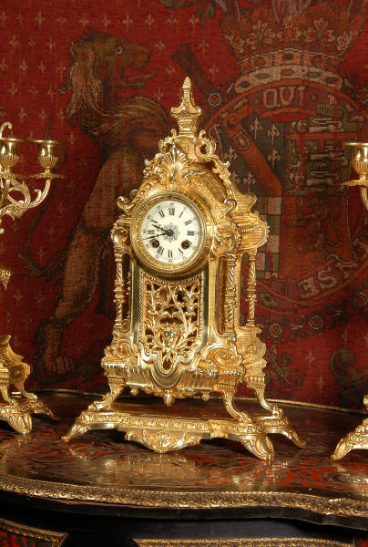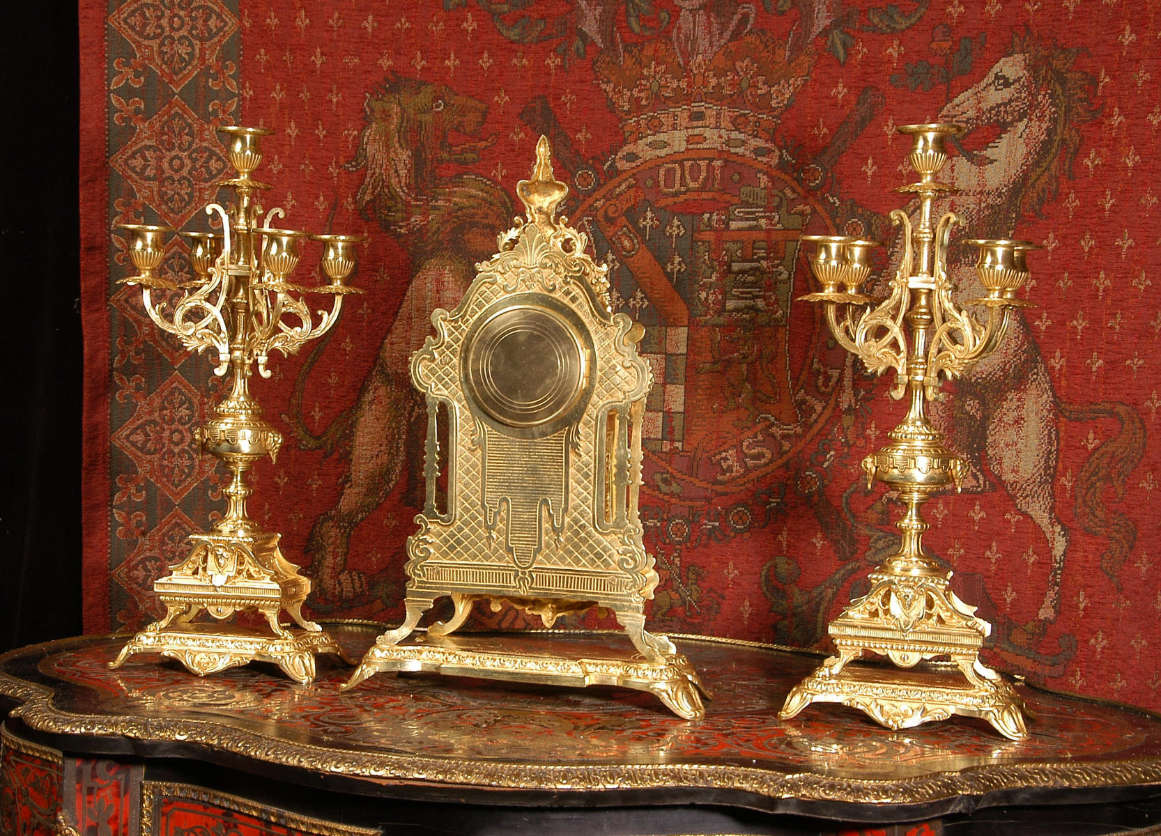 The clock and candelabra stand on integral bases and have hairy paw feet. The urns have lions mask handles and are surmounted by four branches.