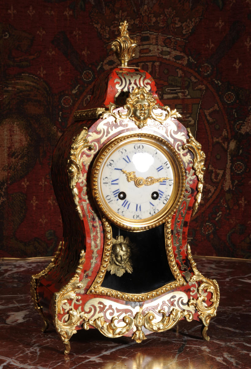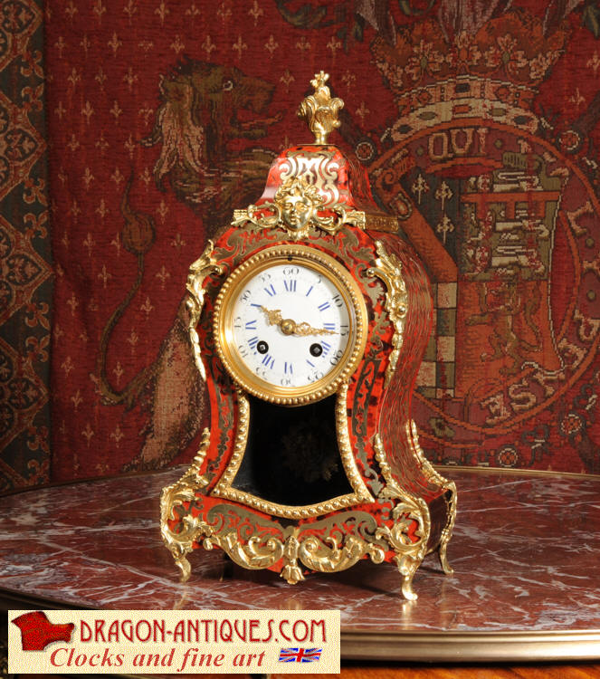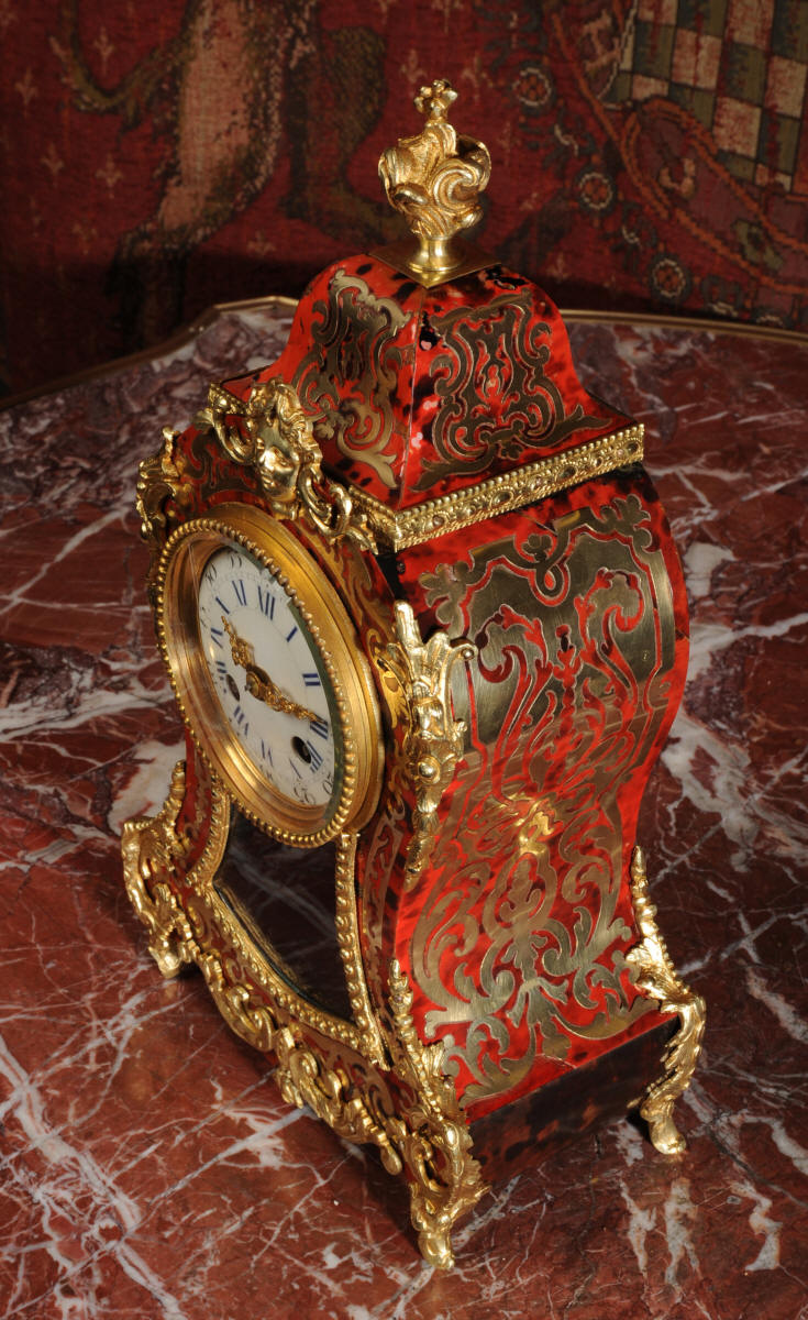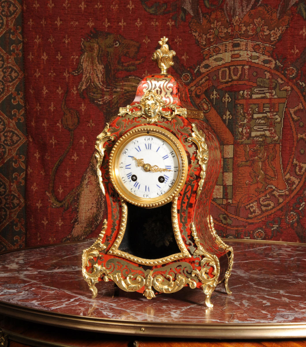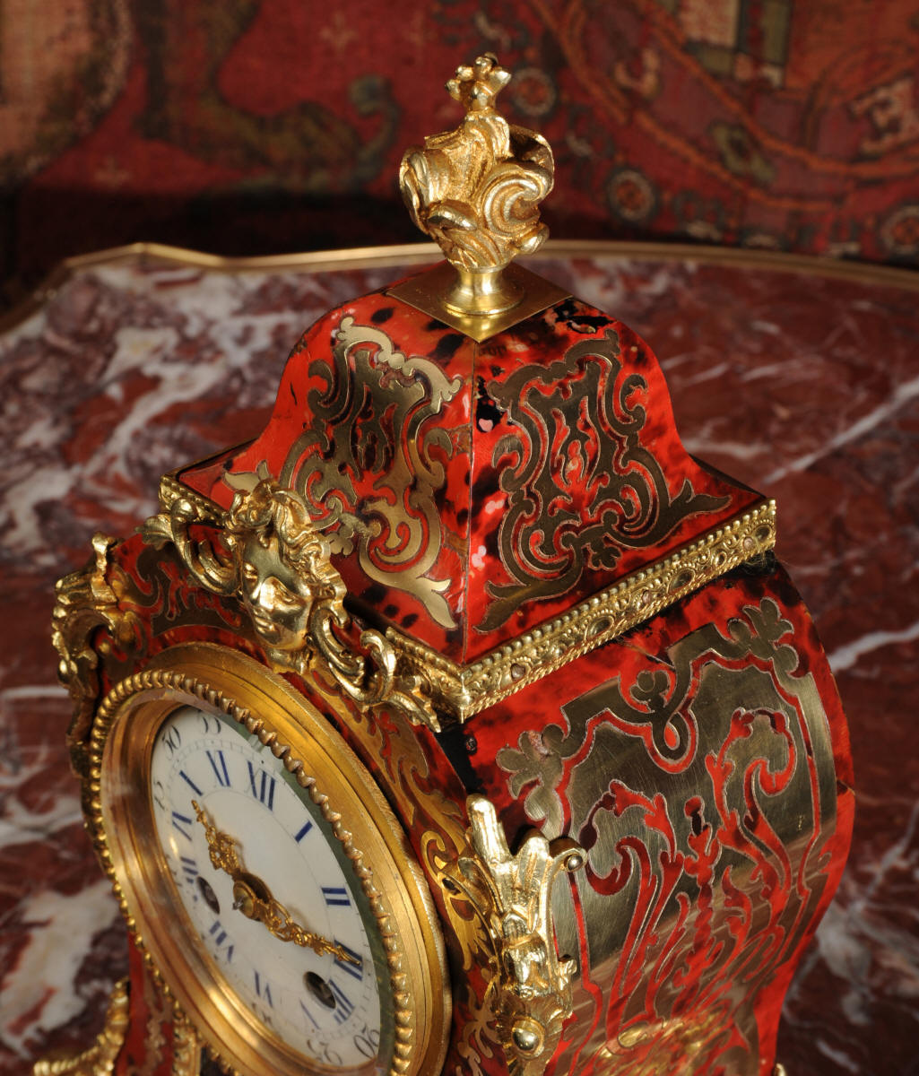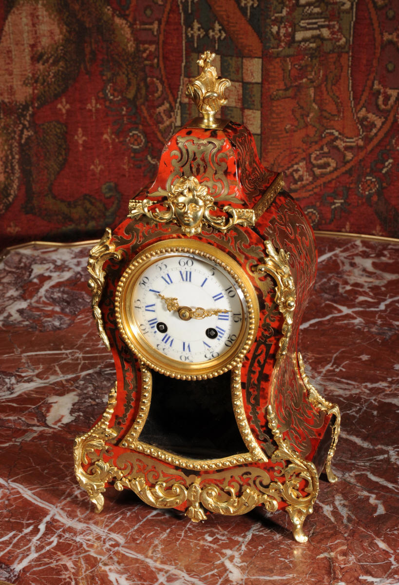 ~ French - Circa 1880 ~ ~~ Excellent condition, fully overhauled ~~ A beautiful original antique French boudoir clock of Boulle work in the Rococo style. The case is of waisted keyhole shape, veneered in red shell veneer, delicately inlaid with polished brass. It is mounted with fine ormolu, C scrolls, acanthus and a goddess mask. To the top is a Rococo urn. The front of the clock is glazed to allow the pendulum to be seen swinging within the case. It is the original ormolu sunburst pendulum featuring the sun god Mithras. The red shell veneer has mellowed to a lovely antique red-brown with plenty of character.