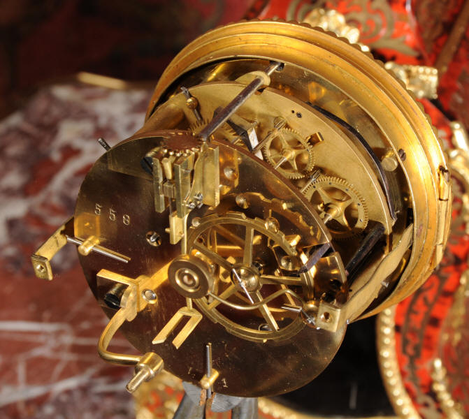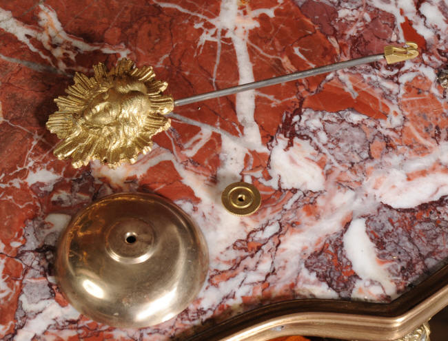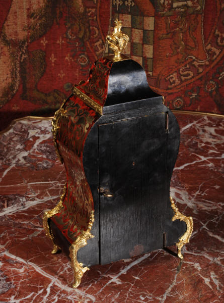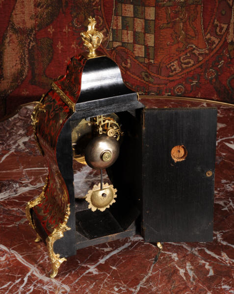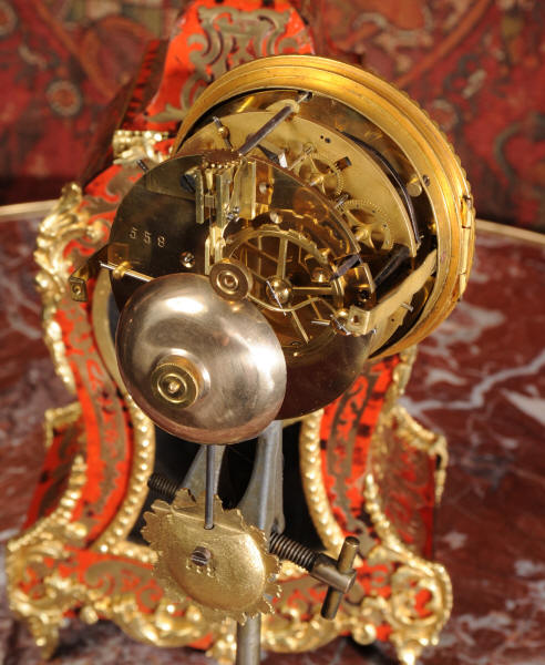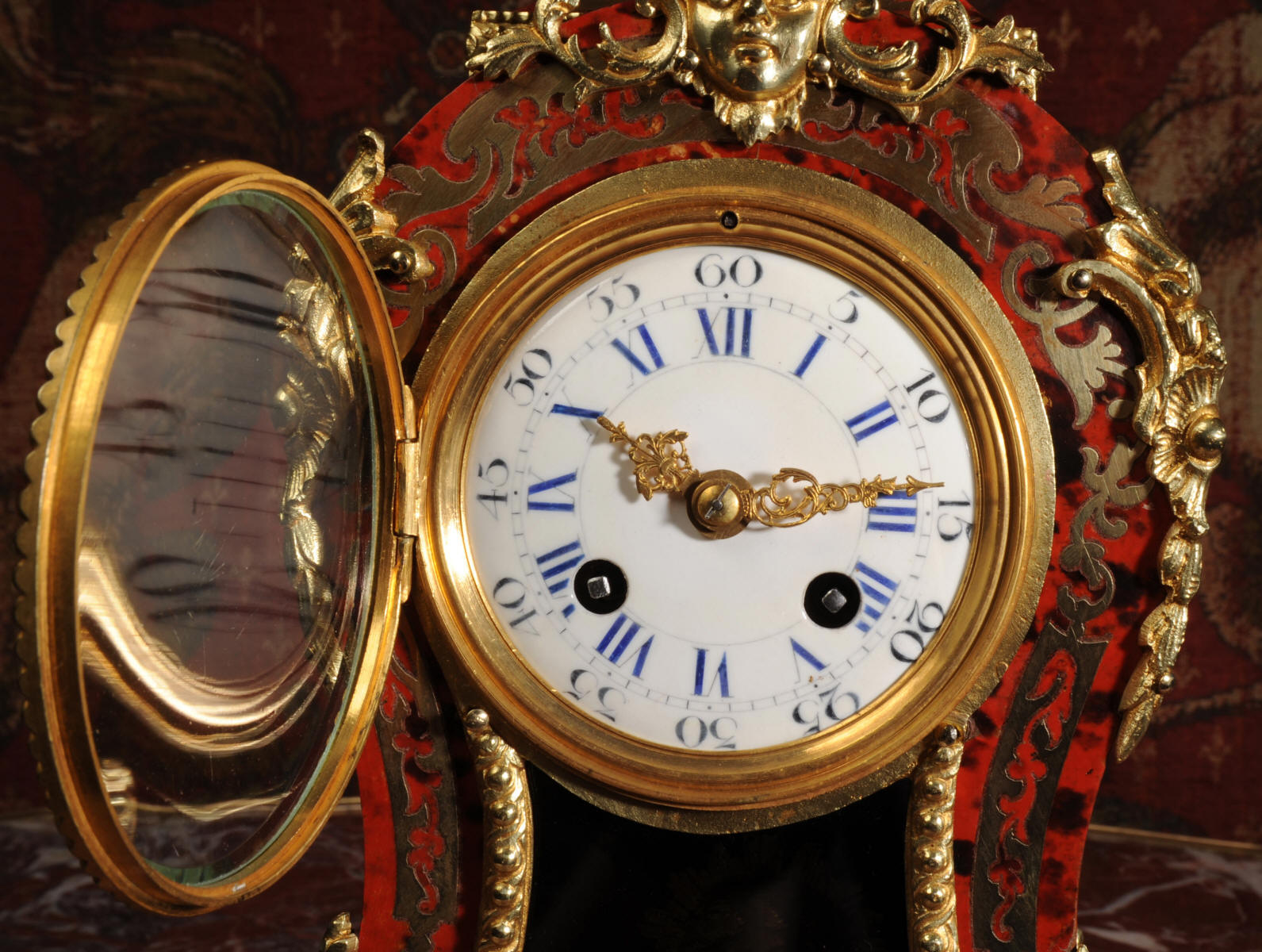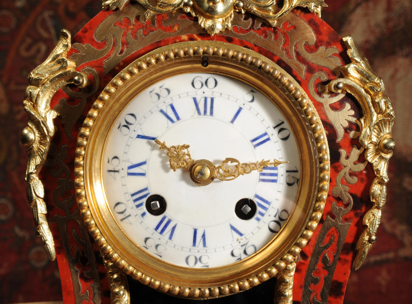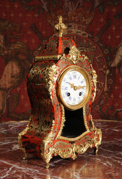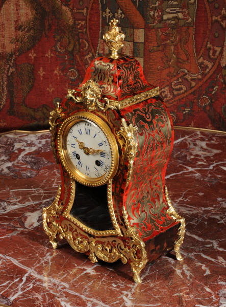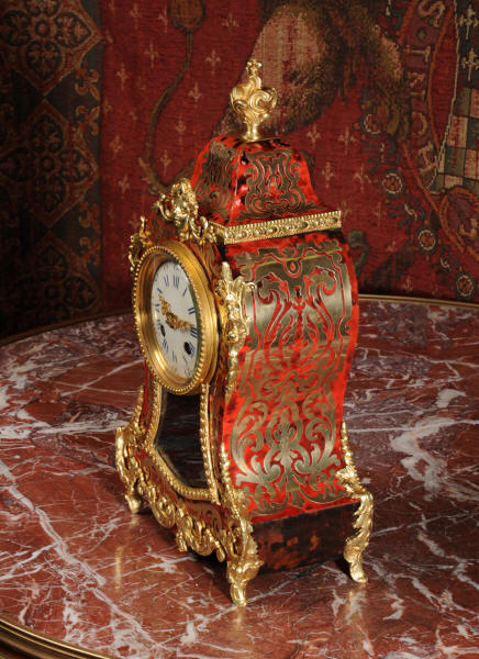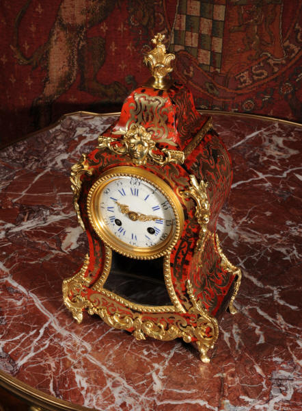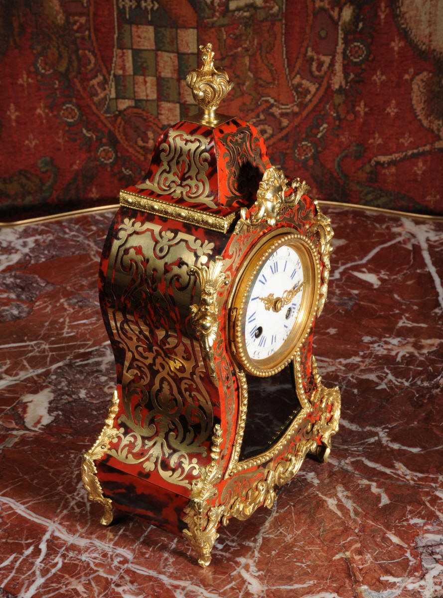 ~ French - Circa 1880 ~ ~~ Excellent condition, fully overhauled ~~ A beautiful original antique French boudoir clock of Boulle work in the Rococo style. The case is of waisted keyhole shape, veneered in red shell veneer, delicately inlaid with polished brass. It is mounted with fine ormolu, C scrolls, acanthus and a goddess mask. To the top is a Rococo urn. The front of the clock is glazed to allow the pendulum to be seen swinging within the case. It is the original ormolu sunburst pendulum featuring the sun god Mithras. The red shell veneer has mellowed to a lovely antique red-brown with plenty of character.