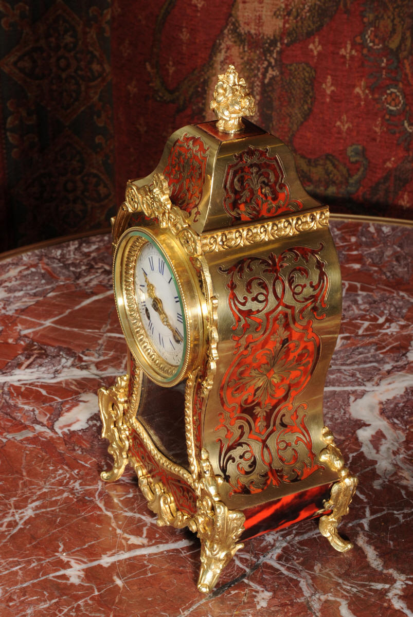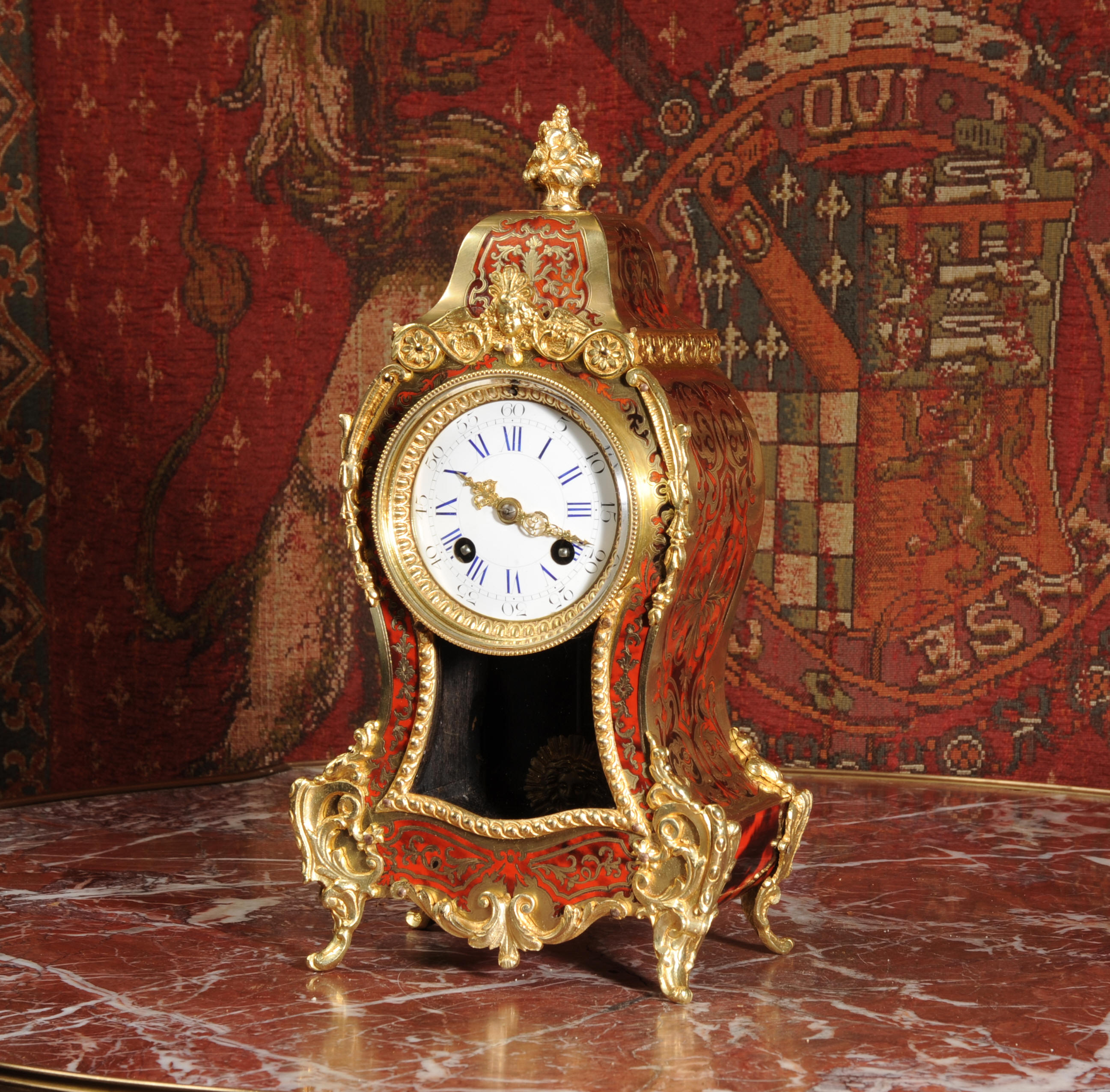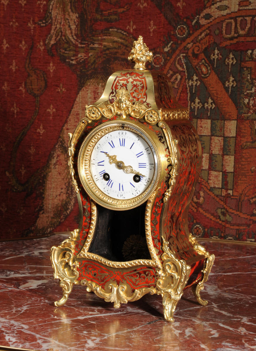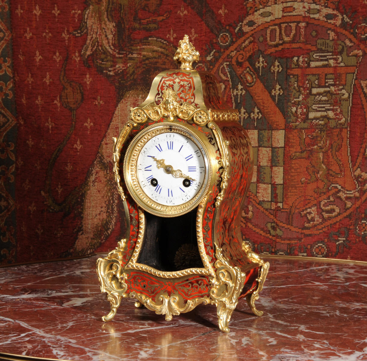 ~ French - Circa 1870 ~ ~~ Excellent condition, fully overhauled ~~ A stunning original antique French Rococo boudoir clock. It is beautifully decorated with Boulle work, finely inlaid red shell veneer and polished brass. It is typically Rococo, with a waisted keyhole shape and is mounted with finely cast ormolu. To the front is a window to allow the ormolu sunburst pendulum to be seen swinging within the case. This is a delightful little boudoir clock in excellent condition.