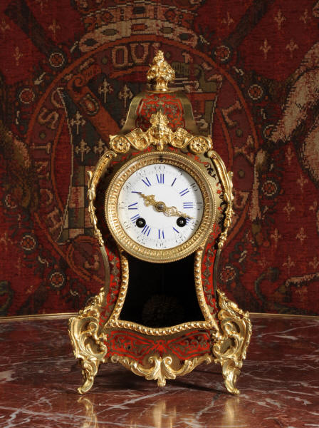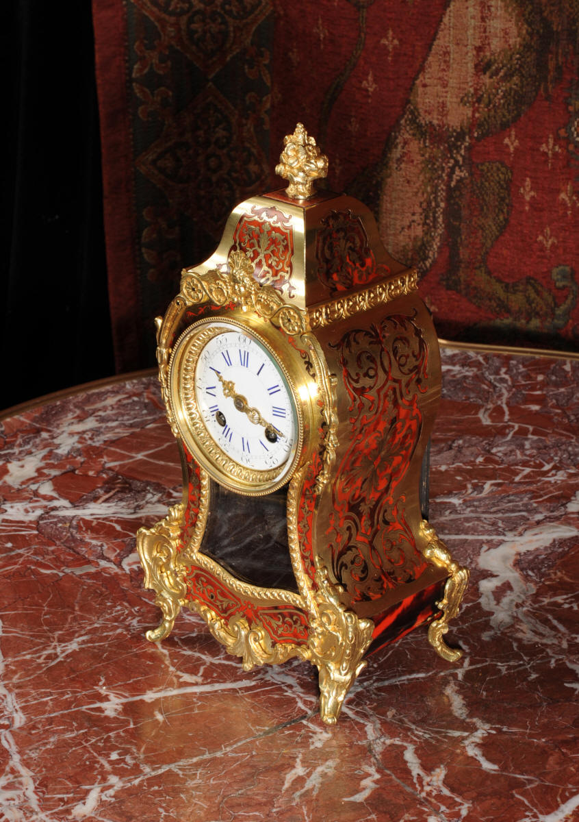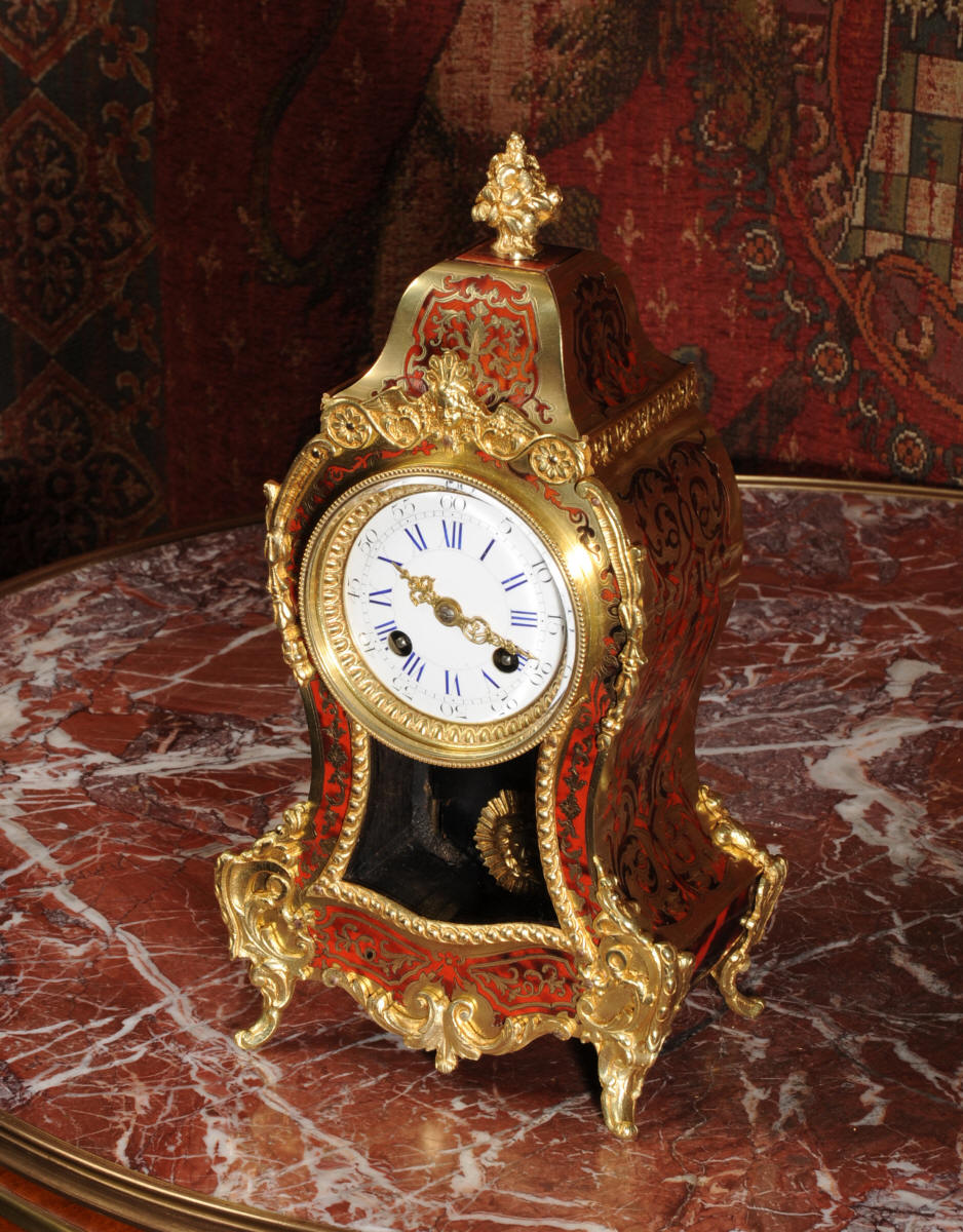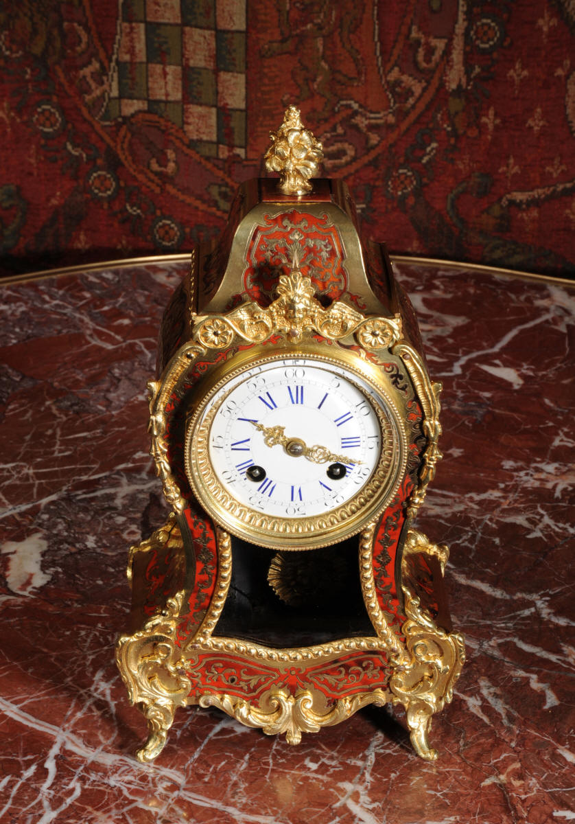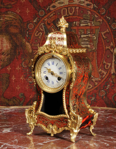 ~ French - Circa 1870 ~ ~~ Excellent condition, fully overhauled ~~ A stunning original antique French Rococo boudoir clock. It is beautifully decorated with Boulle work, finely inlaid red shell veneer and polished brass. It is typically Rococo, with a waisted keyhole shape and is mounted with finely cast ormolu. To the front is a window to allow the ormolu sunburst pendulum to be seen swinging within the case. This is a delightful little boudoir clock in excellent condition.