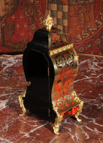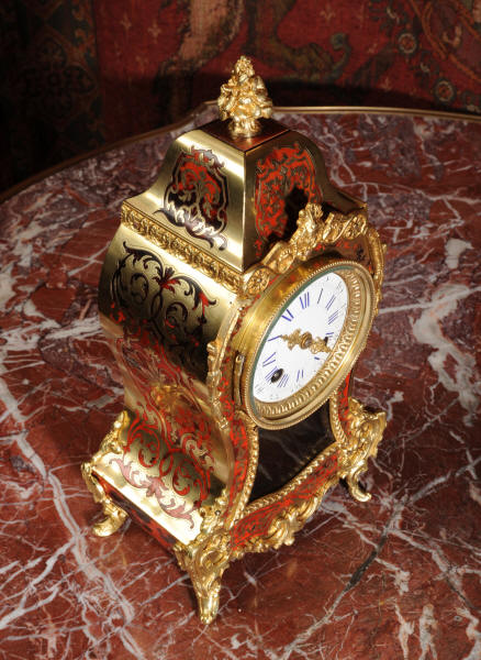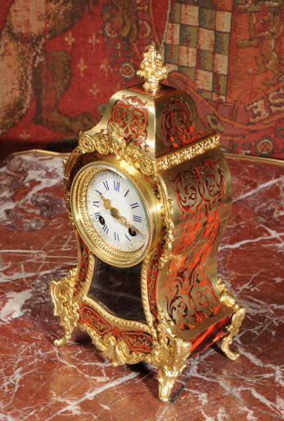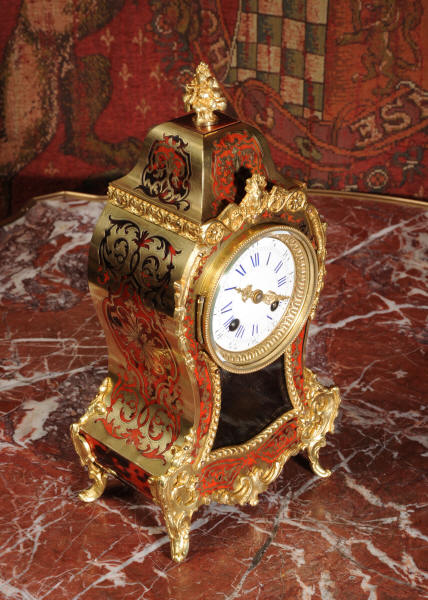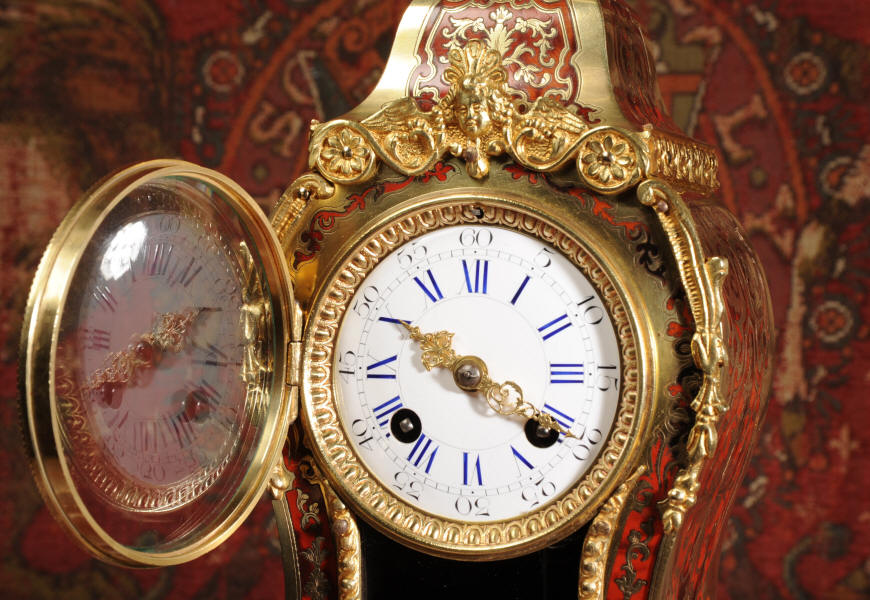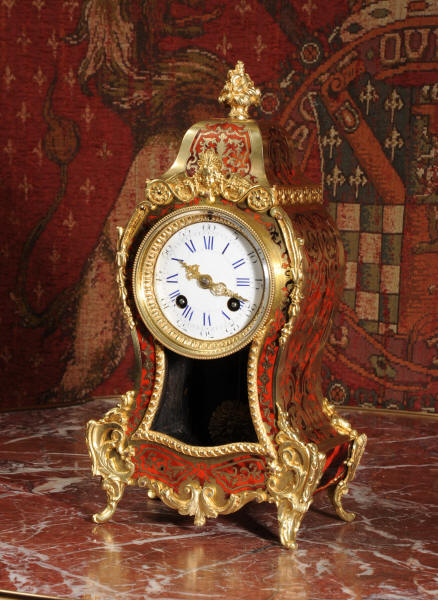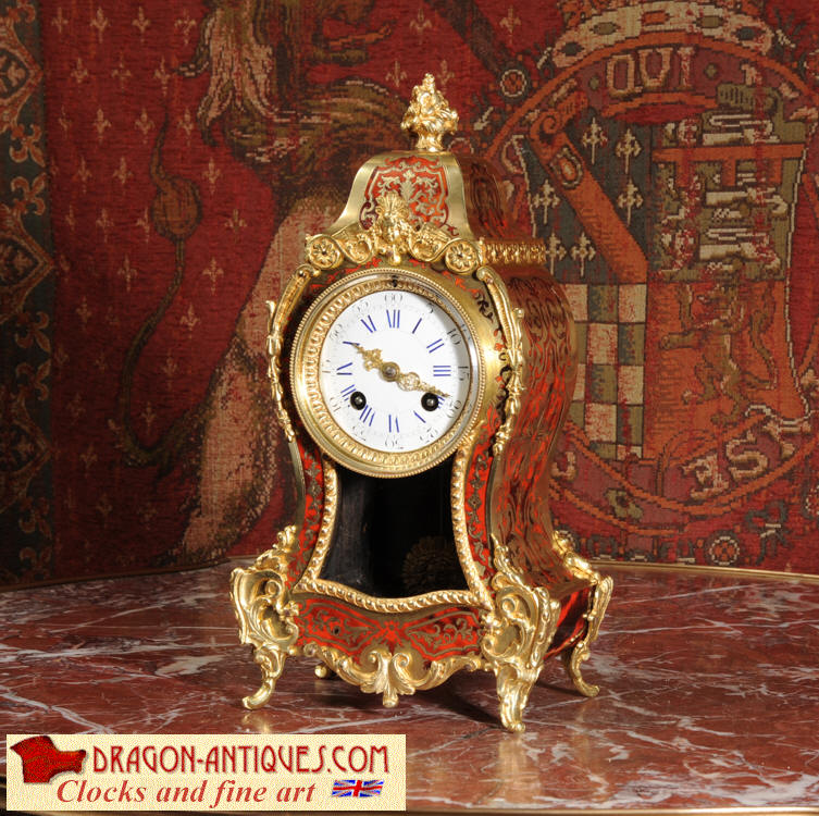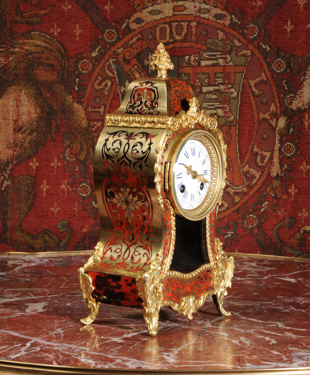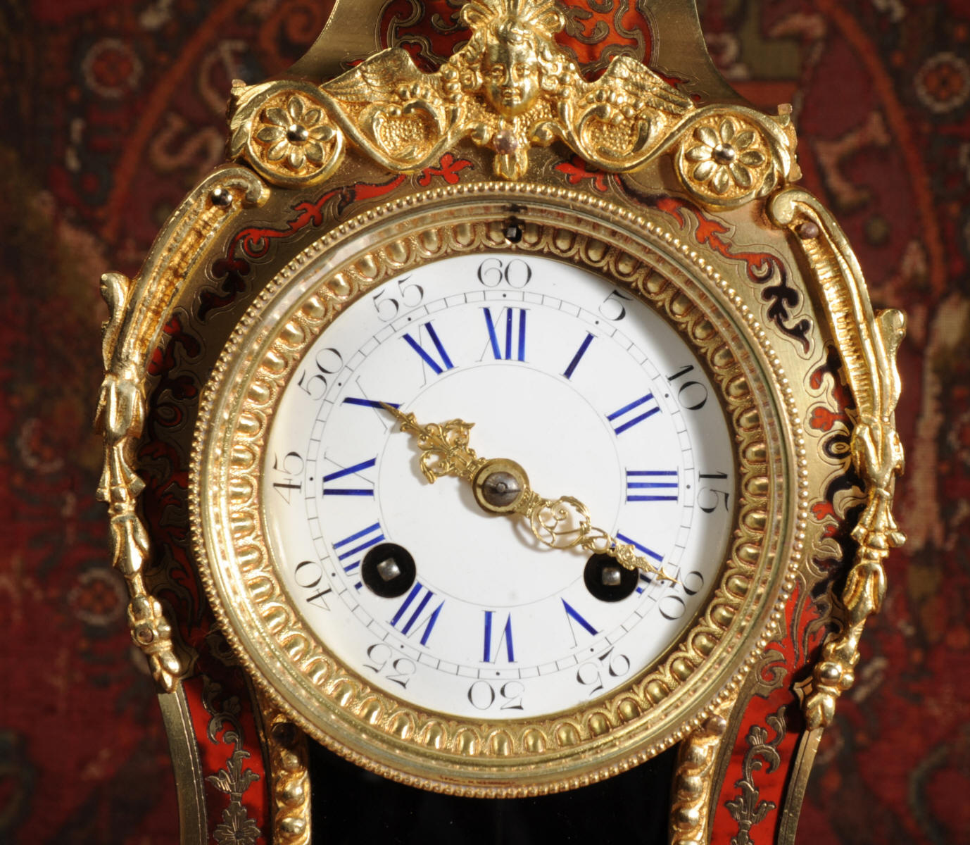 ~ French - Circa 1870 ~ ~~ Excellent condition, fully overhauled ~~ A stunning original antique French Rococo boudoir clock. It is beautifully decorated with Boulle work, finely inlaid red shell veneer and polished brass. It is typically Rococo, with a waisted keyhole shape and is mounted with finely cast ormolu. To the front is a window to allow the ormolu sunburst pendulum to be seen swinging within the case. This is a delightful little boudoir clock in excellent condition.