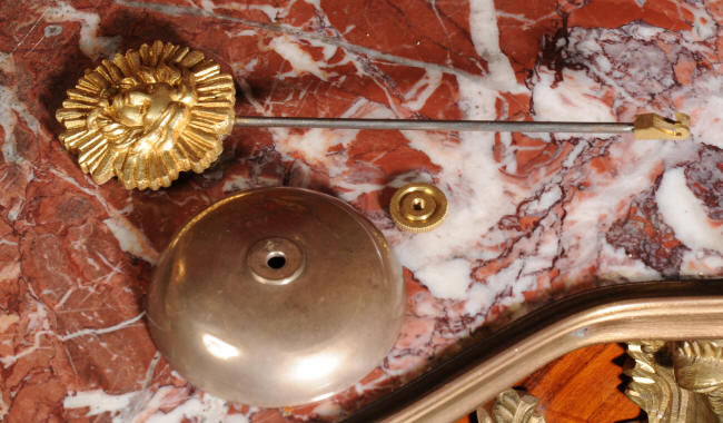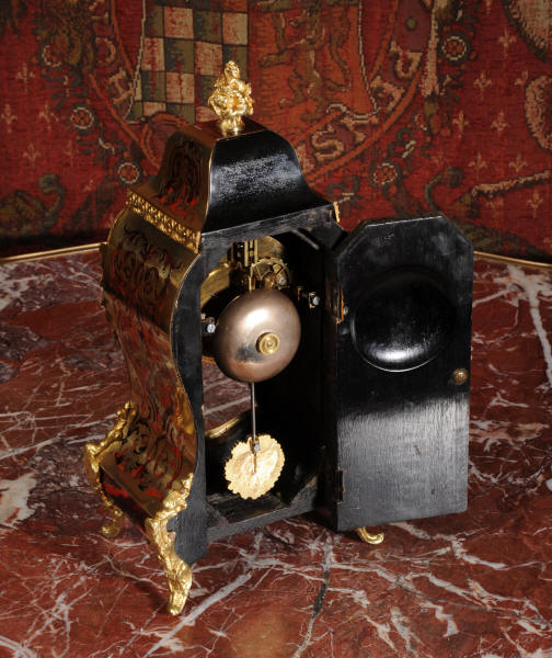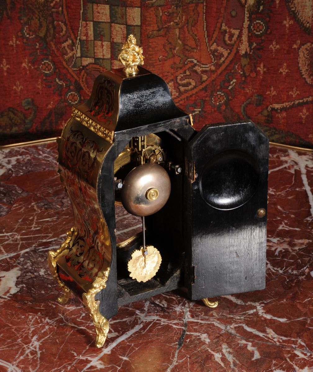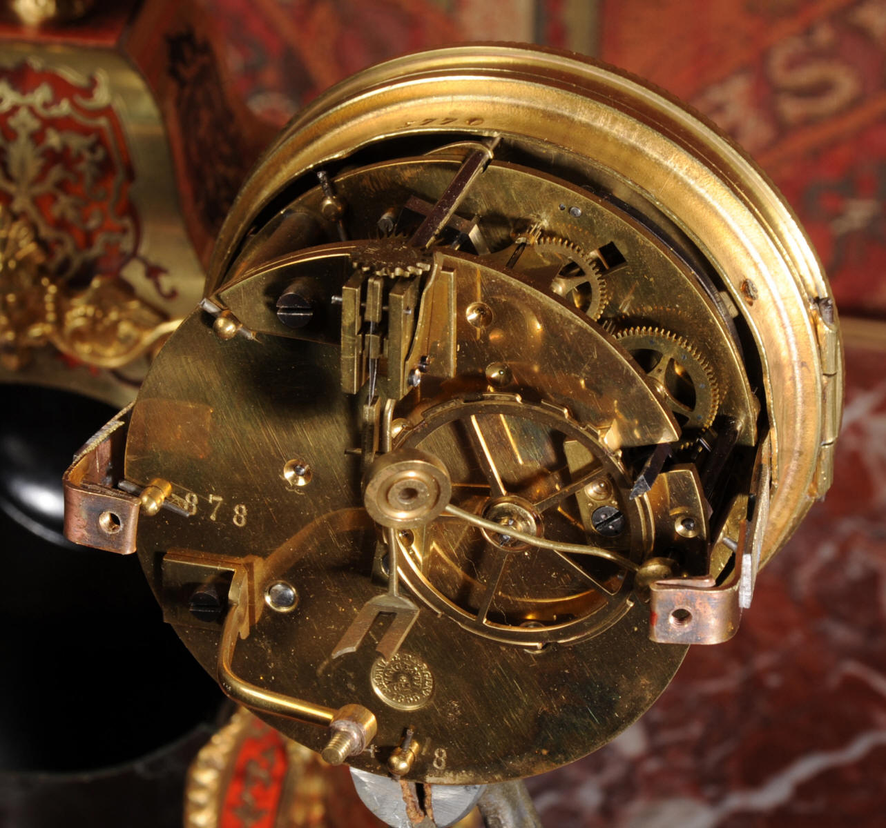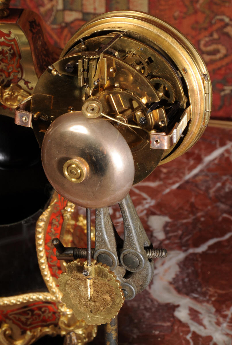 The dial is white enamel with blue lettering. It has a separate minute ring and the original finely fretted gilt brass hands. The French movement is of high quality and has the Vincenti et Cie 'Medaille D'Argent' mark on the backplate. It is in excellent clean and running condition and the ormolu pendulum is original. It runs for 8 days and strikes the hours and halves on a bell. Click the video clip below to hear the bell and watch the clock running! Condition of the case is excellent with clean and bright finish. Boulle work is excellent, there are no major losses to the shell or brass inlay. The dial is also excellent with just some tiny nibbles around the winding holes. Ormolu is excellent, bright and clean and no losses.