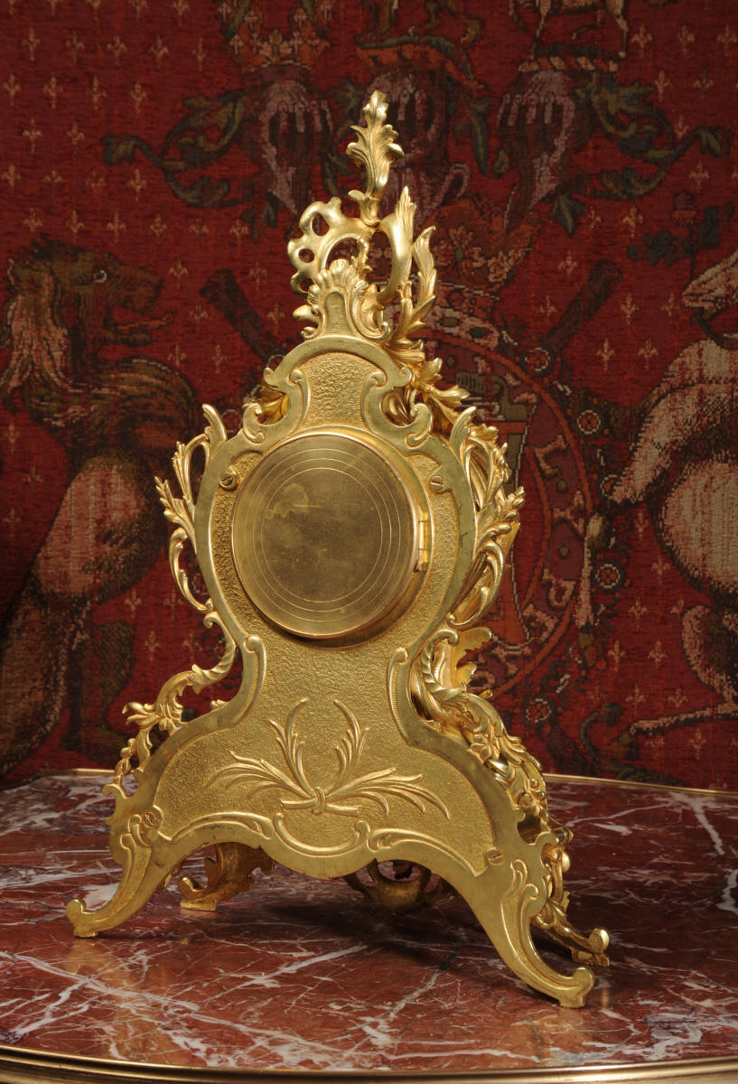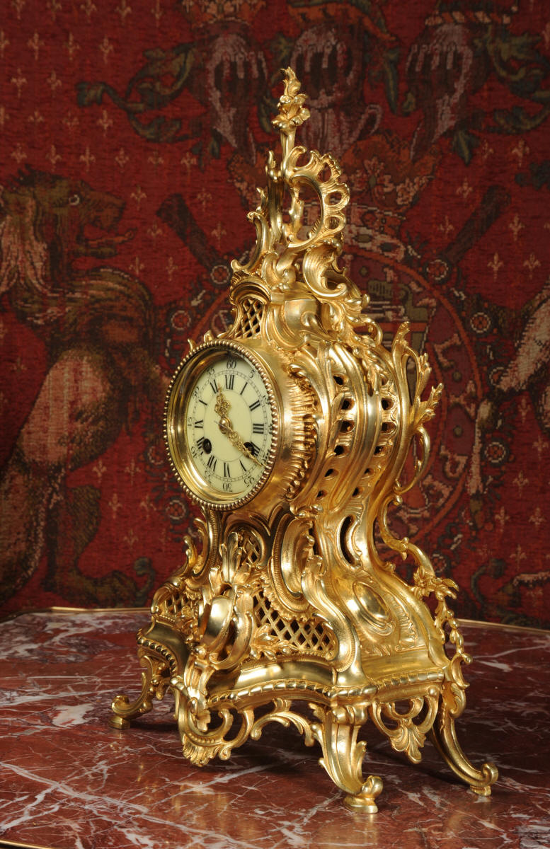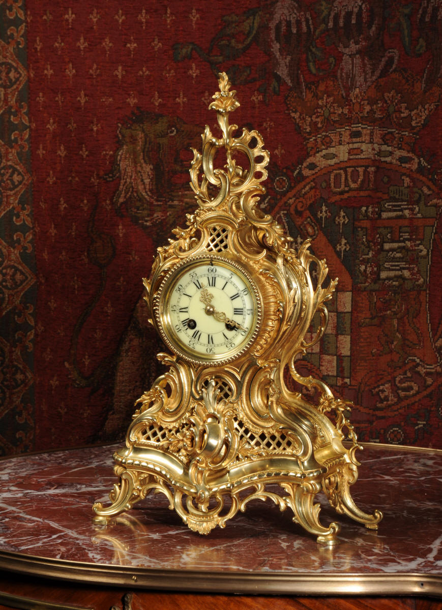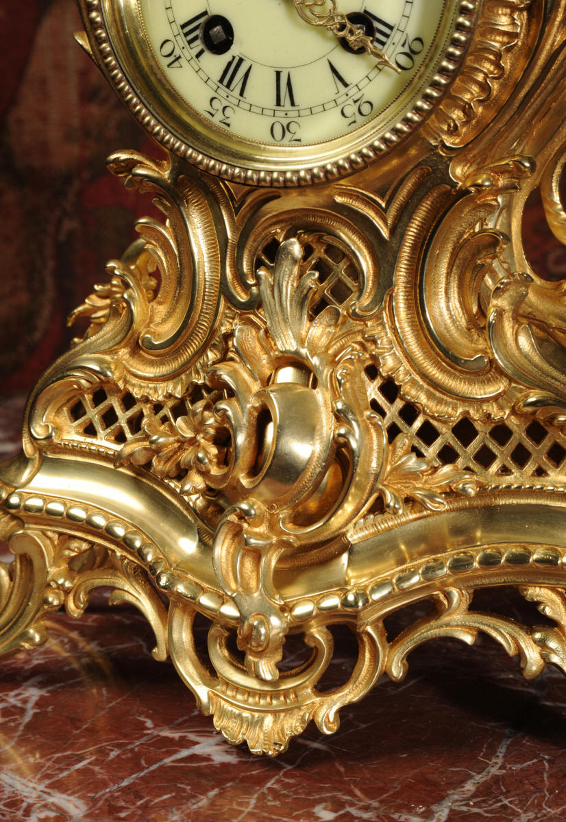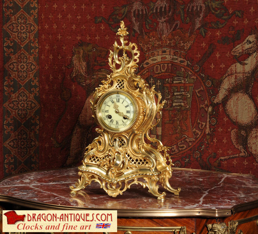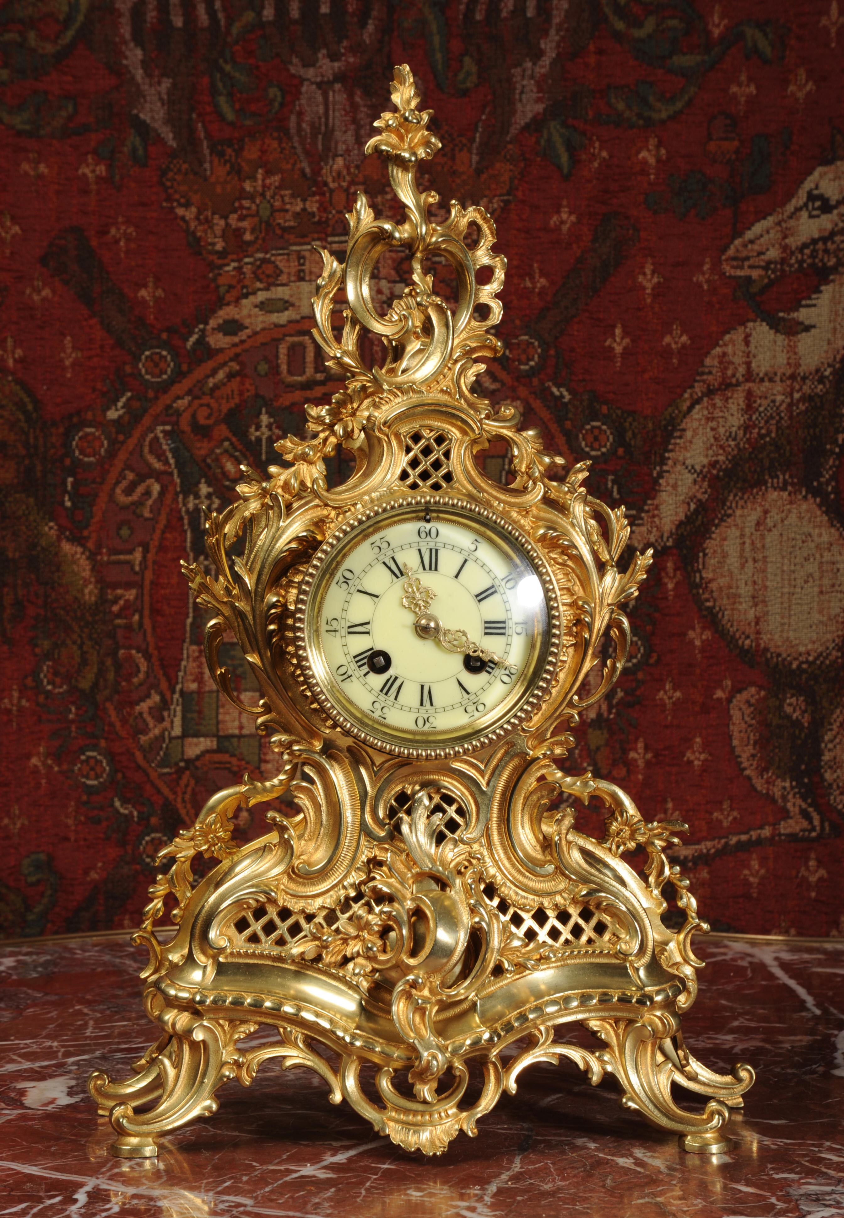 ~ French - Circa 1880 ~ ~~ Excellent condition, fully overhauled ~~ A lovely original antique French Rococo boudoir clock. Modelled in gilt brass and typically bold, asymmetric, waisted designed with laurel leaves, 'C' scrolls and floral swags. There is a large and elaborate scrolling finial to the top of the case. The dial is the sought after cream enamel on copper with black lettering and finely fretted gilt brass hands. It has a separate minute ring and has a hob nail bezel. The front of the case is fretted to allow a glimpse of the pendulum swinging within the case.