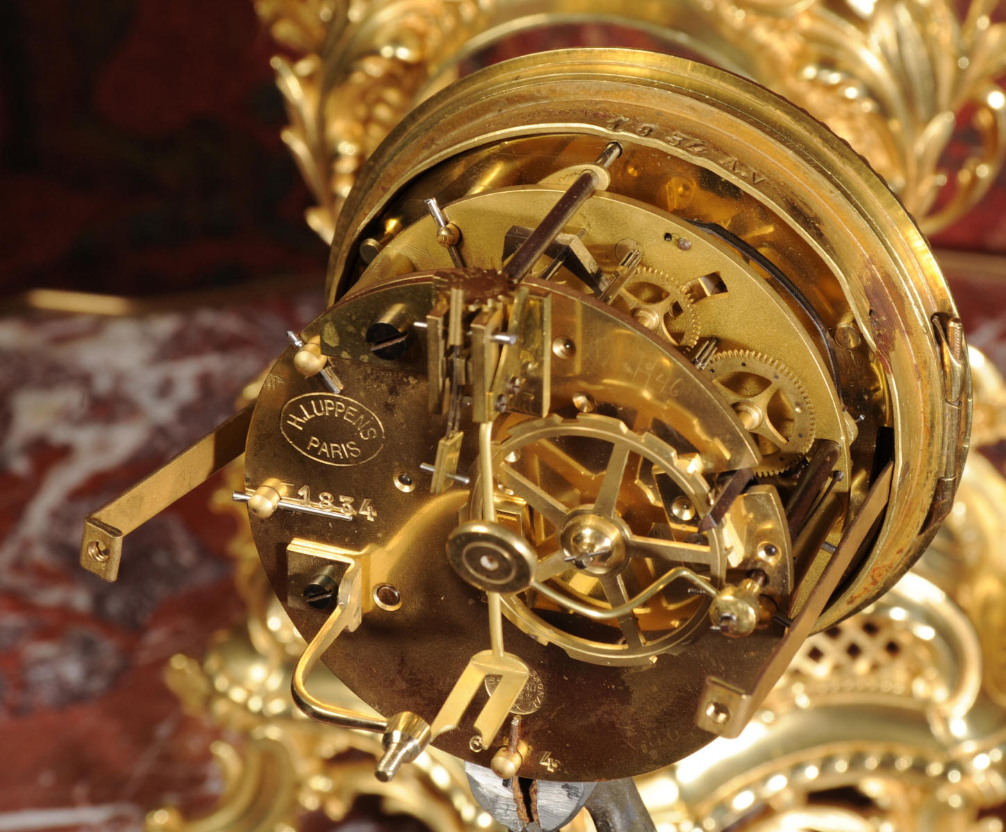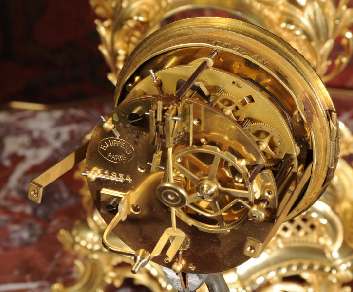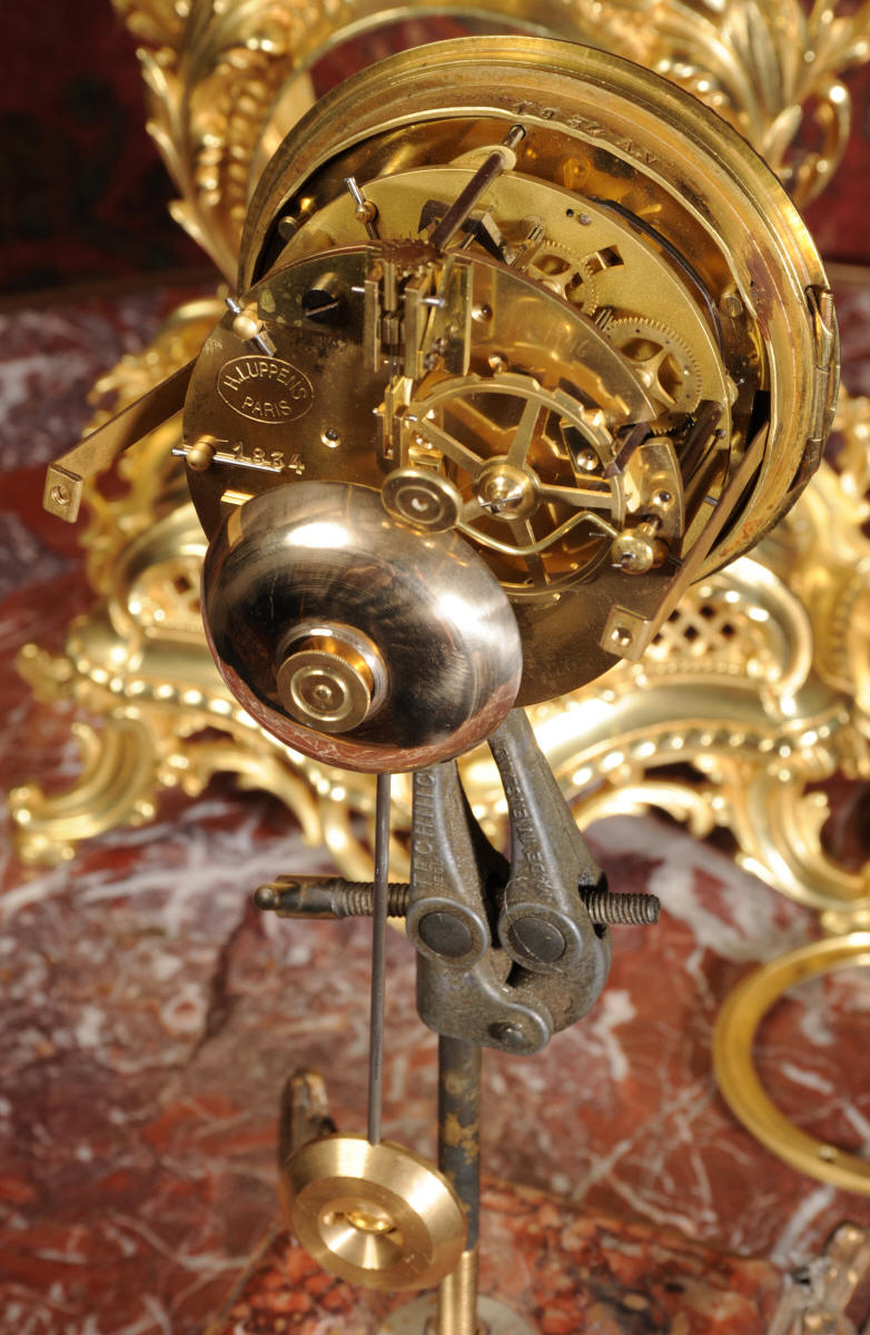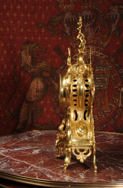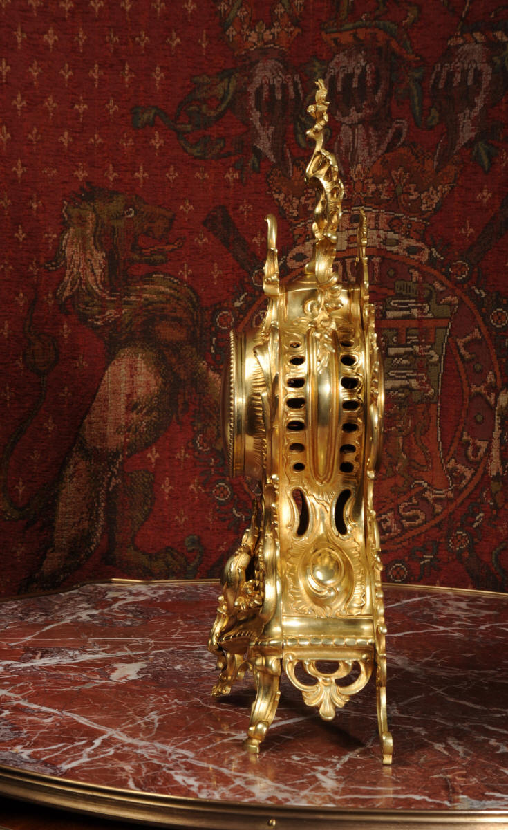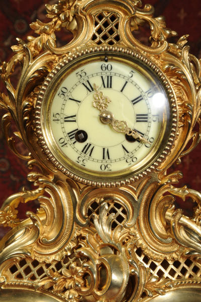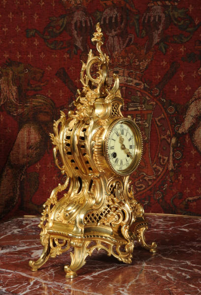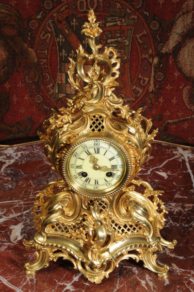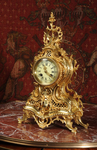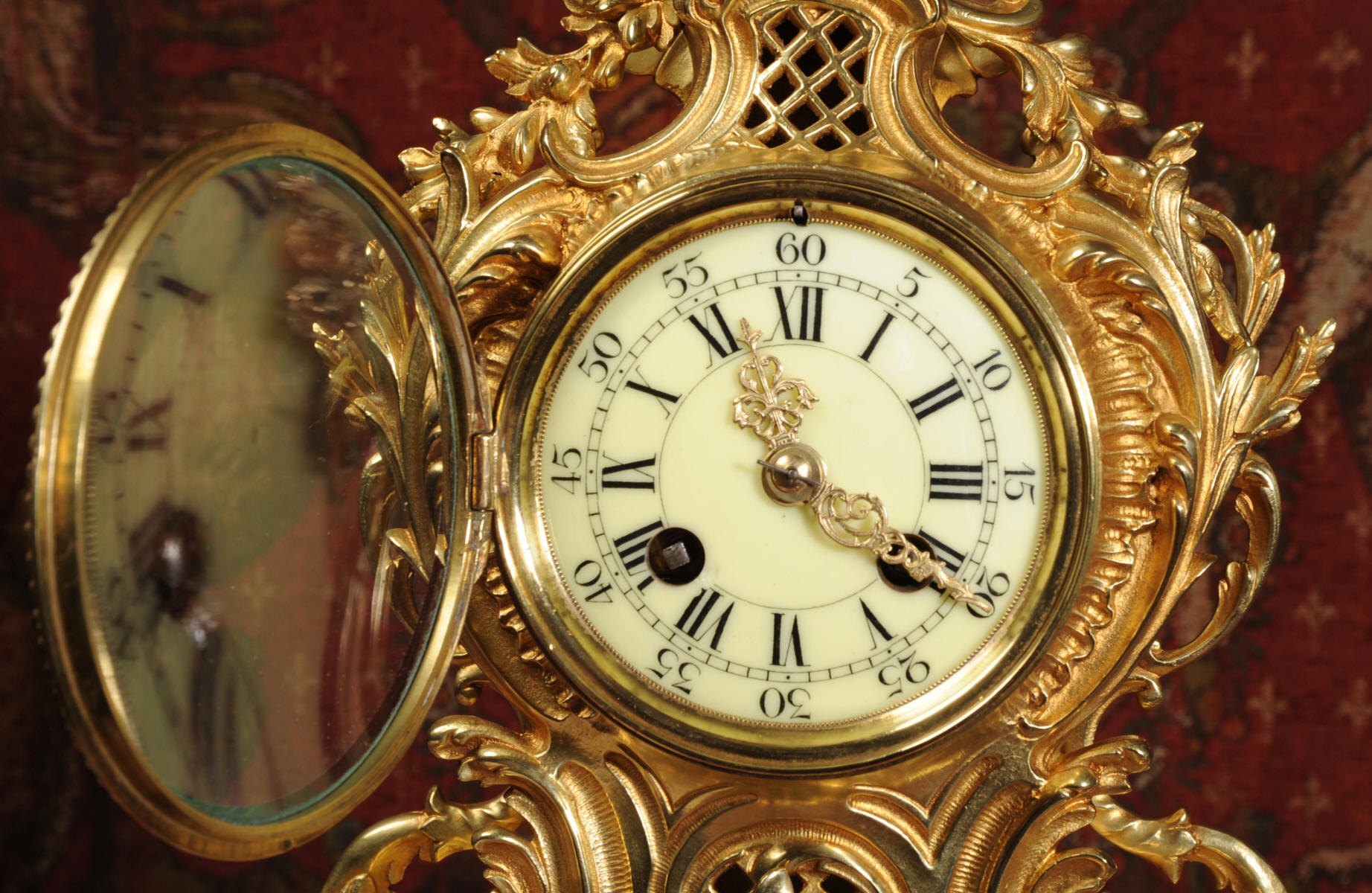 ~ French - Circa 1880 ~ ~~ Excellent condition, fully overhauled ~~ A lovely original antique French Rococo boudoir clock. Modelled in gilt brass and typically bold, asymmetric, waisted designed with laurel leaves, 'C' scrolls and floral swags. There is a large and elaborate scrolling finial to the top of the case. The dial is the sought after cream enamel on copper with black lettering and finely fretted gilt brass hands. It has a separate minute ring and has a hob nail bezel. The front of the case is fretted to allow a glimpse of the pendulum swinging within the case.