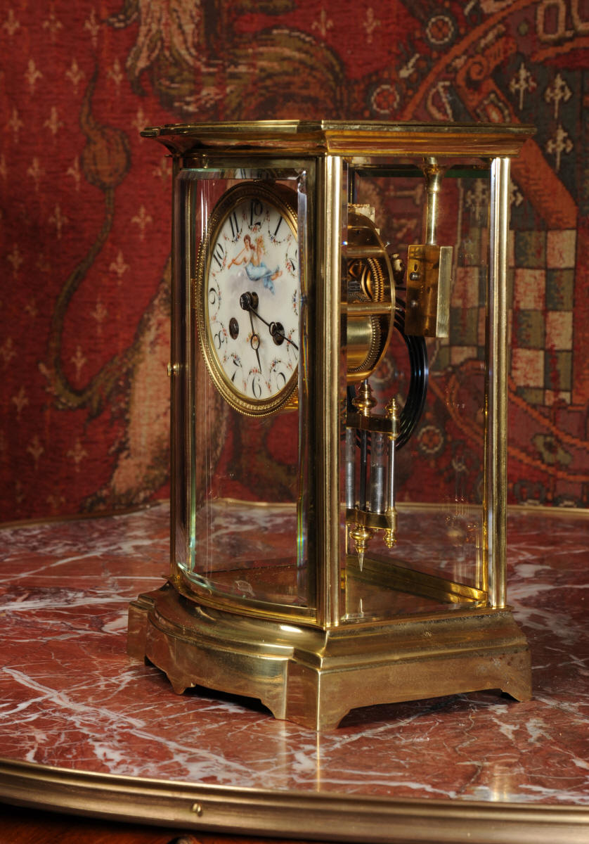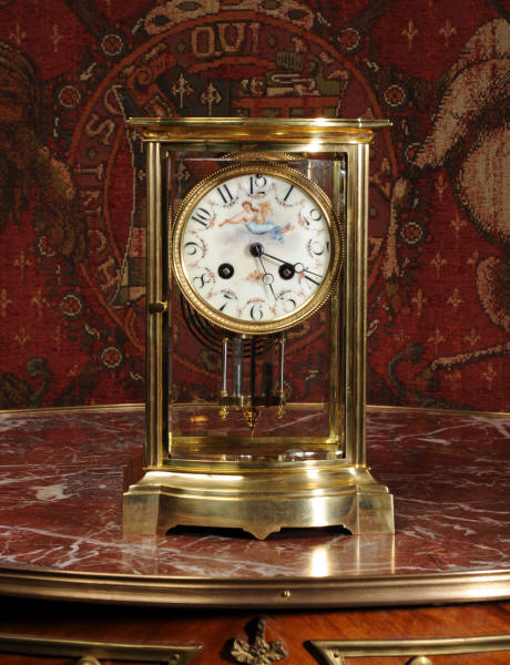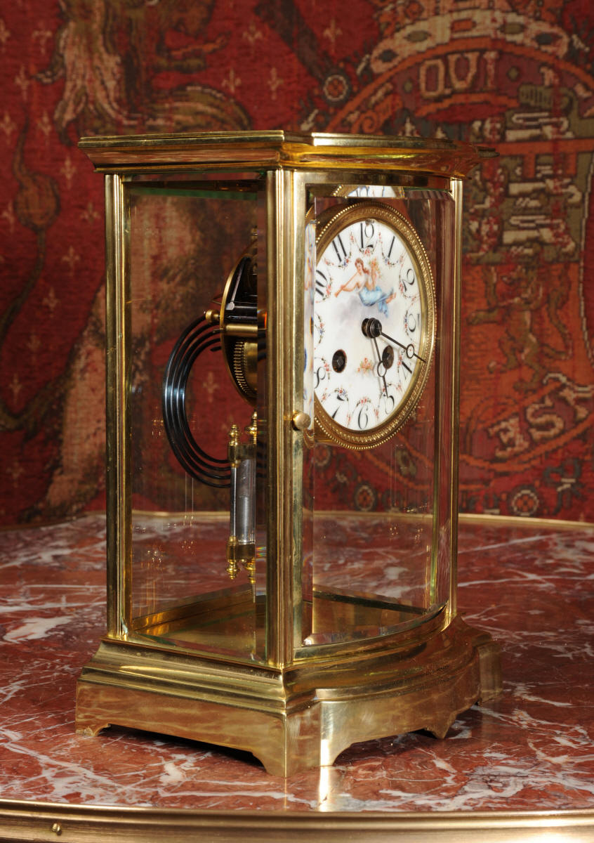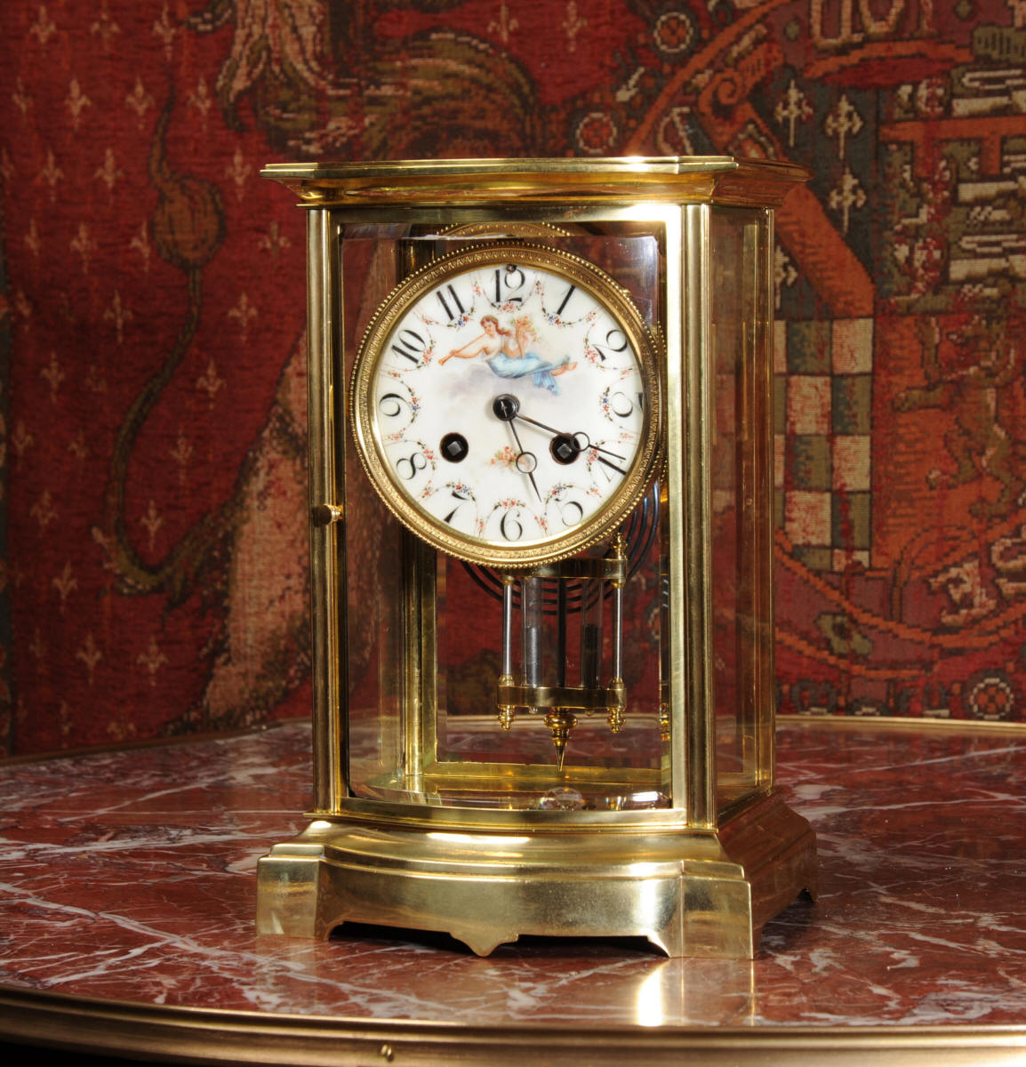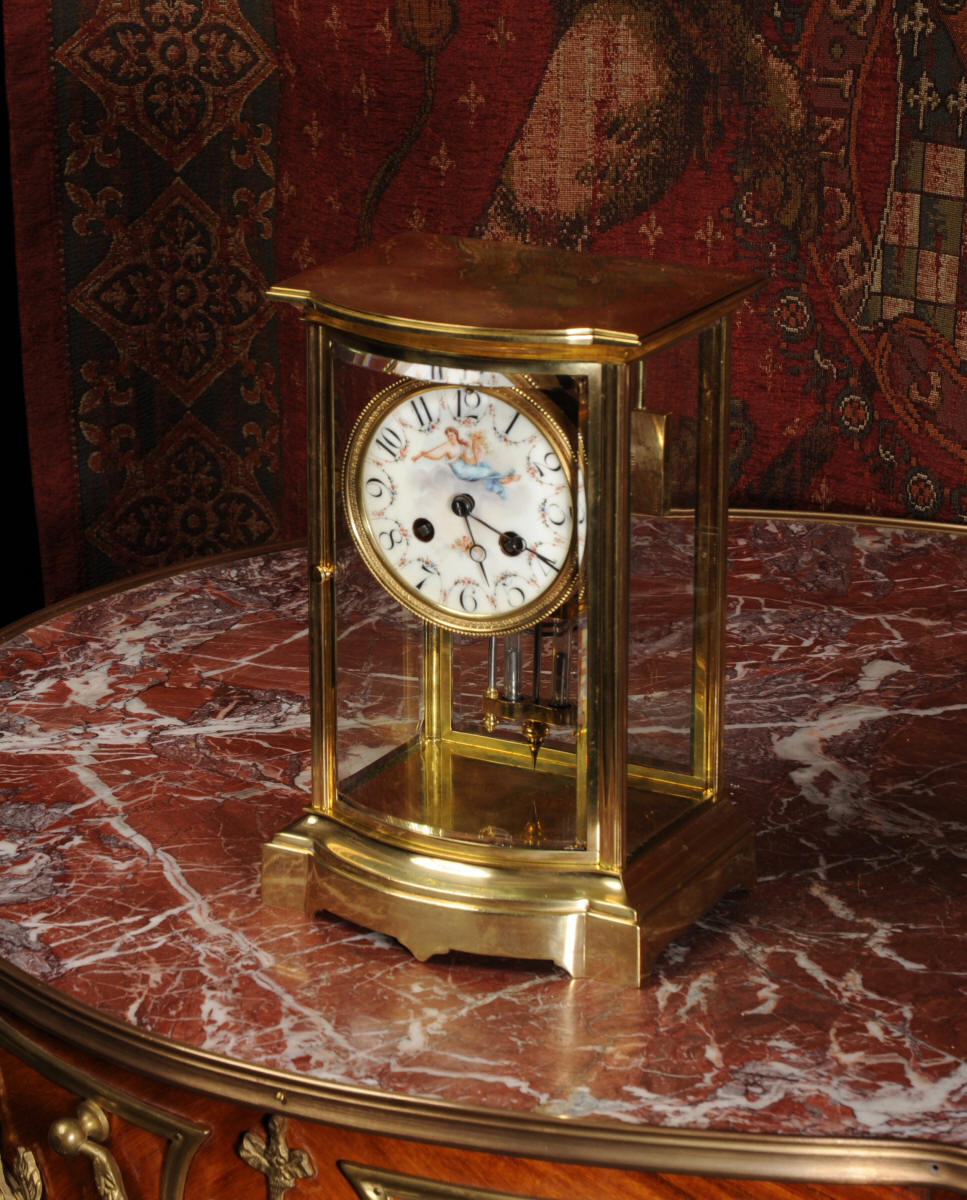 ~ French - Circa 1890 ~ ~~ Excellent condition, fully overhauled ~~ A beautifully chic and high quality Four Glass or Crystal Regulator by the famous maker Japy Freres. It is made of gilt brass with bevelled glass panels, allowing the movement and mercury compensated pendulum to be seen. The stunning enamel dial is delicately painted with floral swags and an image of a goddess with a cornucopia and blowing a horn, possibly Fortuna, the goddess of good fortune. The front door is fitted with bowed glass.