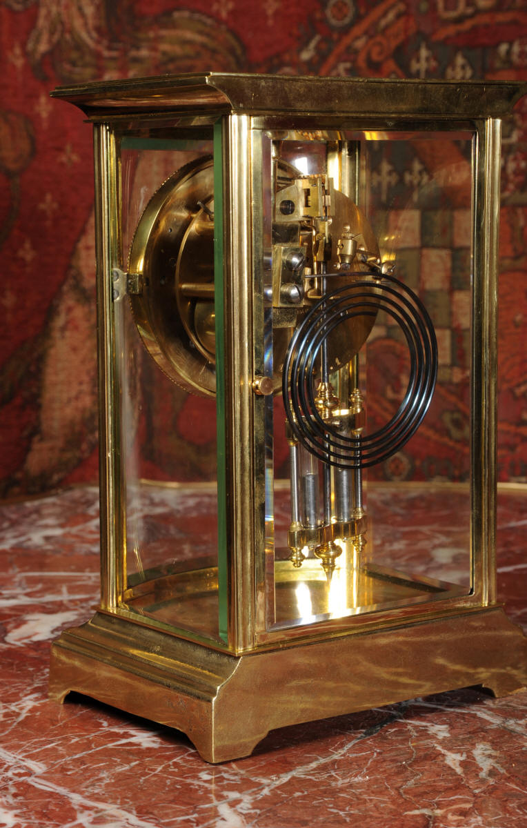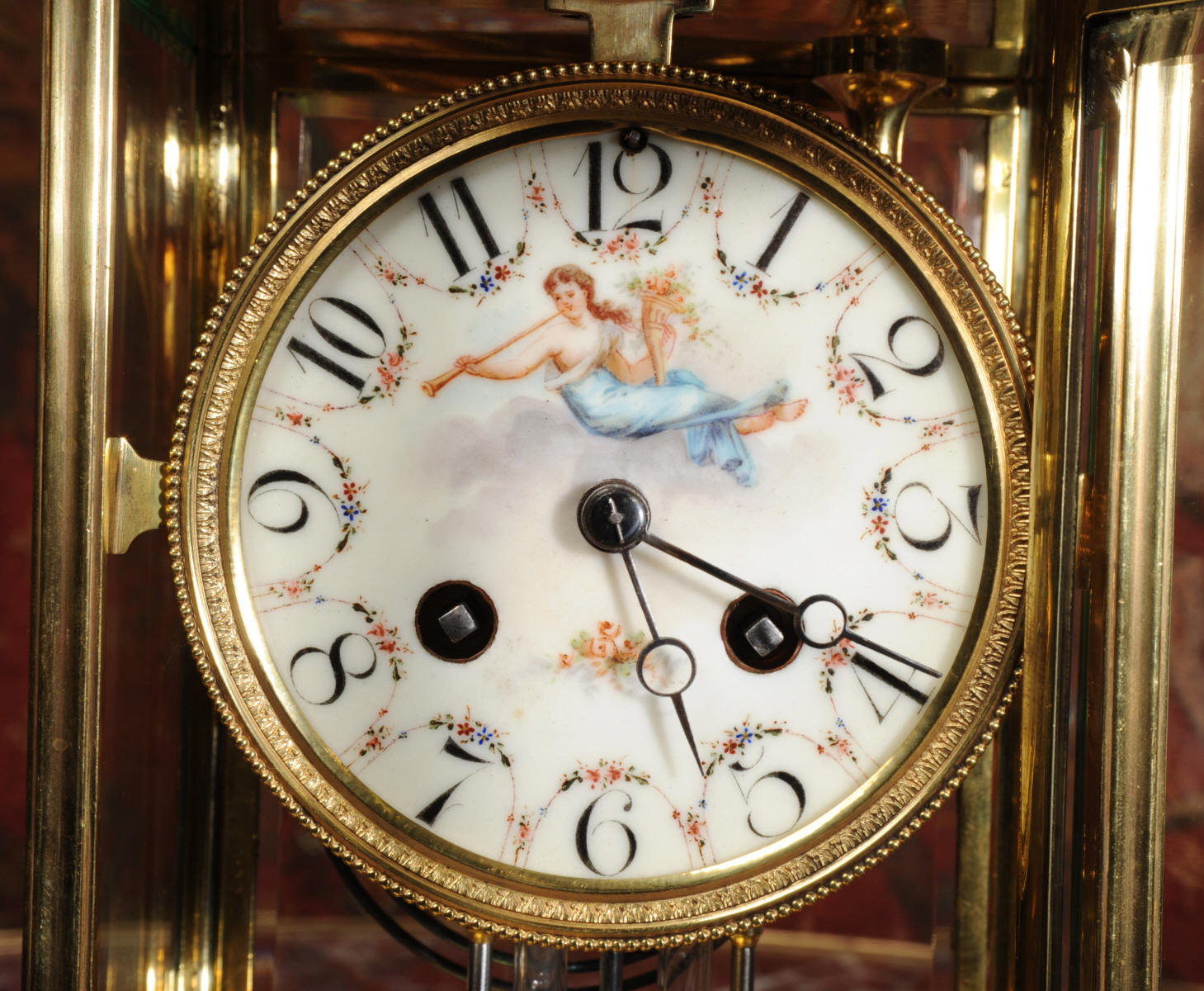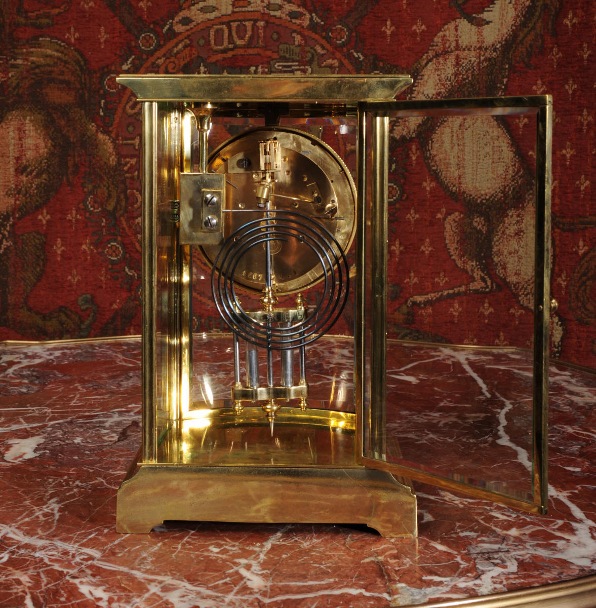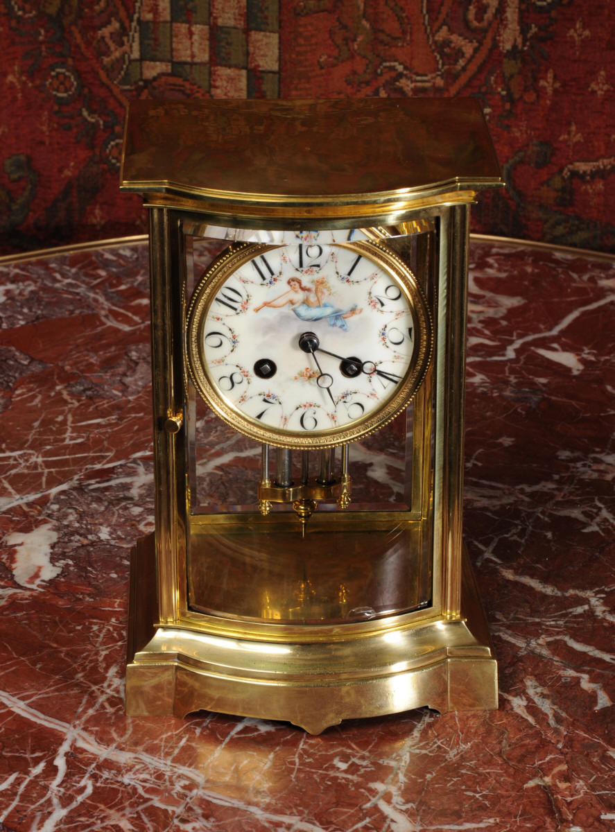 ~ French - Circa 1890 ~ ~~ Excellent condition, fully overhauled ~~ A beautifully chic and high quality Four Glass or Crystal Regulator by the famous maker Japy Freres. It is made of gilt brass with bevelled glass panels, allowing the movement and mercury compensated pendulum to be seen. The stunning enamel dial is delicately painted with floral swags and an image of a goddess with a cornucopia and blowing a horn, possibly Fortuna, the goddess of good fortune. The front door is fitted with bowed glass.