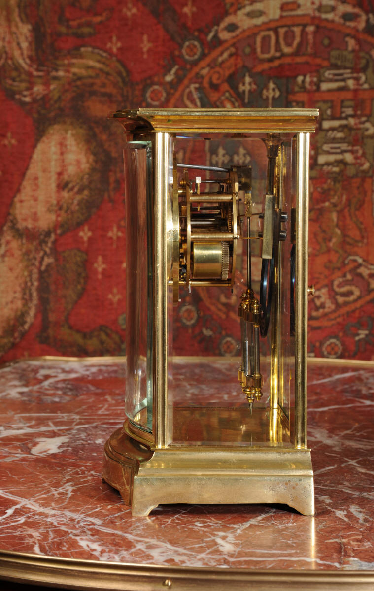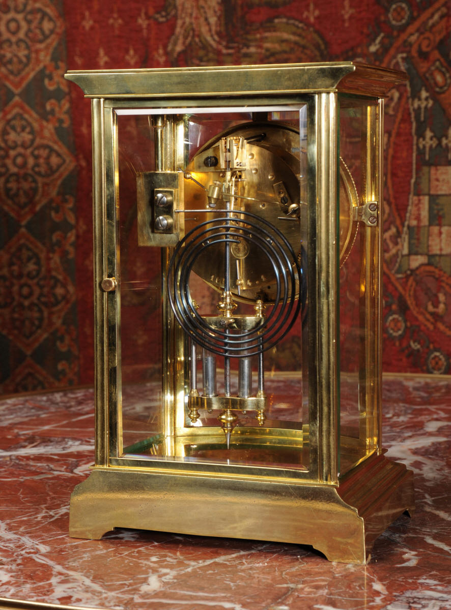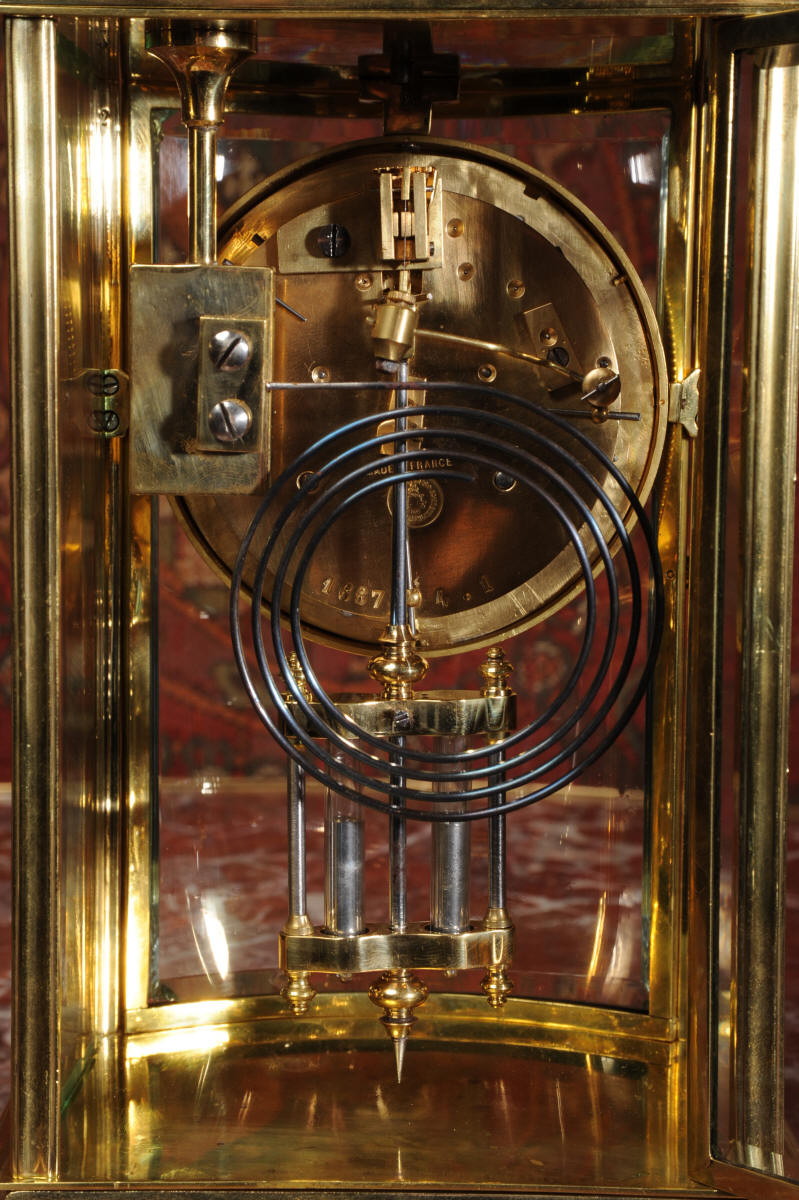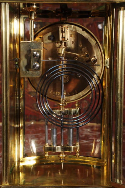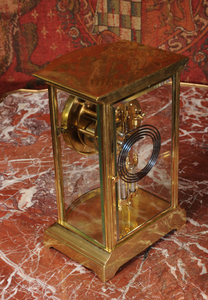 The French movement is of high quality and has the Japy Freres 'Grande Medaille D' Honneur' mark on the movement backplate. It is in excellent clean and running condition having been fully overhauled by our clockmaker. Mercury temperature compensating pendulum is original. It runs for 8 days and strikes the hours and halves on a coiled gong. Click the video clip below to hear the gong and watch the clock running! Condition of the case is very good, beautifully clean and bright. There is slight some wear, discolouration and pitting in places. The dial is also in excellent condition with no chips or scratches. The glass is good, there is a small chip to the bottom of the original bowed front door edge and to the corners. The left hand side panel has some small chips to the edges and corners.