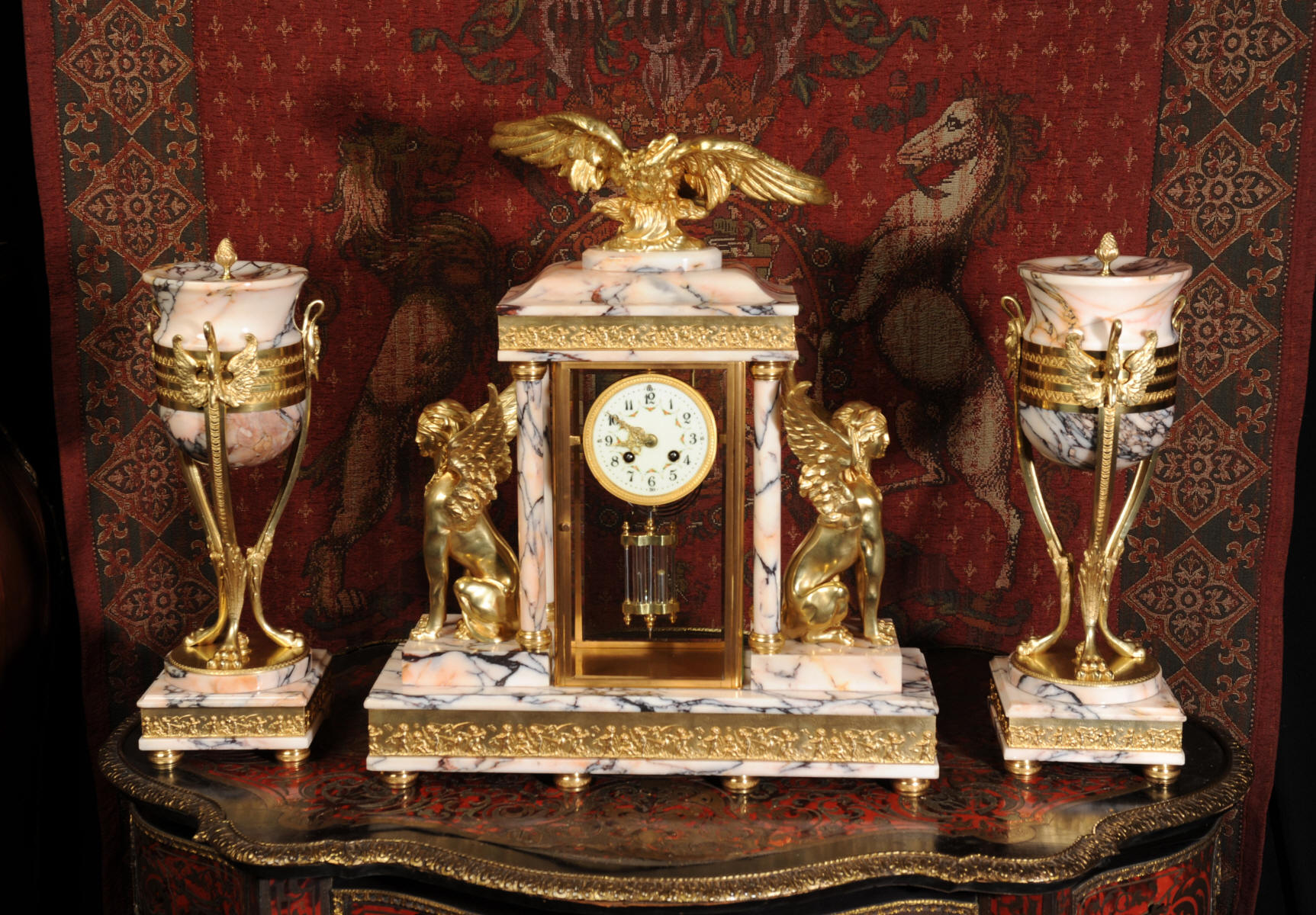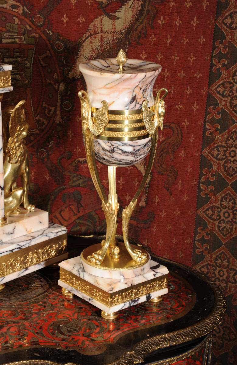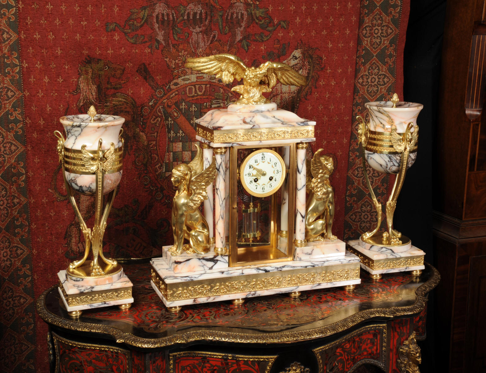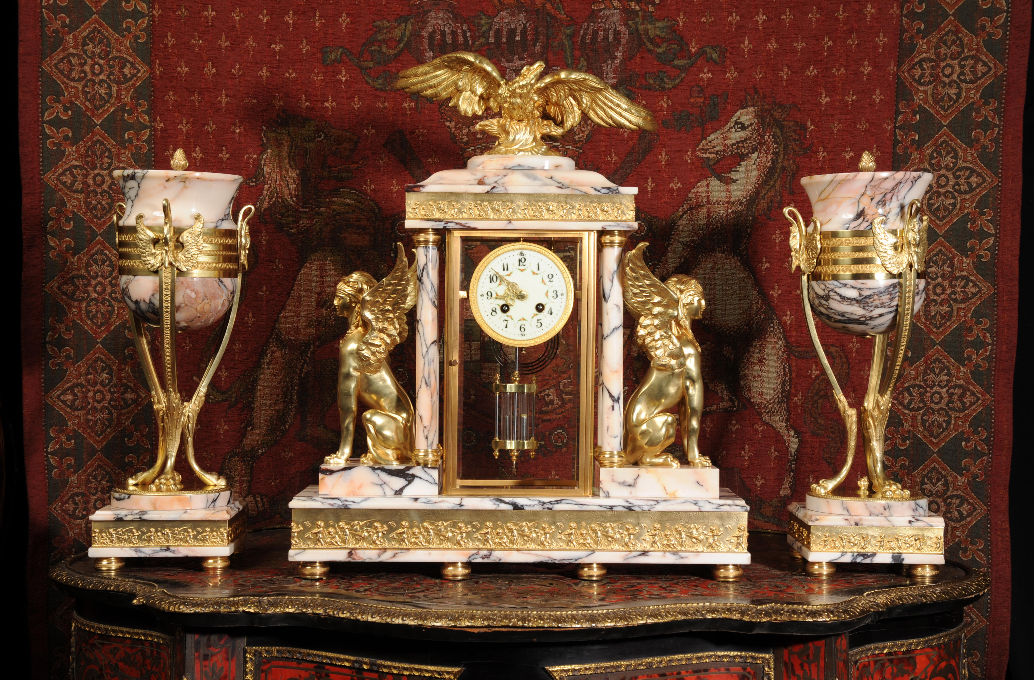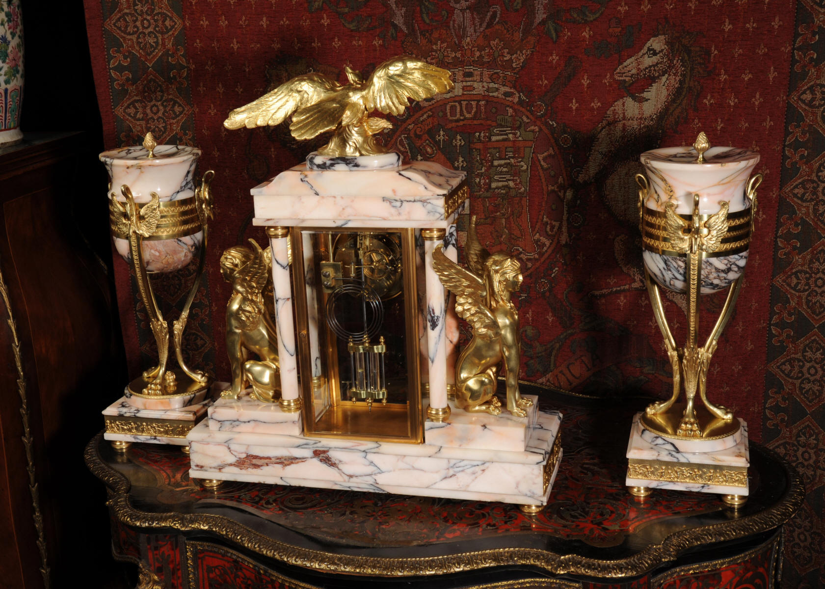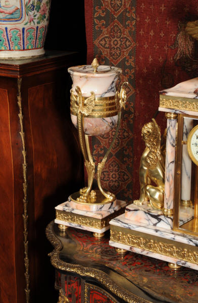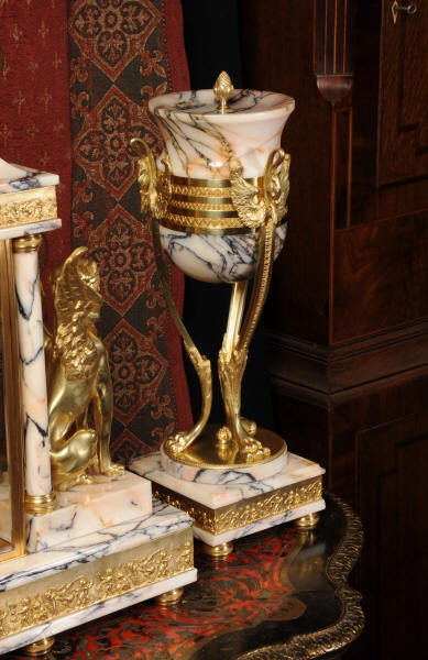 The side urns are equally large and well finished, a large specimen marble 'cup' is held aloft on three elegantly designed legs of ormolu with hairy paw feet and eagle capitals. The dial is cream enamel on copper with delicately painted floral swags between the numerals and finely fretted gilt brass hands.