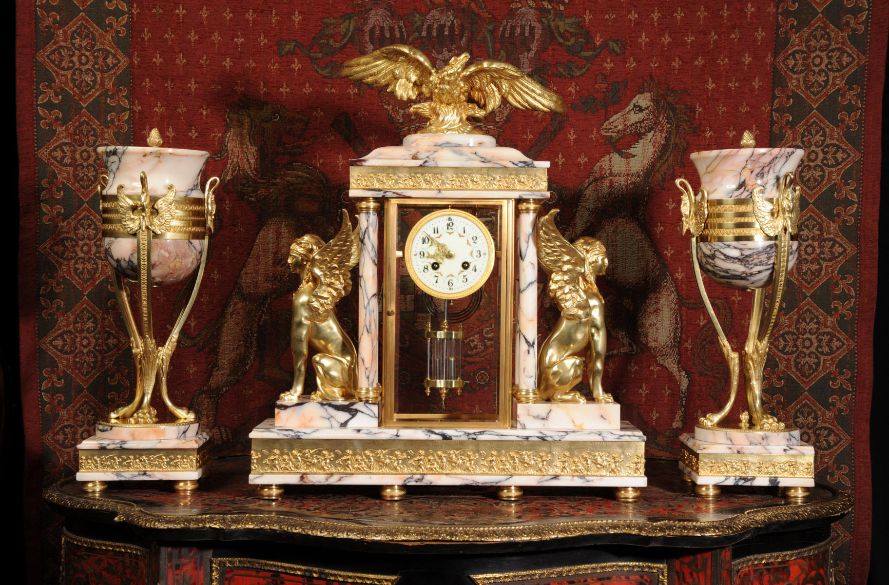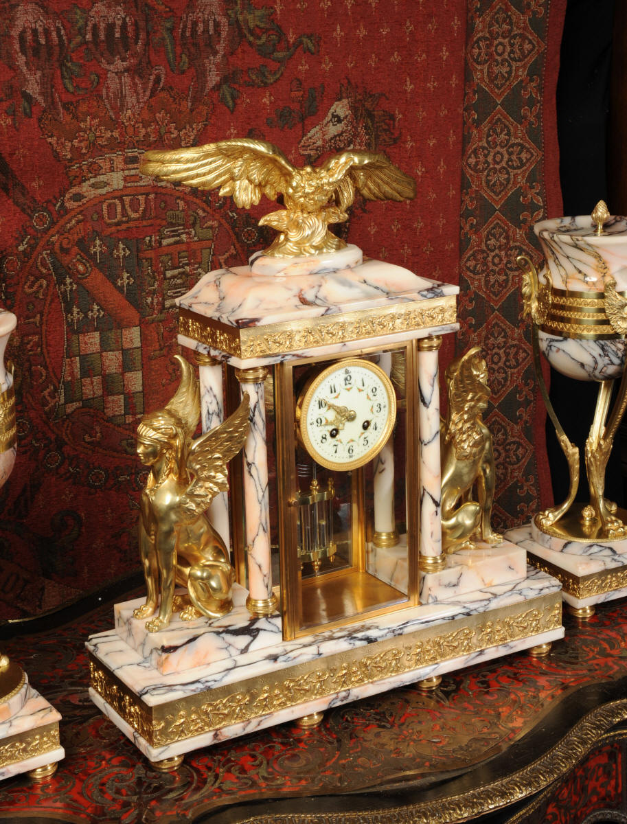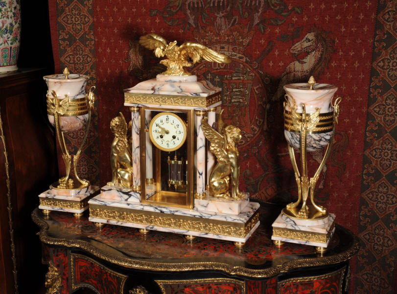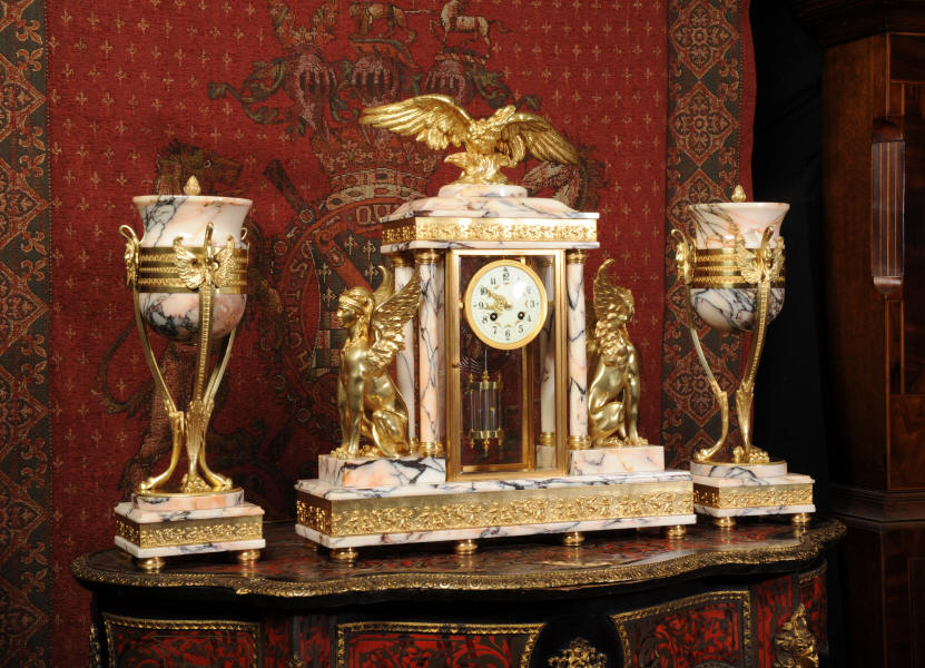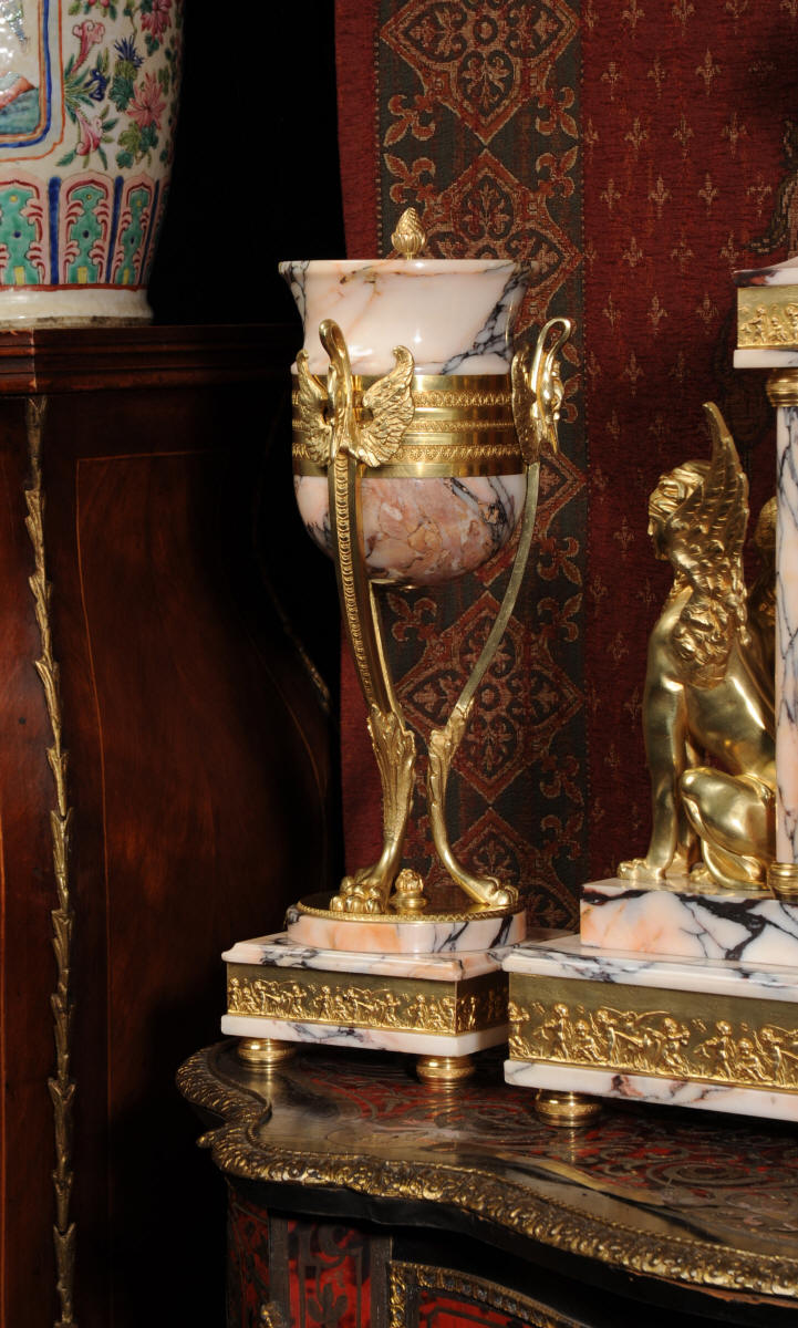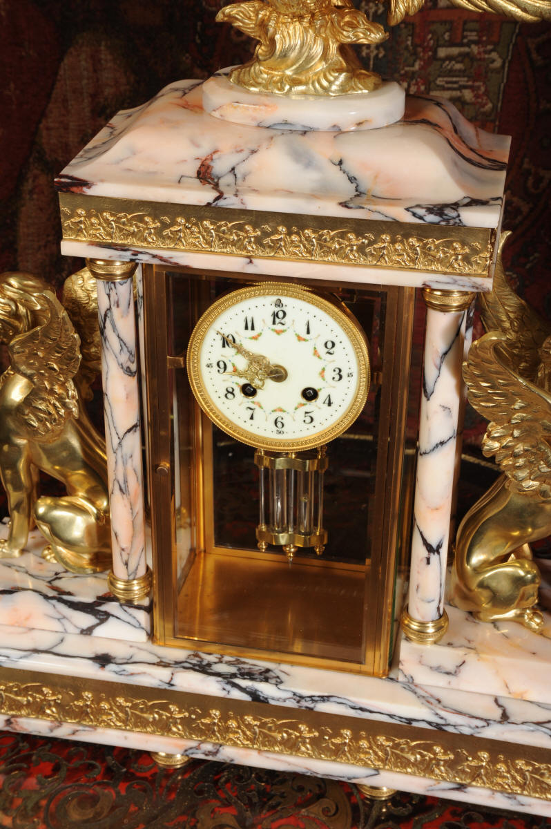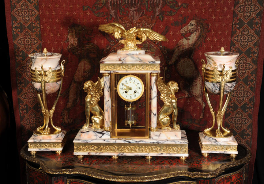 The side urns are equally large and well finished, a large specimen marble 'cup' is held aloft on three elegantly designed legs of ormolu with hairy paw feet and eagle capitals. The dial is cream enamel on copper with delicately painted floral swags between the numerals and finely fretted gilt brass hands.