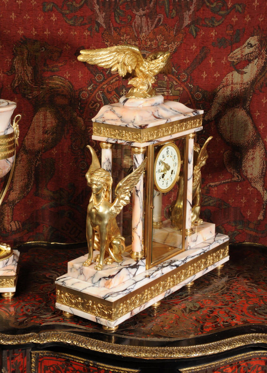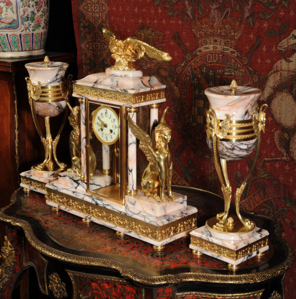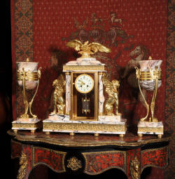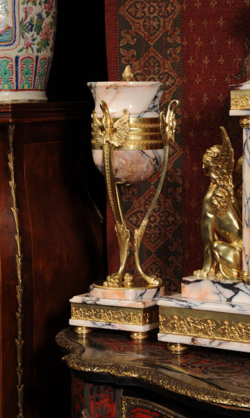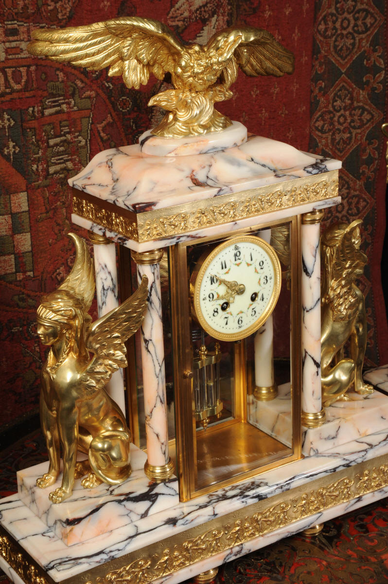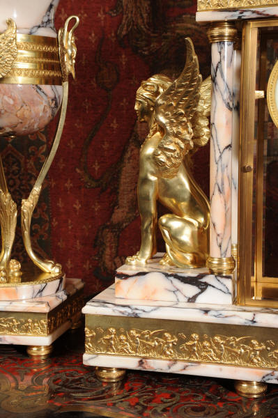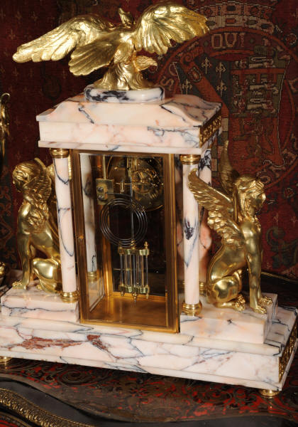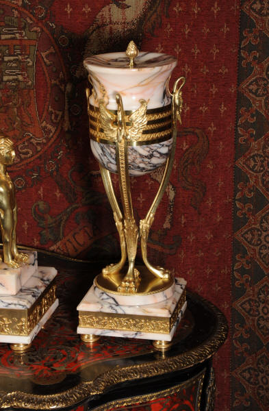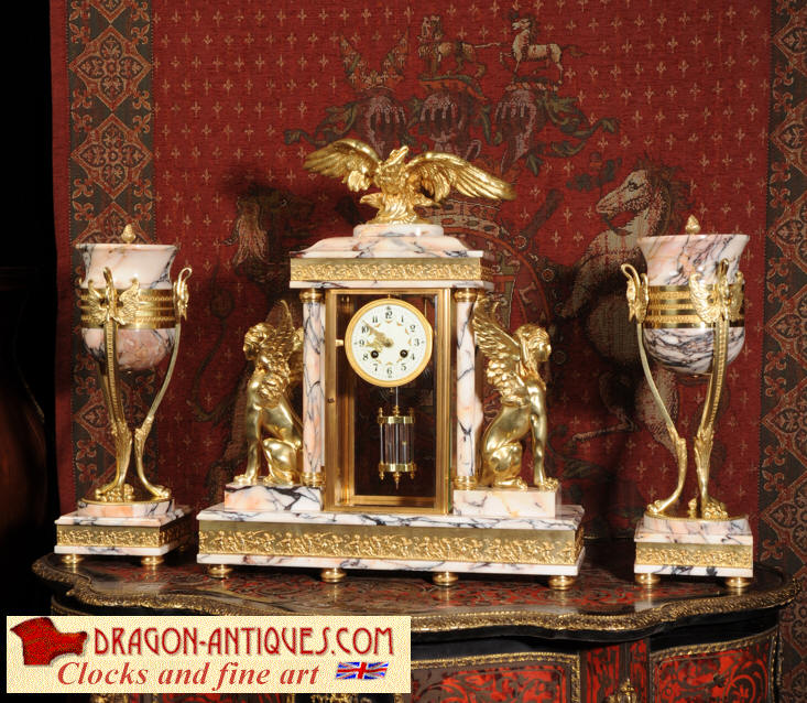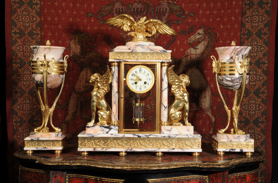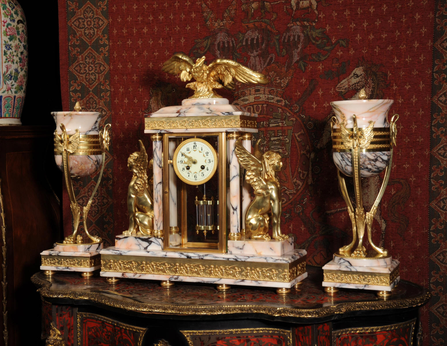 The side urns are equally large and well finished, a large specimen marble 'cup' is held aloft on three elegantly designed legs of ormolu with hairy paw feet and eagle capitals. The dial is cream enamel on copper with delicately painted floral swags between the numerals and finely fretted gilt brass hands.