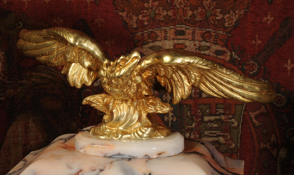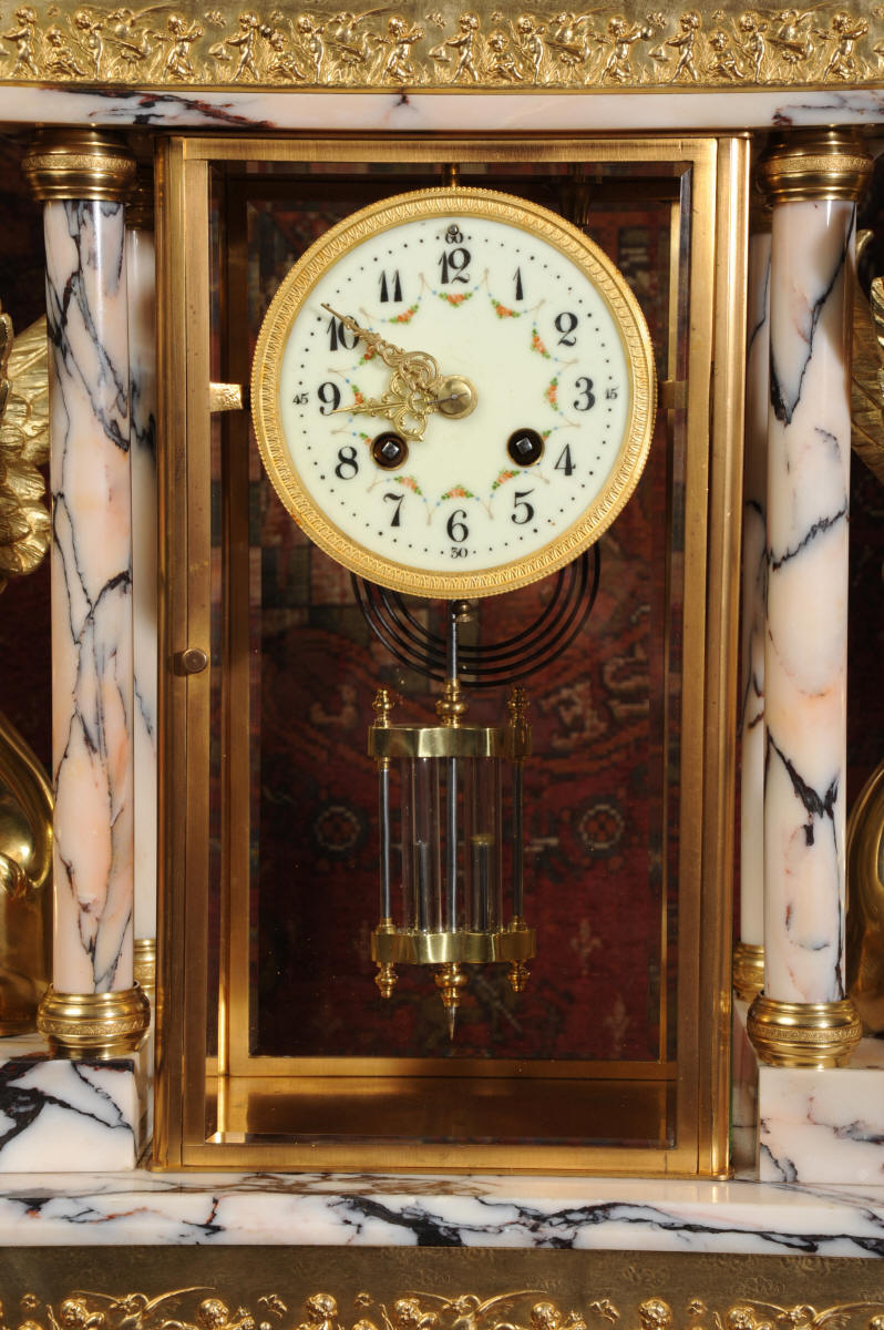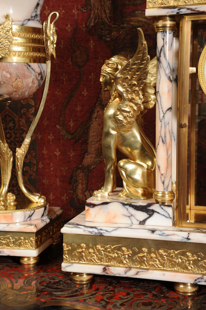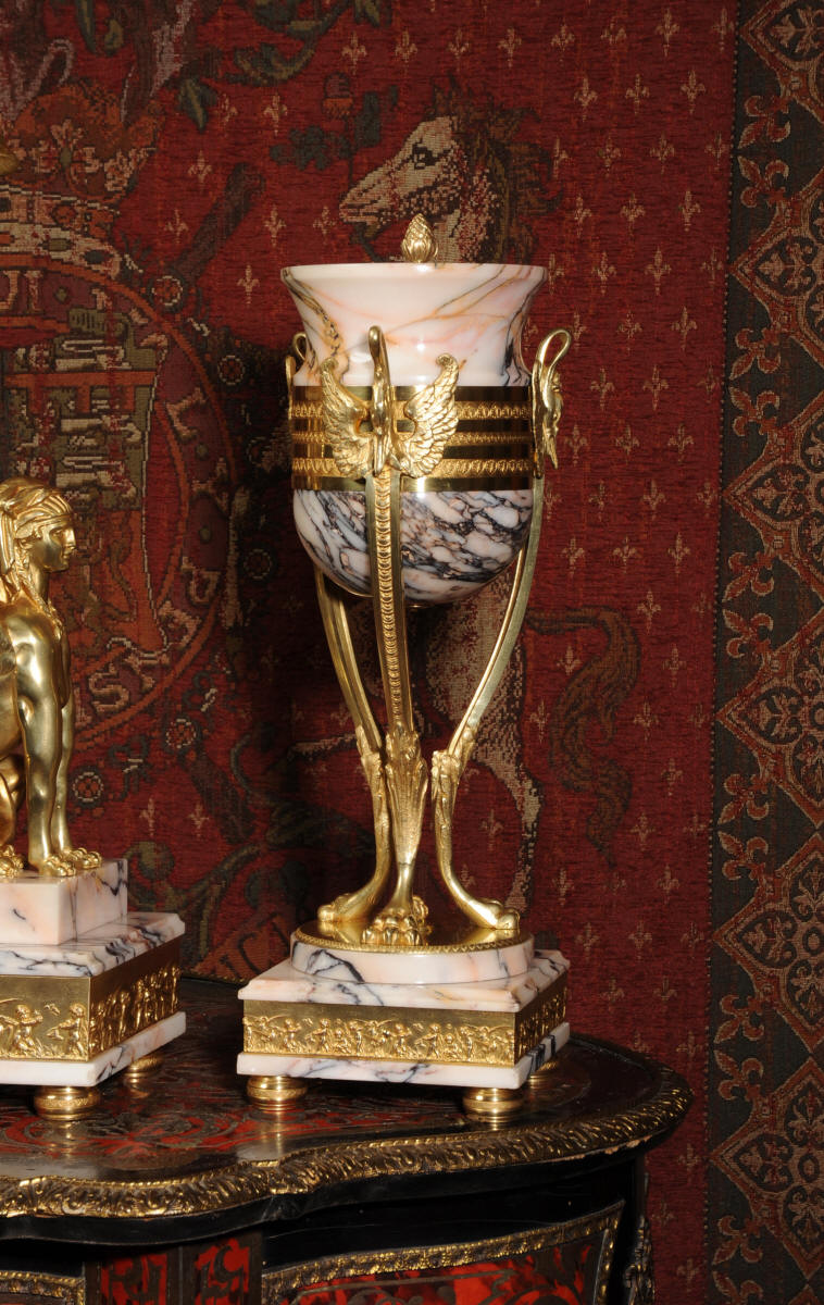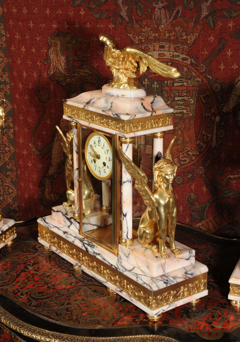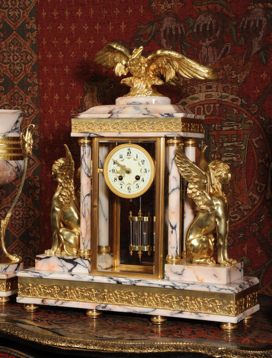 The side urns are equally large and well finished, a large specimen marble 'cup' is held aloft on three elegantly designed legs of ormolu with hairy paw feet and eagle capitals. The dial is cream enamel on copper with delicately painted floral swags between the numerals and finely fretted gilt brass hands.