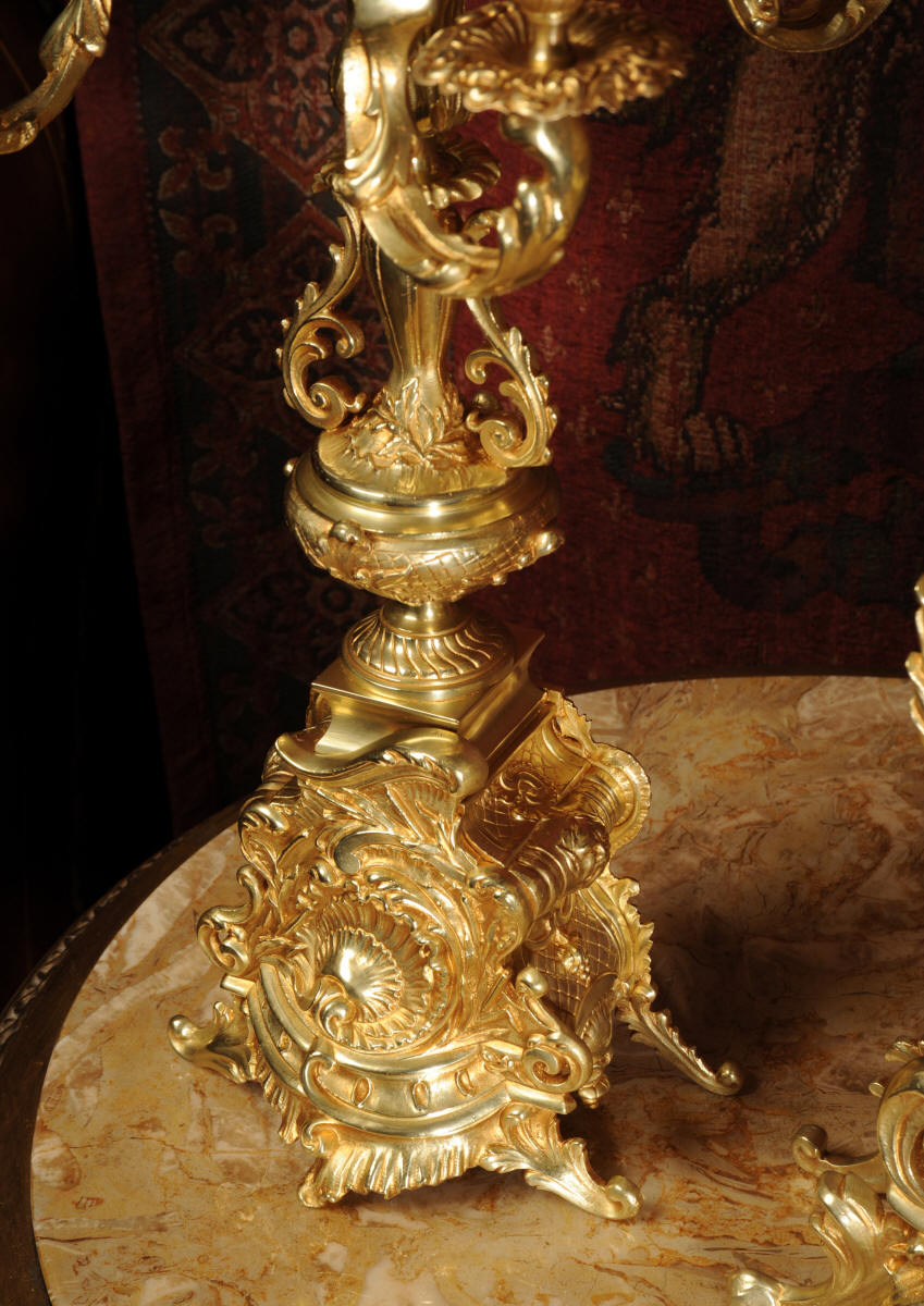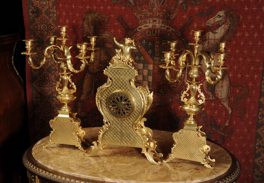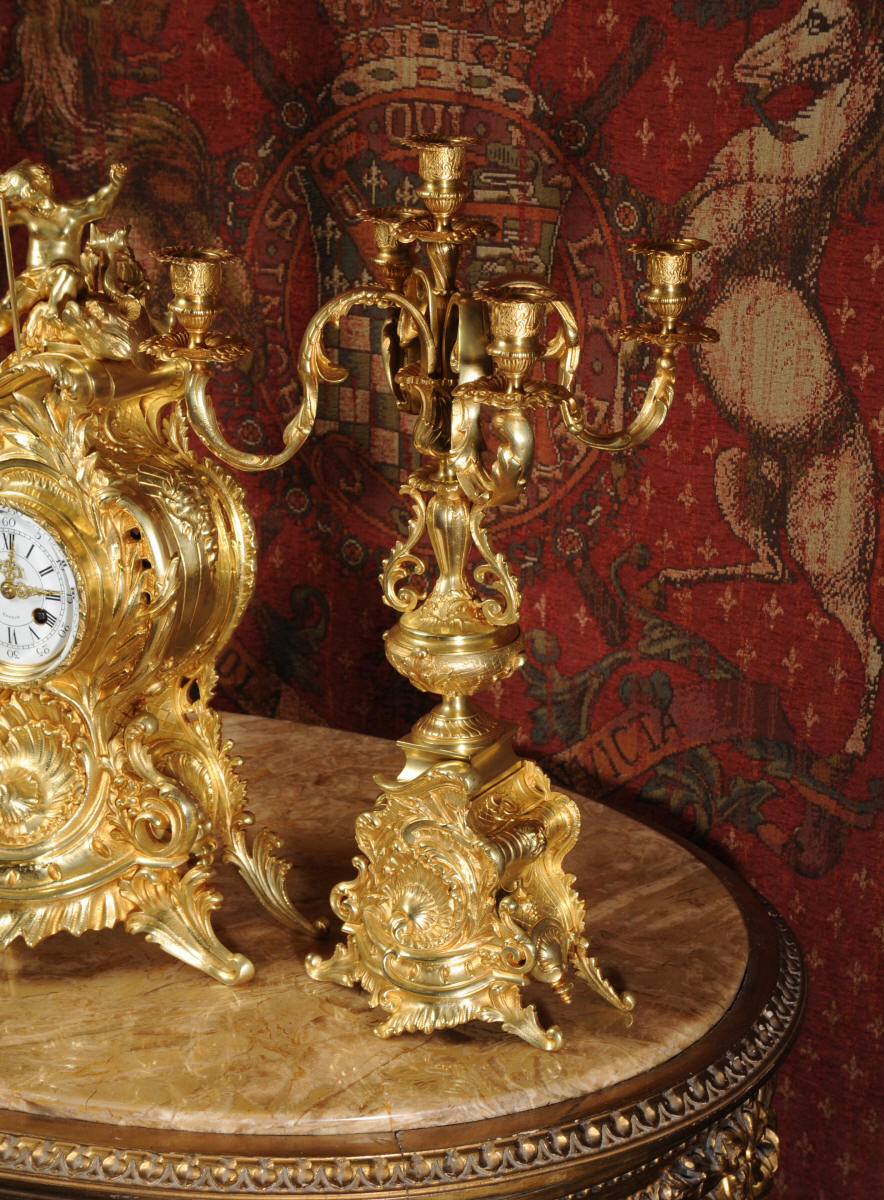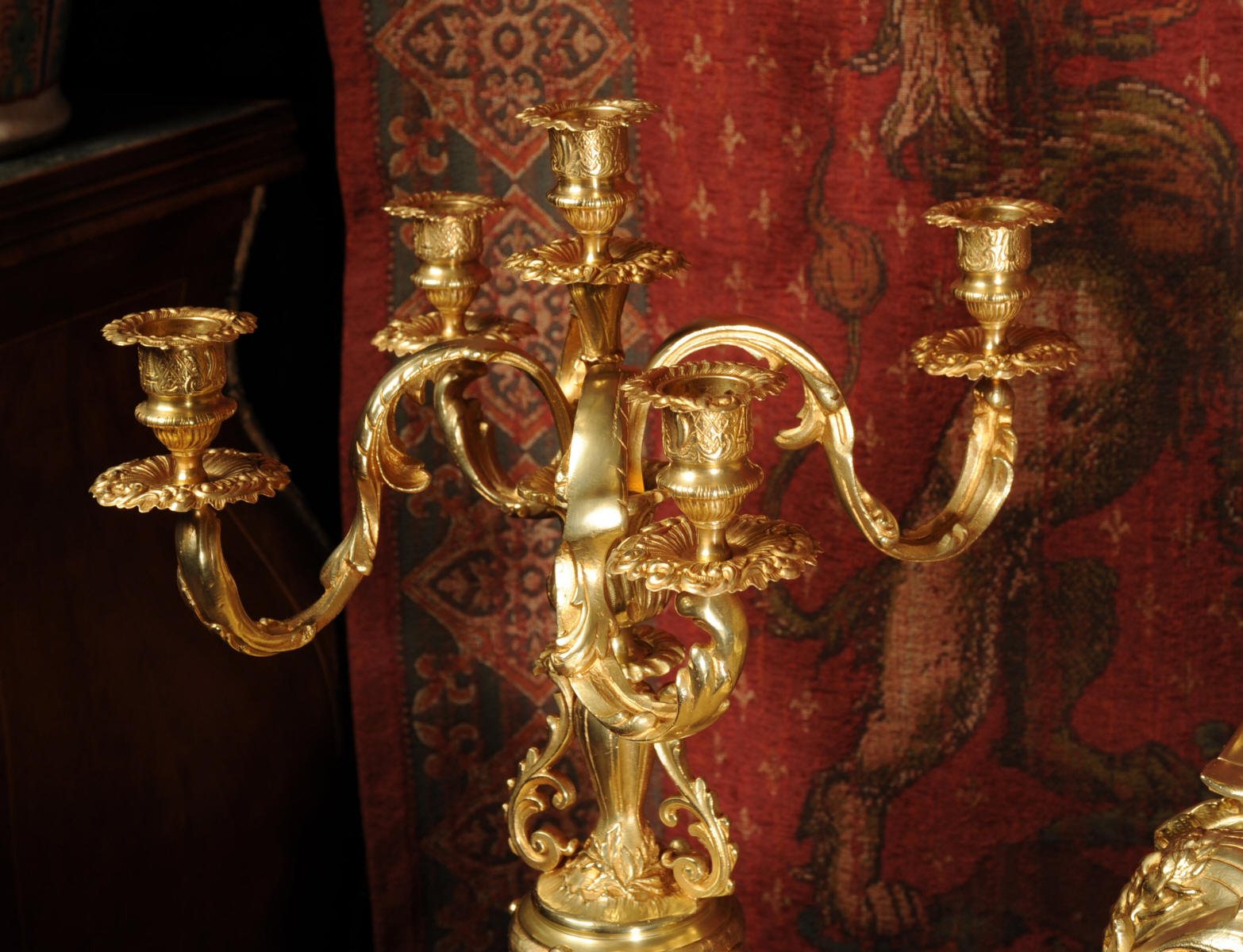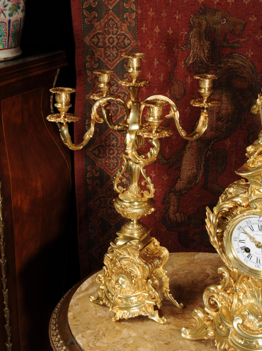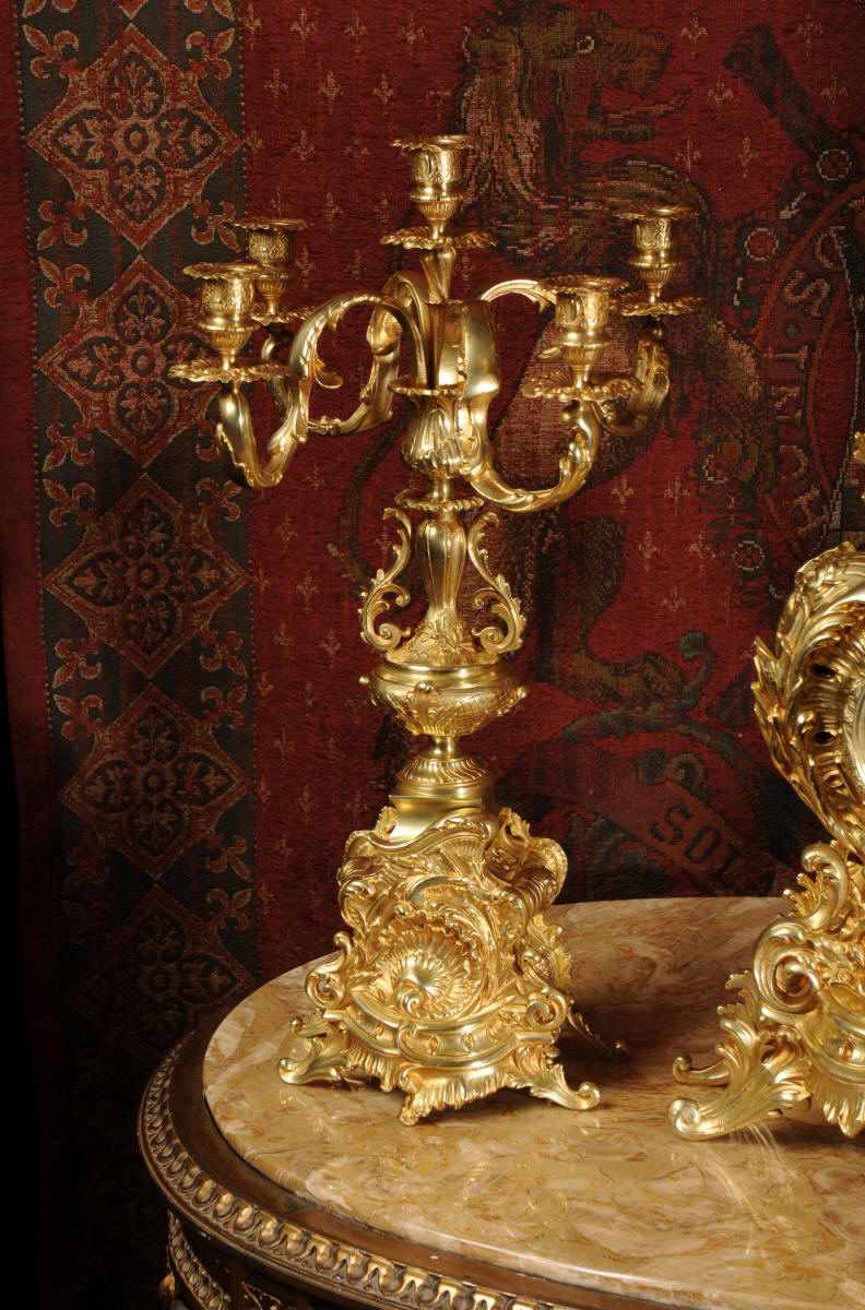 Candelabra have conforming bases, large elaborate urns and boldly scrolling four branches. This is a beautifully made set, crisply modelled and finished. The dial is enamel on copper with a separate minute ring and the retailers signature. It is complete with the original finely fretted gilt brass hands and convex glass.