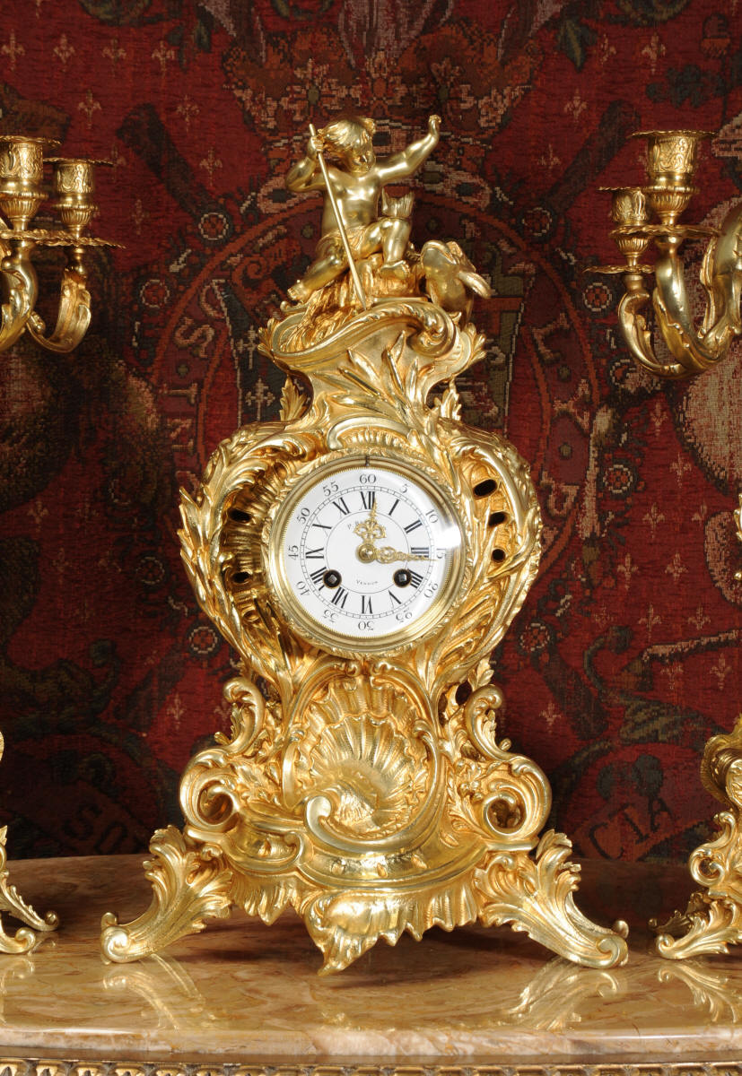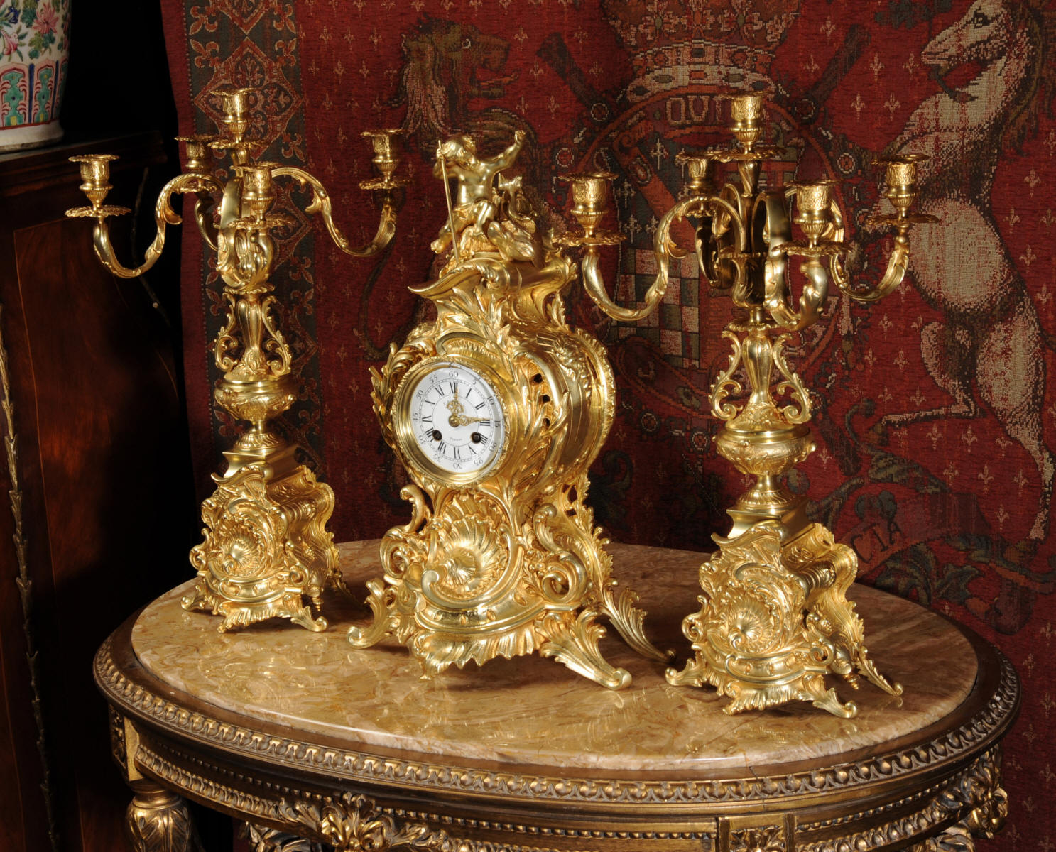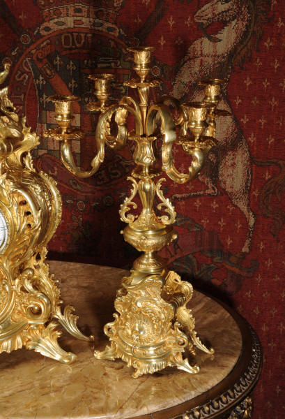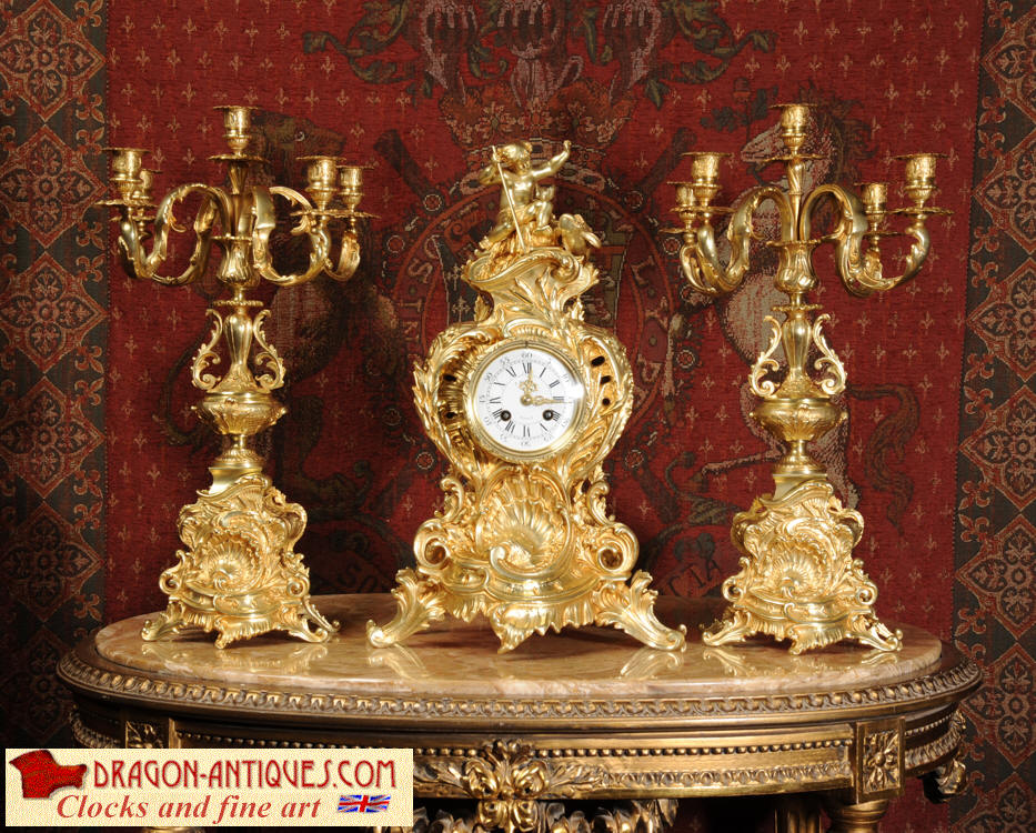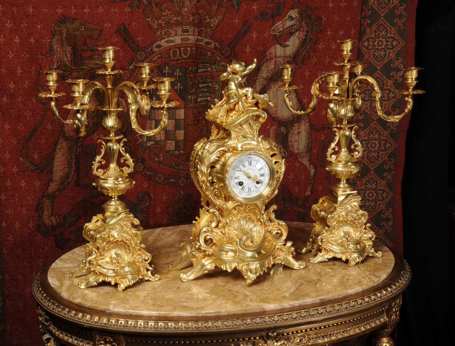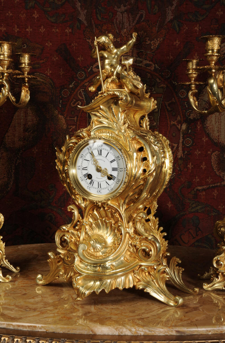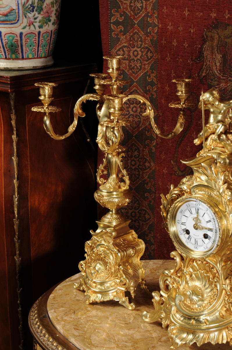 Candelabra have conforming bases, large elaborate urns and boldly scrolling four branches. This is a beautifully made set, crisply modelled and finished. The dial is enamel on copper with a separate minute ring and the retailers signature. It is complete with the original finely fretted gilt brass hands and convex glass.