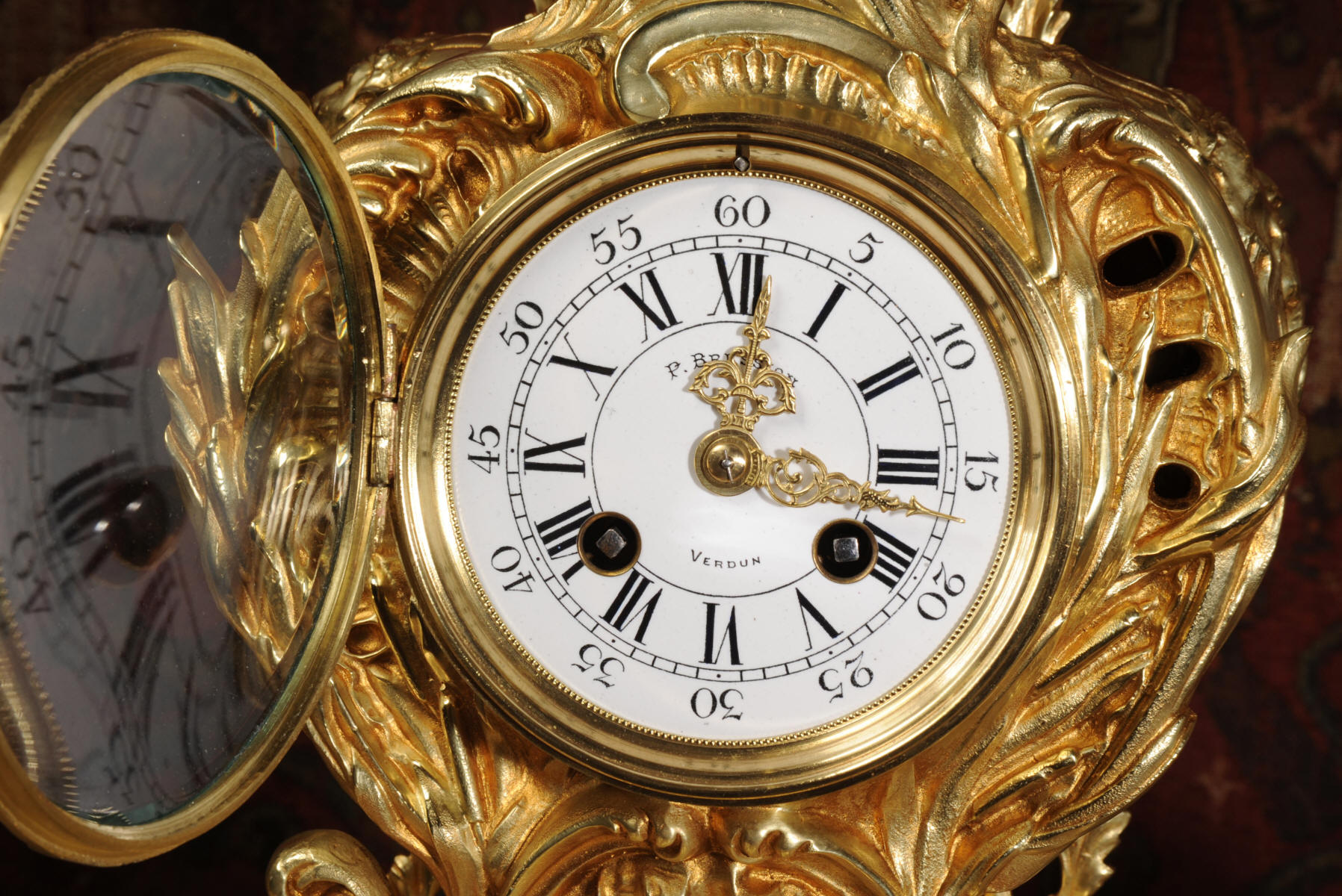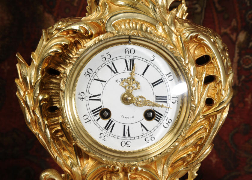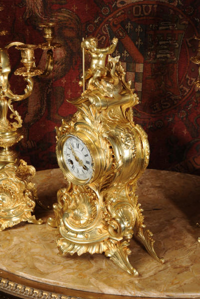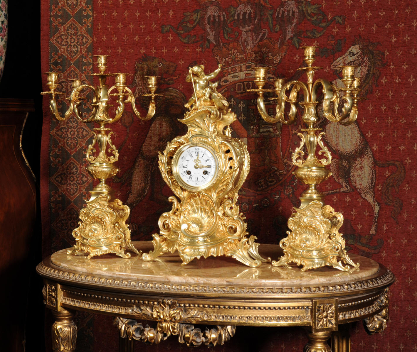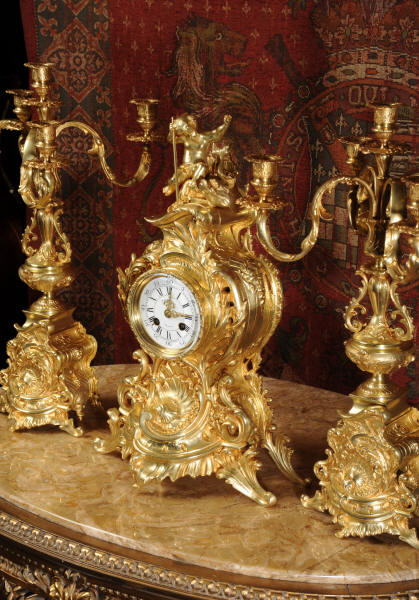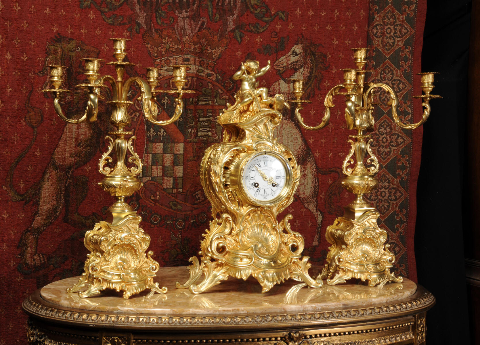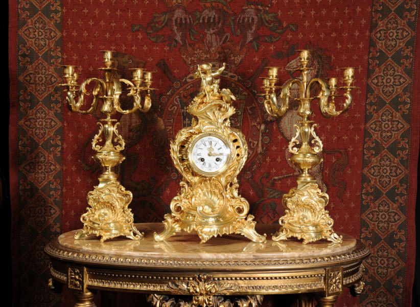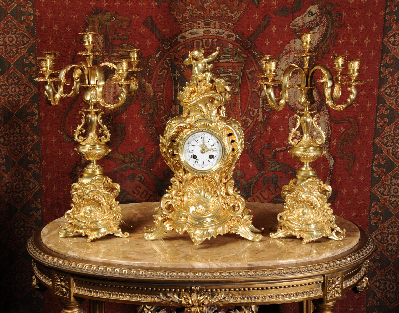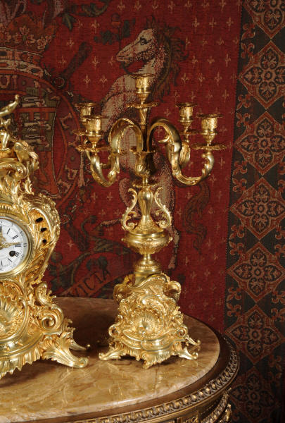 Candelabra have conforming bases, large elaborate urns and boldly scrolling four branches. This is a beautifully made set, crisply modelled and finished. The dial is enamel on copper with a separate minute ring and the retailers signature. It is complete with the original finely fretted gilt brass hands and convex glass.