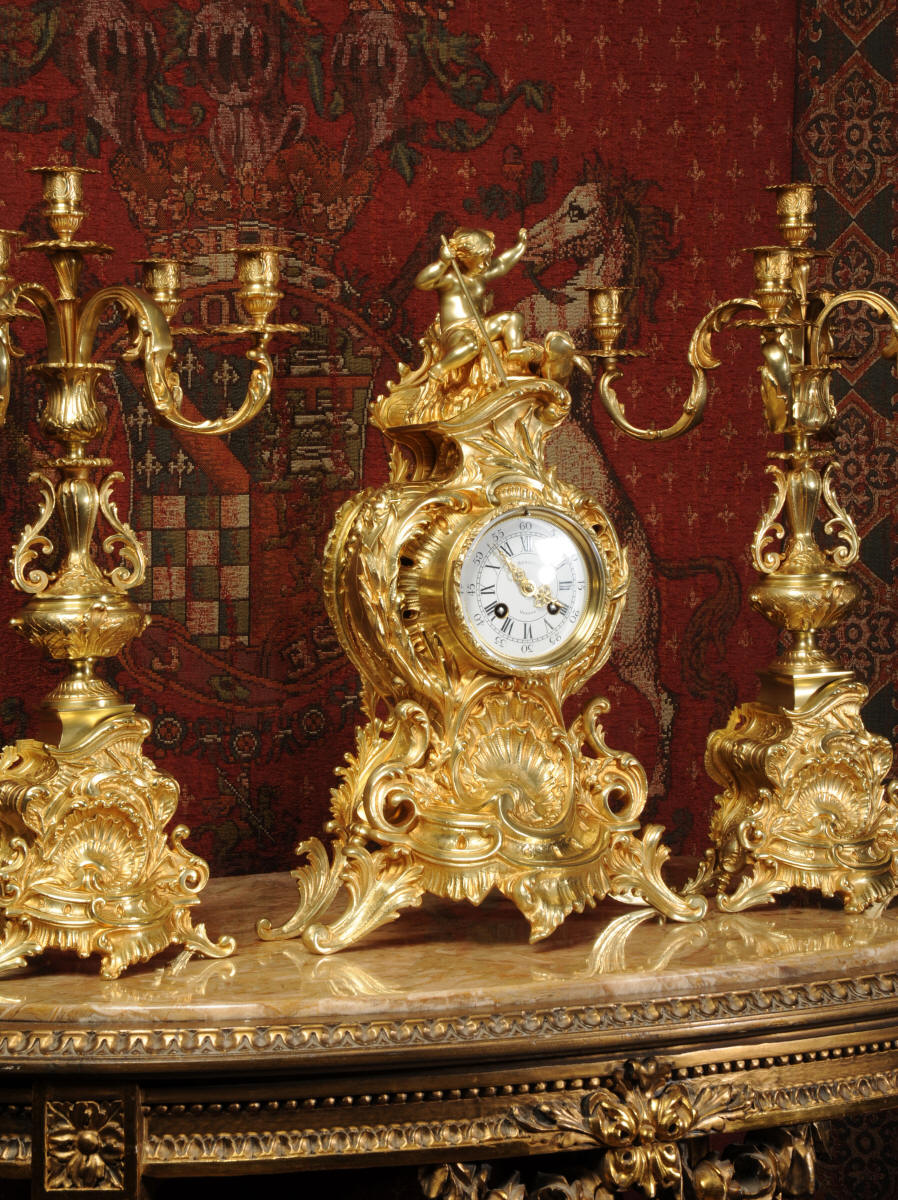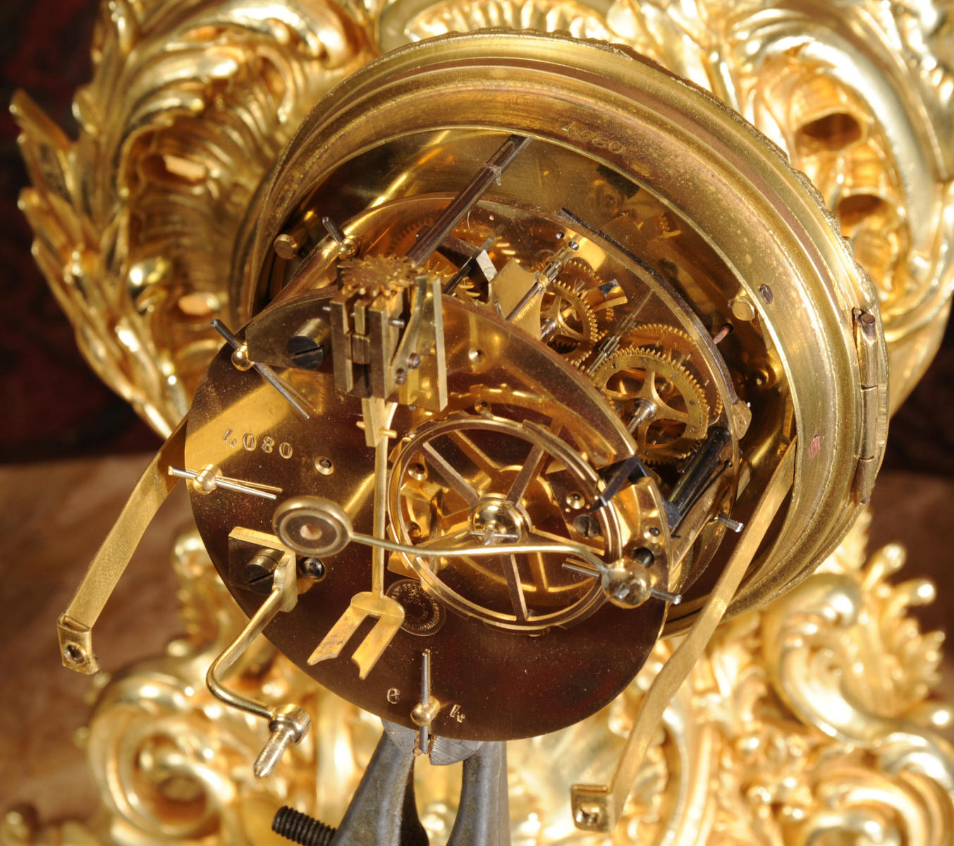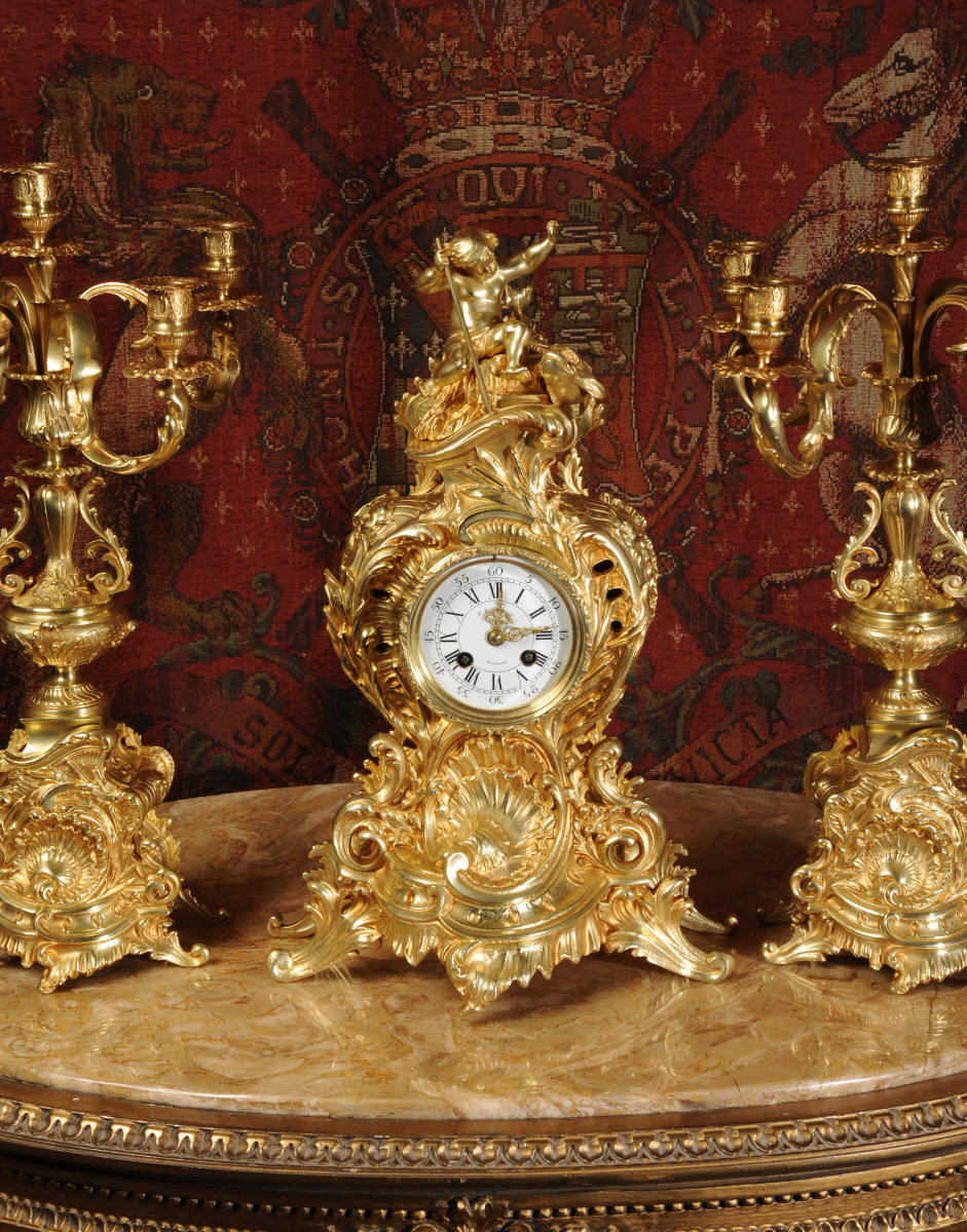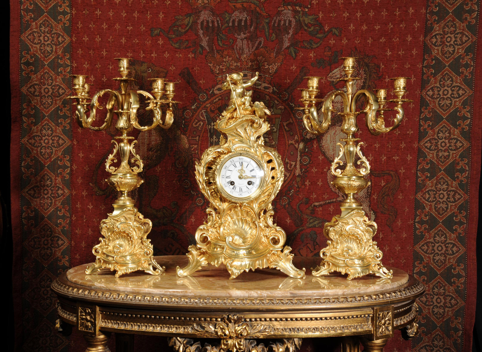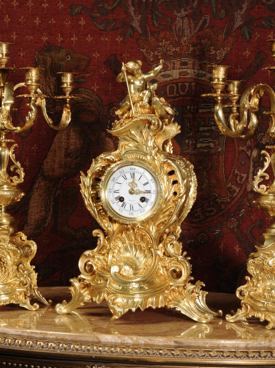 Candelabra have conforming bases, large elaborate urns and boldly scrolling four branches. This is a beautifully made set, crisply modelled and finished. The dial is enamel on copper with a separate minute ring and the retailers signature. It is complete with the original finely fretted gilt brass hands and convex glass.