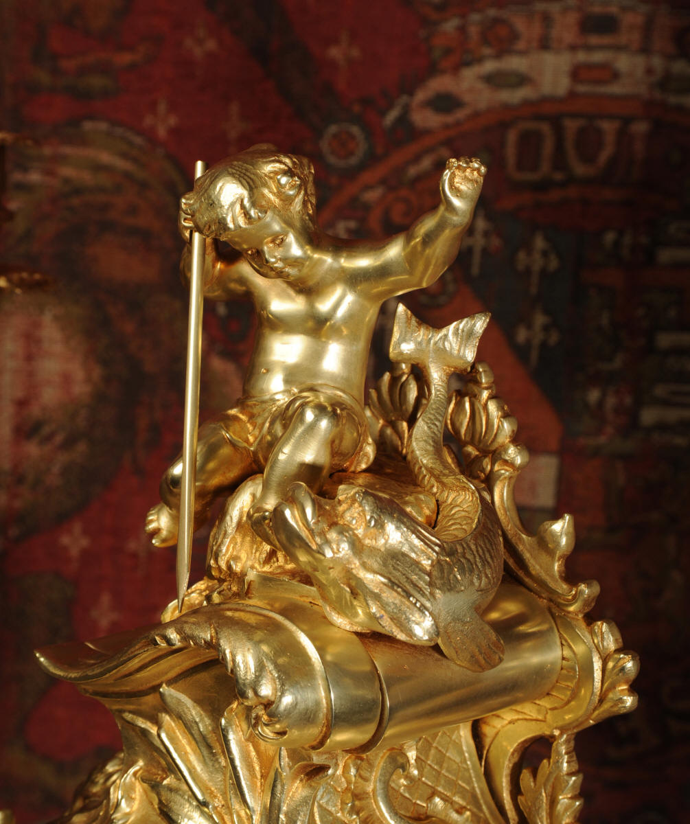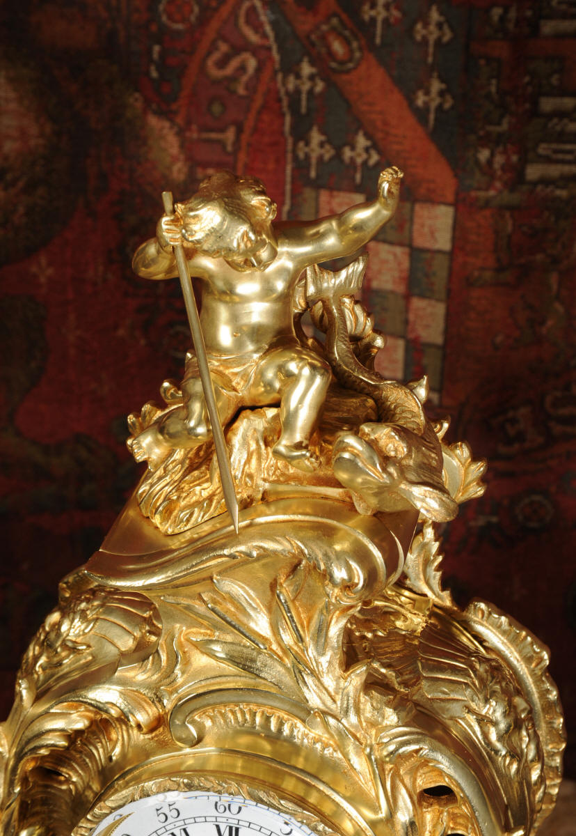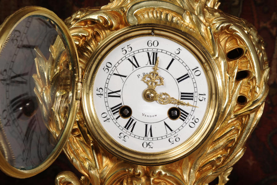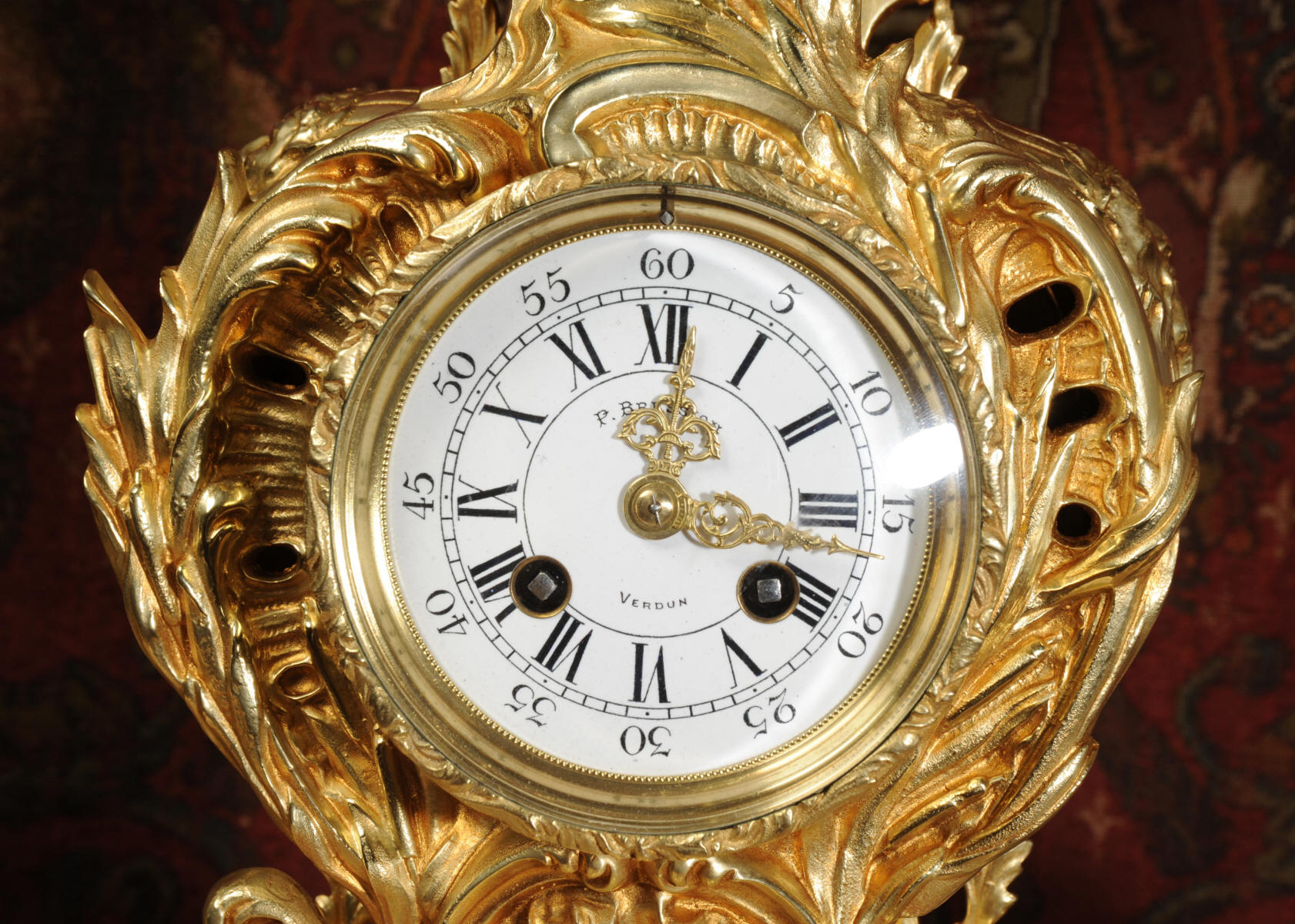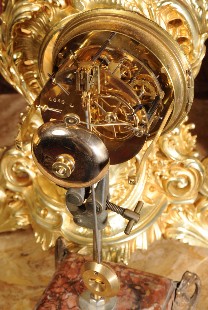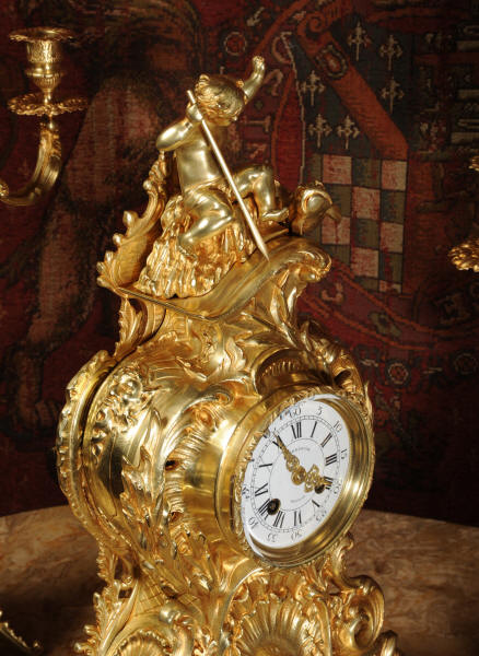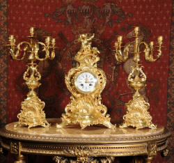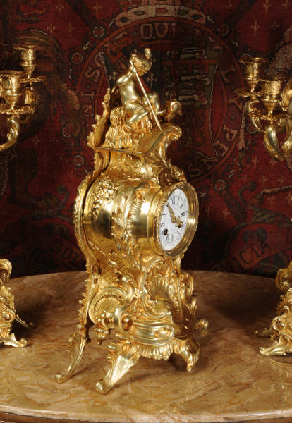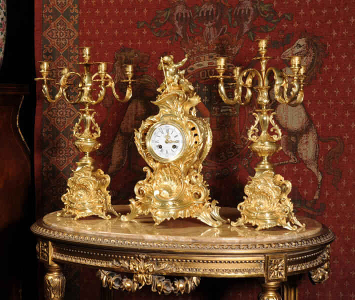 Candelabra have conforming bases, large elaborate urns and boldly scrolling four branches. This is a beautifully made set, crisply modelled and finished. The dial is enamel on copper with a separate minute ring and the retailers signature. It is complete with the original finely fretted gilt brass hands and convex glass.