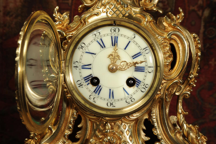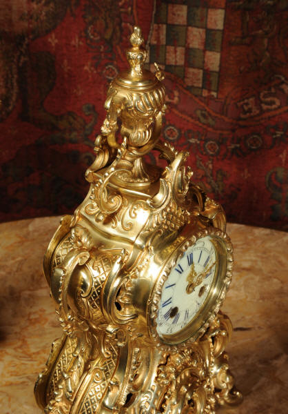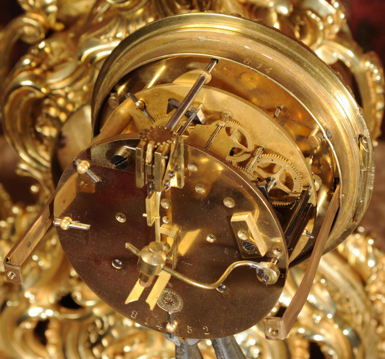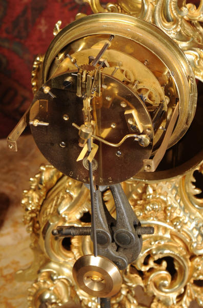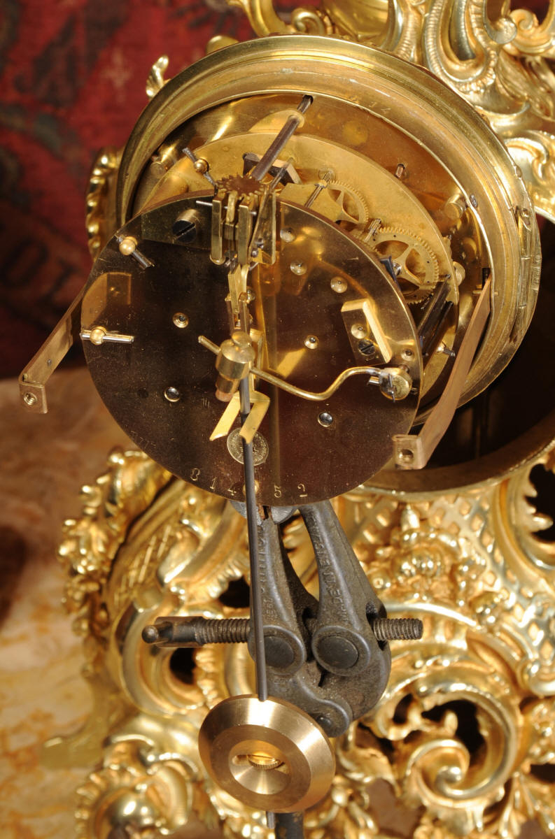 The French movement is by Japy Freres and has the makers mark on the movement backplate. It is of high quality and is in excellent clean and running condition having been fully overhauled by our clockmaker. Pendulum is a replacement. It runs for 8 days and strikes the hours and halves on a sonorous gong. Gong striking is very unusual in this type and style of clock. Click the video clip below to hear the gong and watch the clock running!