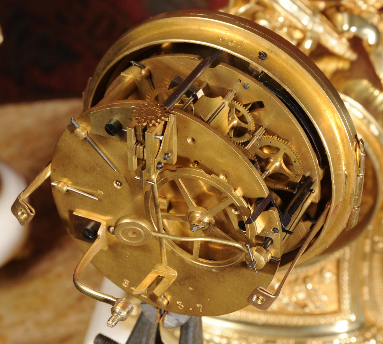 The French movement is of high quality and is in excellent clean and running condition having been fully overhauled by our clockmaker. Pendulum is original. It runs for 8 days and strikes the hours and halves on a bell. Click the video clip below to hear the bell and watch the clock running!
