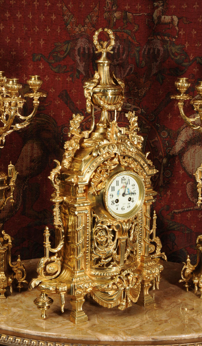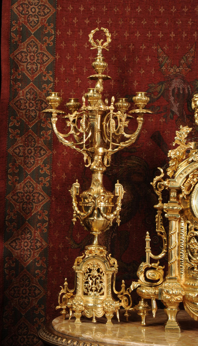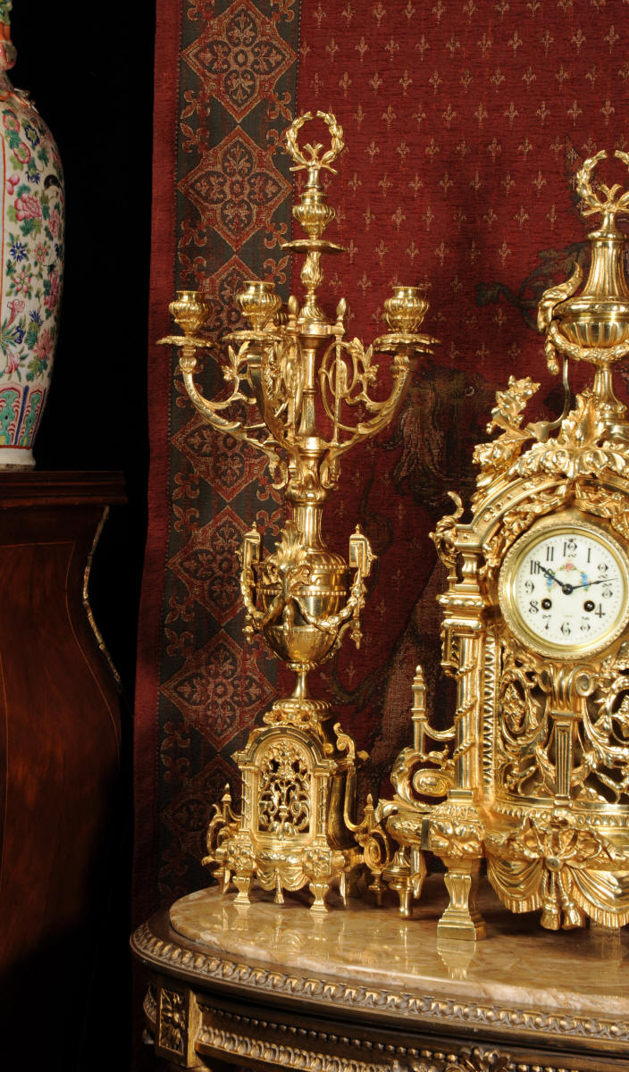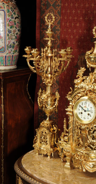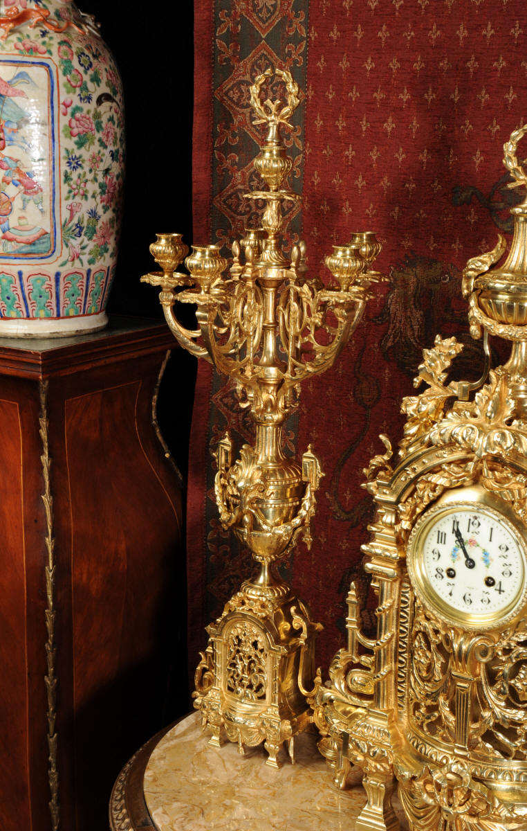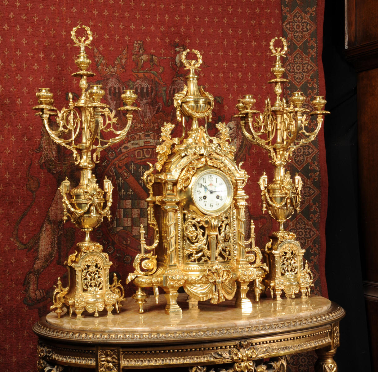 Condition of the case is excellent, the original gilding is beautifully clean and bright with hardly any wear or discolouration and there are no losses. The dial is also in excellent condition with no chips or scratches, there is a rubbed retailers mark on the dial also. Candelabra are slightly distorted. The set makes a stunning display as you can see below.