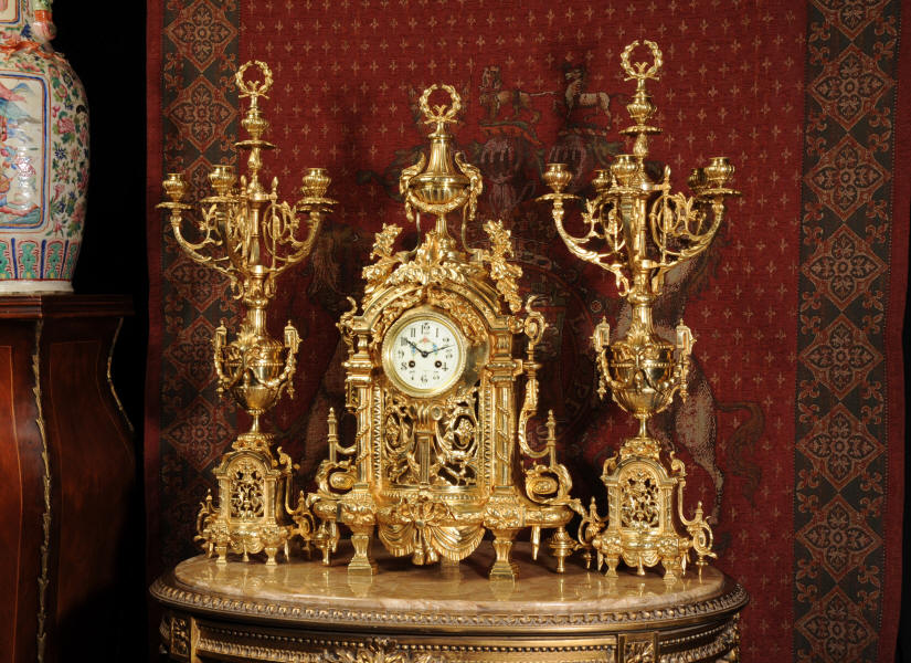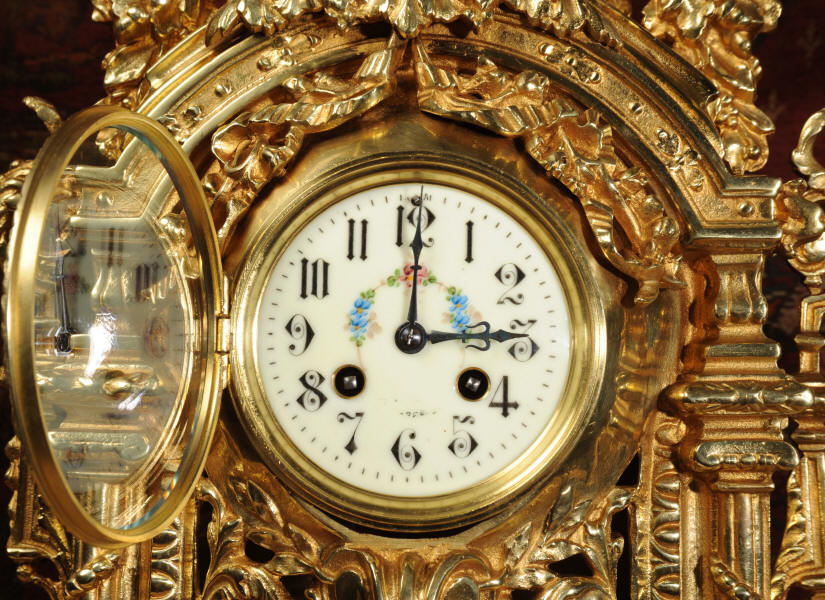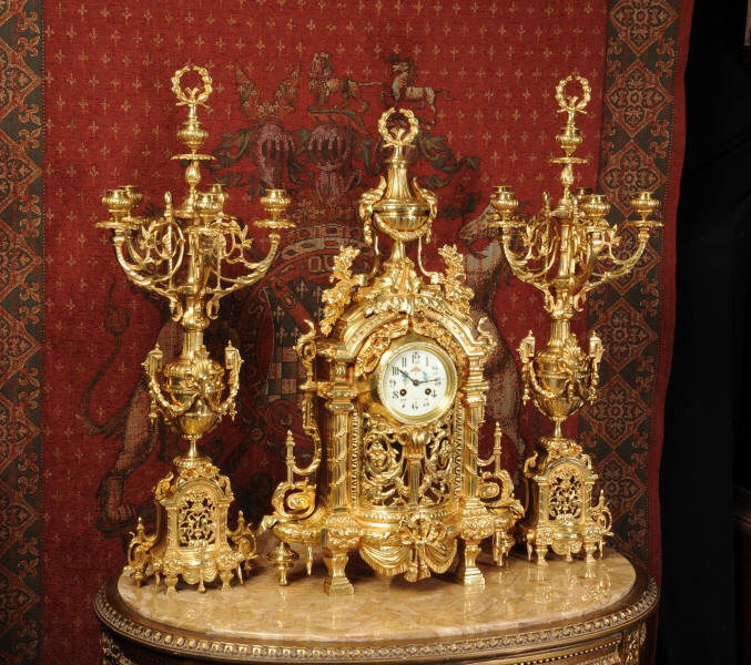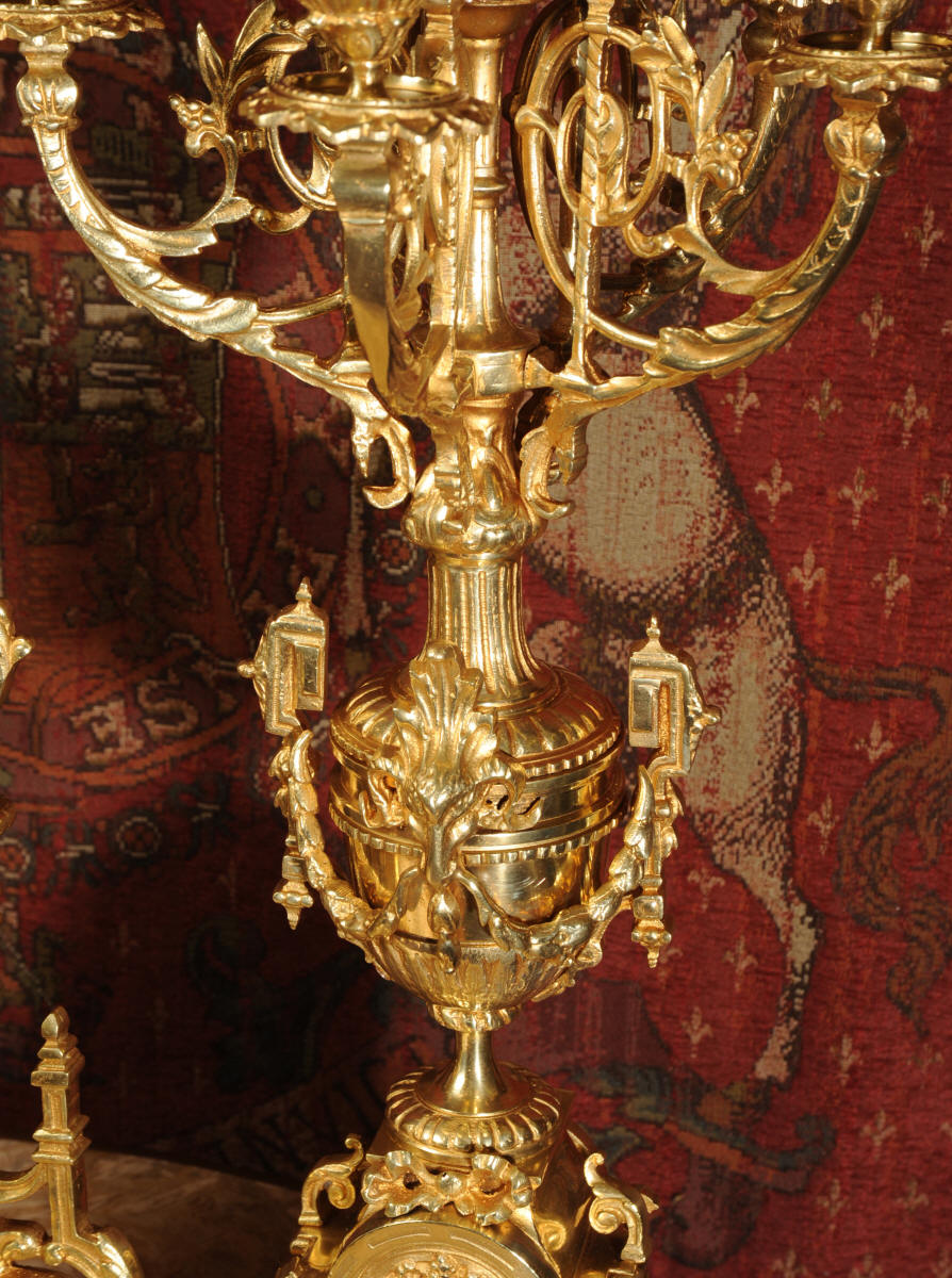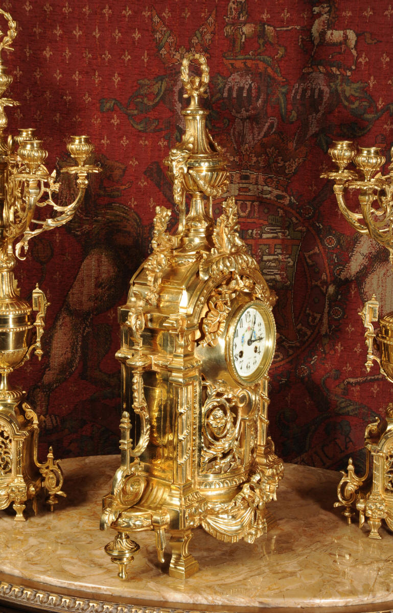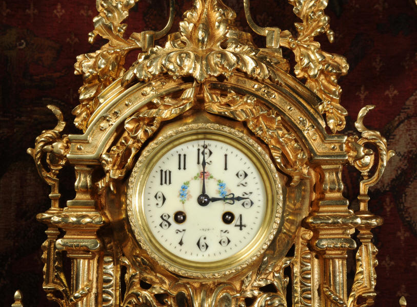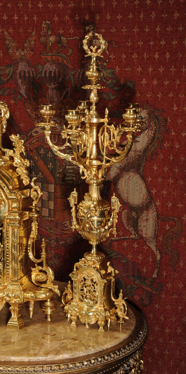 Condition of the case is excellent, the original gilding is beautifully clean and bright with hardly any wear or discolouration and there are no losses. The dial is also in excellent condition with no chips or scratches, there is a rubbed retailers mark on the dial also. Candelabra are slightly distorted. The set makes a stunning display as you can see below.