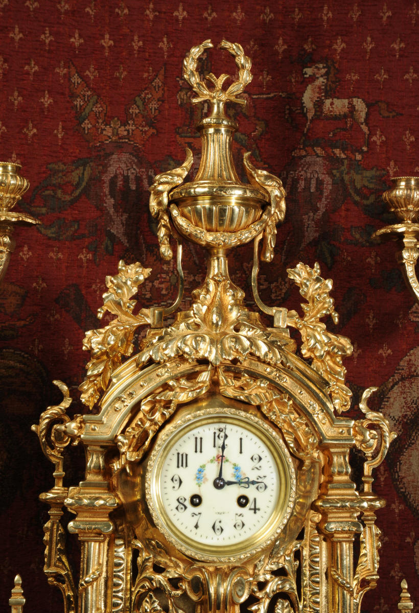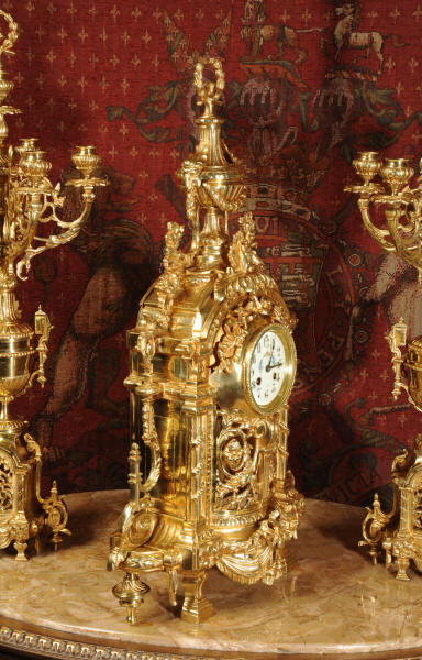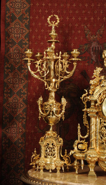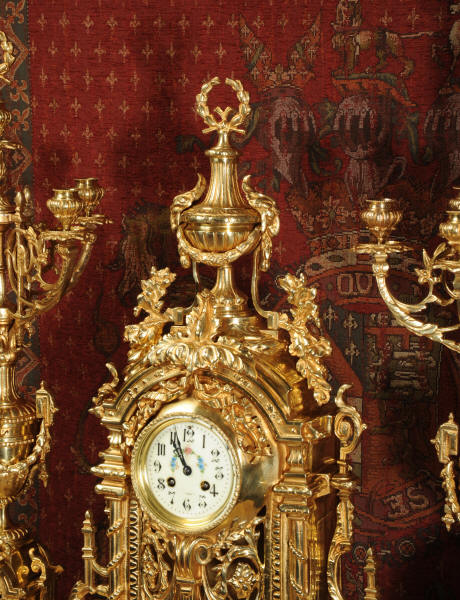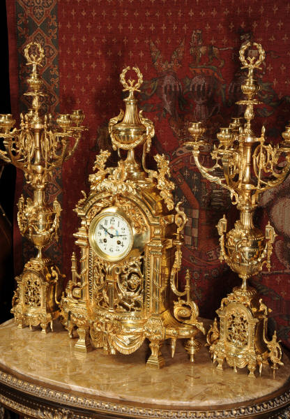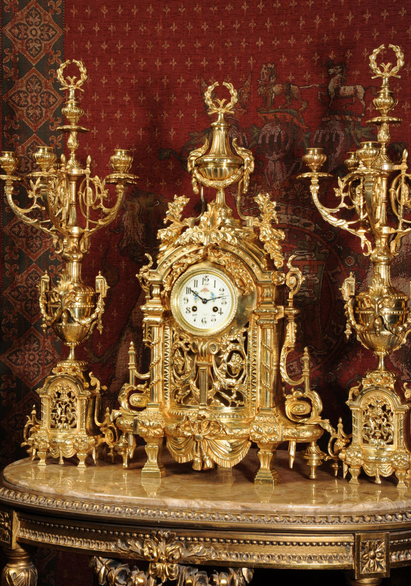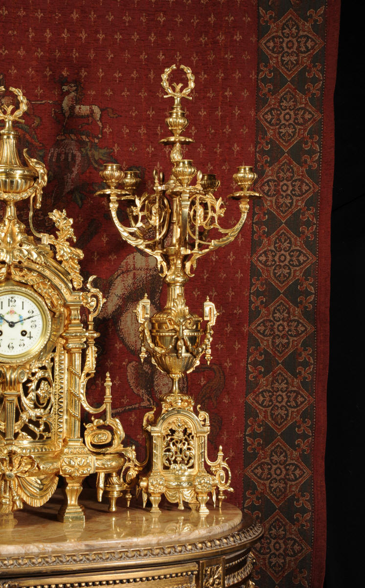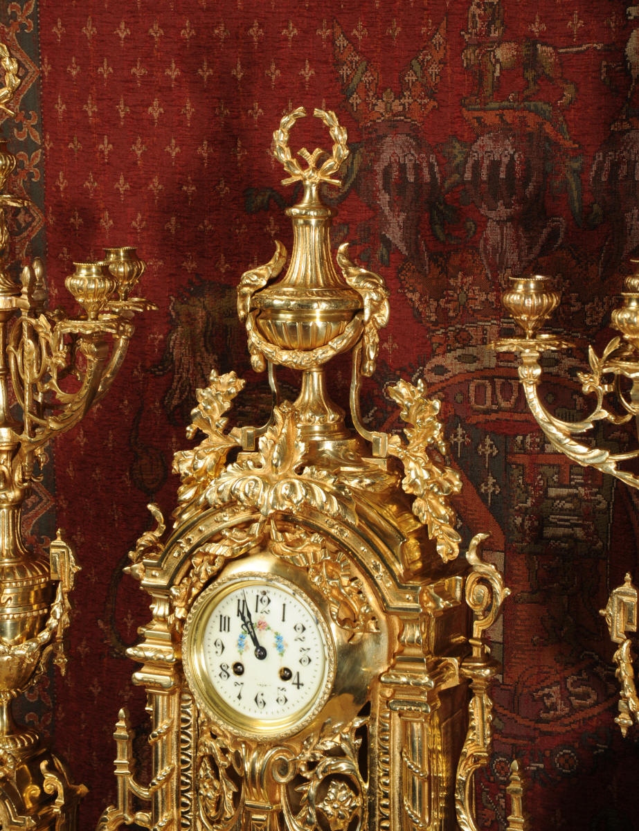 Condition of the case is excellent, the original gilding is beautifully clean and bright with hardly any wear or discolouration and there are no losses. The dial is also in excellent condition with no chips or scratches, there is a rubbed retailers mark on the dial also. Candelabra are slightly distorted. The set makes a stunning display as you can see below.