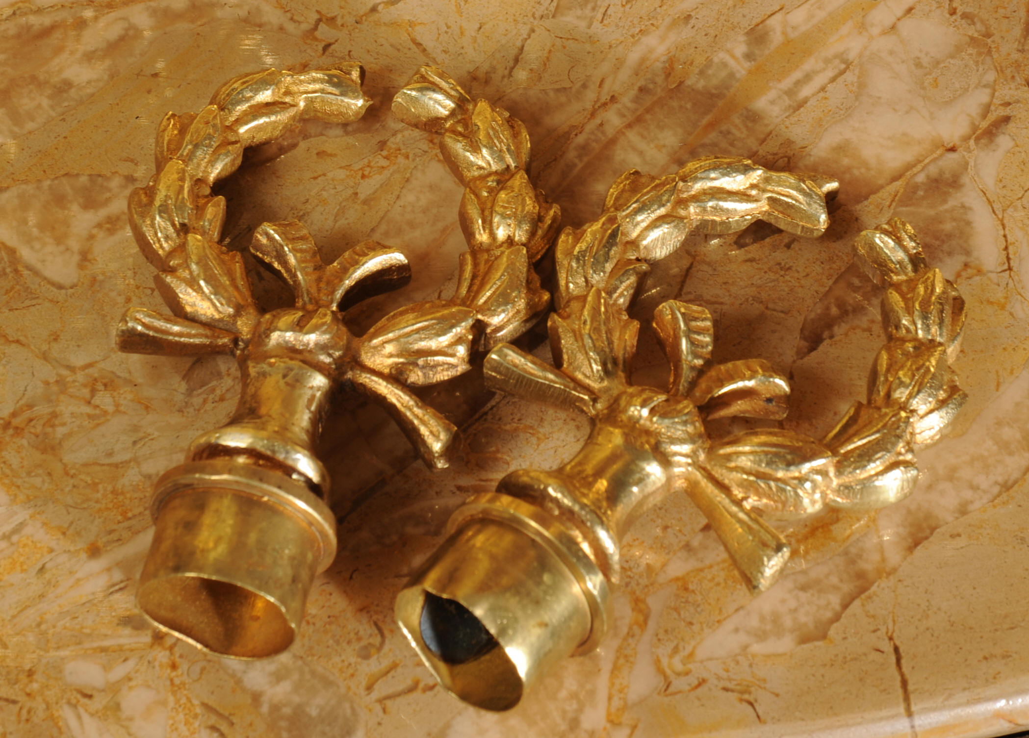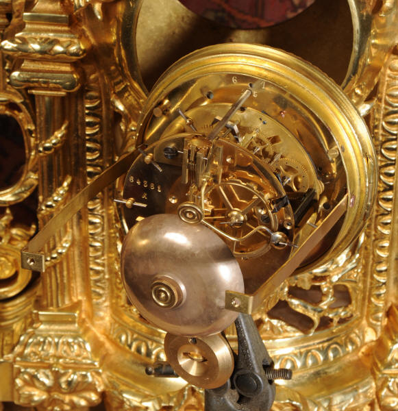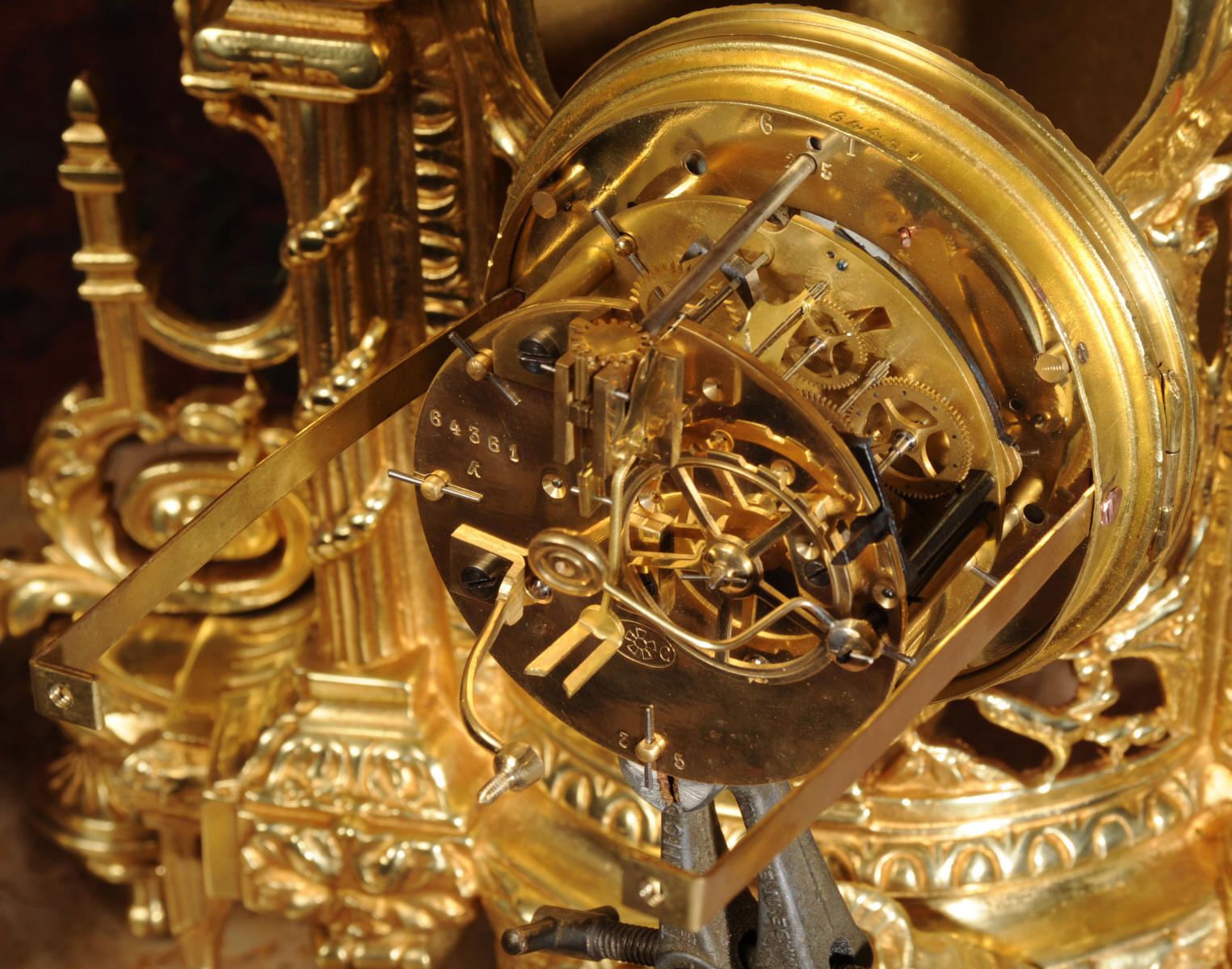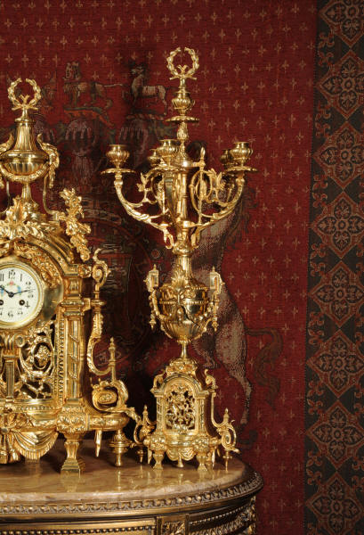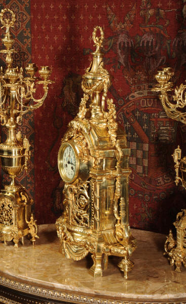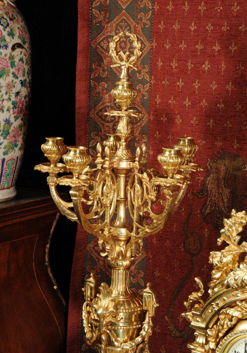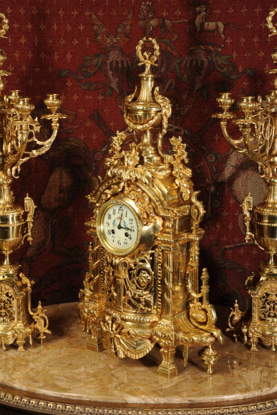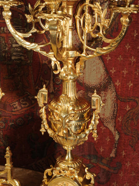 Condition of the case is excellent, the original gilding is beautifully clean and bright with hardly any wear or discolouration and there are no losses. The dial is also in excellent condition with no chips or scratches, there is a rubbed retailers mark on the dial also. Candelabra are slightly distorted. The set makes a stunning display as you can see below.
